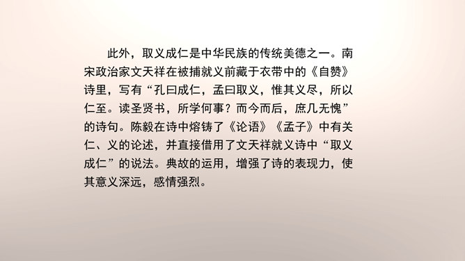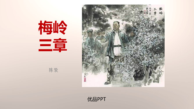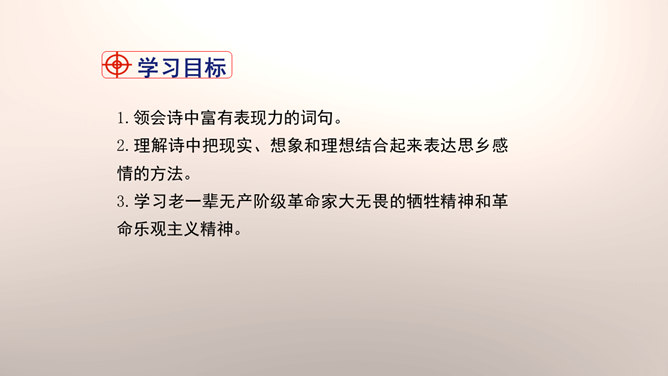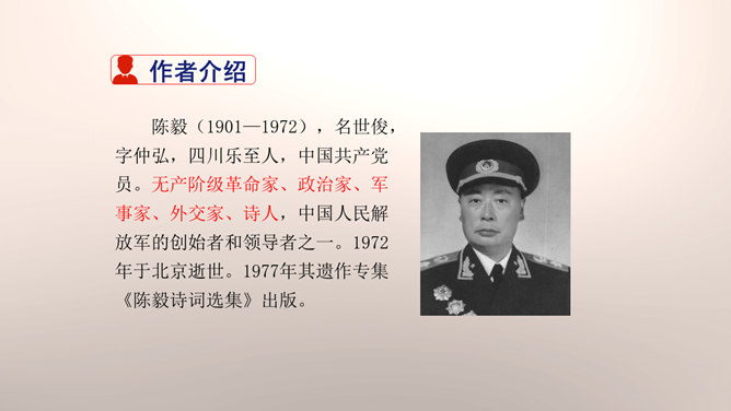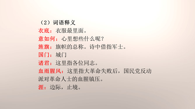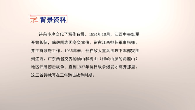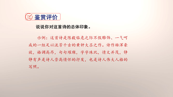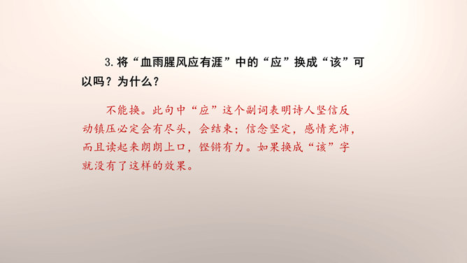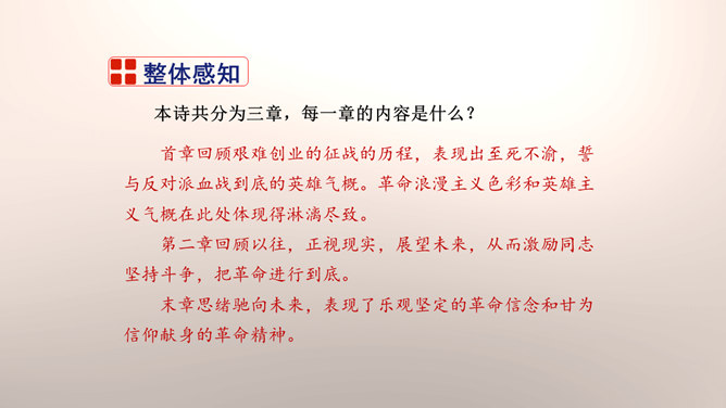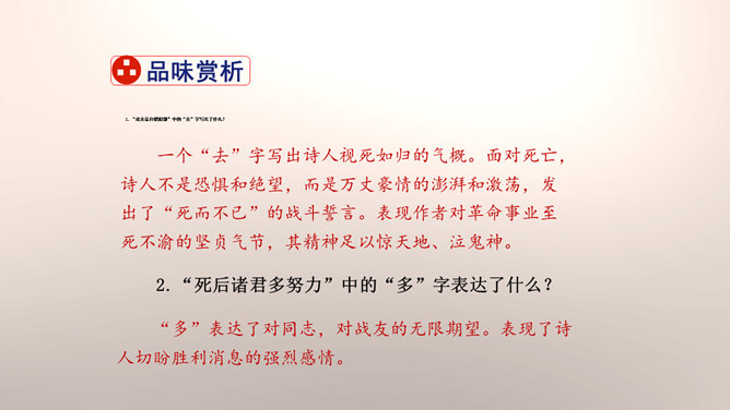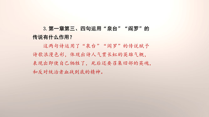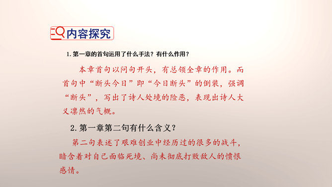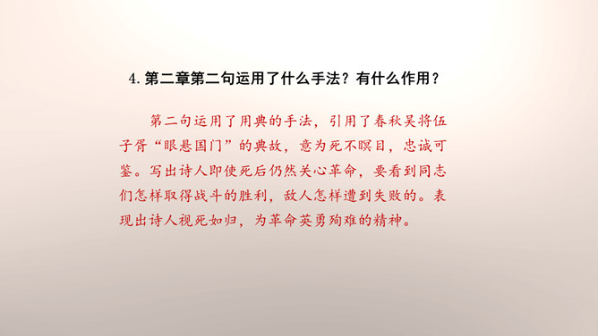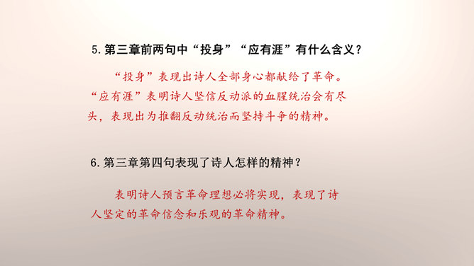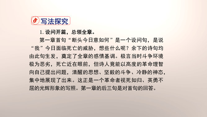 1.设问开篇,总领全章。第一章首句“断头今日意如何”是一个设问句,是说“我”今日面临死亡的威胁,想些什么呢?余下的诗句均由此句生发,奠定了全章的感情基调。极言当时斗争环境极为恶劣,死亡近在眼前,但诗人竟能以高度的革命理智向自己提出问题,清醒的思想、坚毅的斗争、冷静的神态,集中地展现了出来。这正是一个革命者视死如归、英勇不屈的光辉形象的写照。第一章的后三句是对首句的回答。2.引经据典,意义深远。诗中提到的泉台、阎罗、烧纸钱等,本都是封建迷信中的传说和行为。所属专题:梅岭三章ppt。