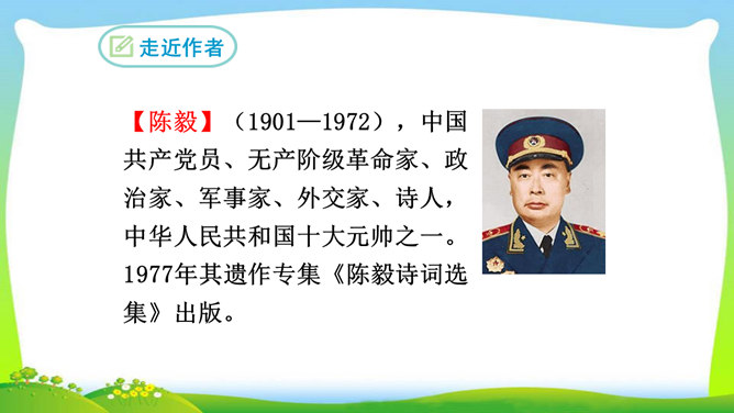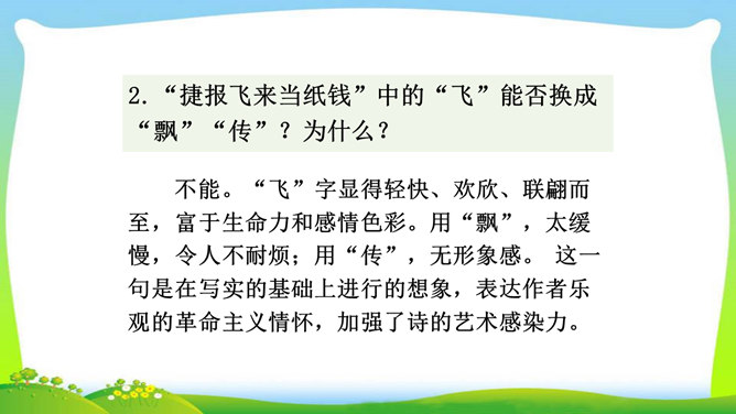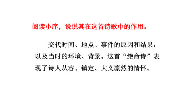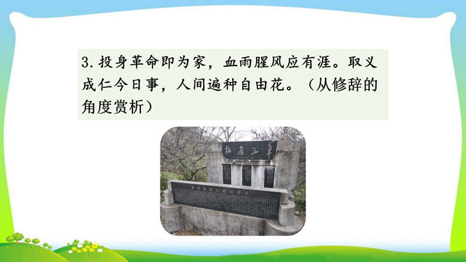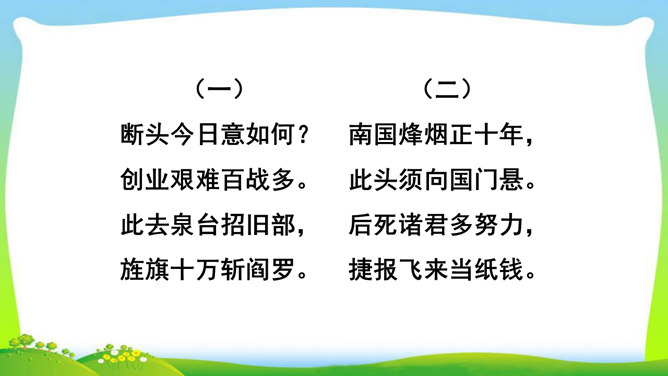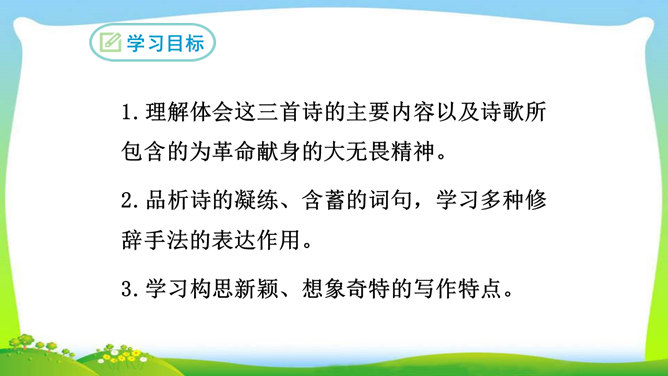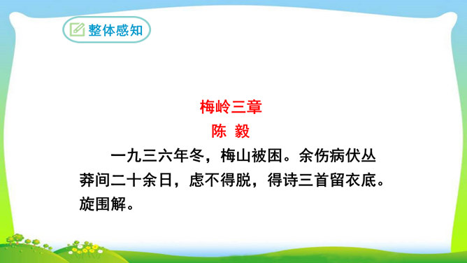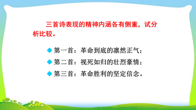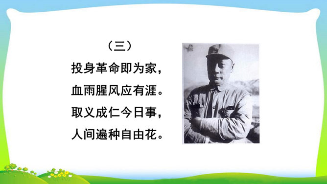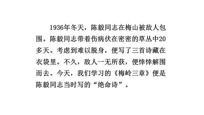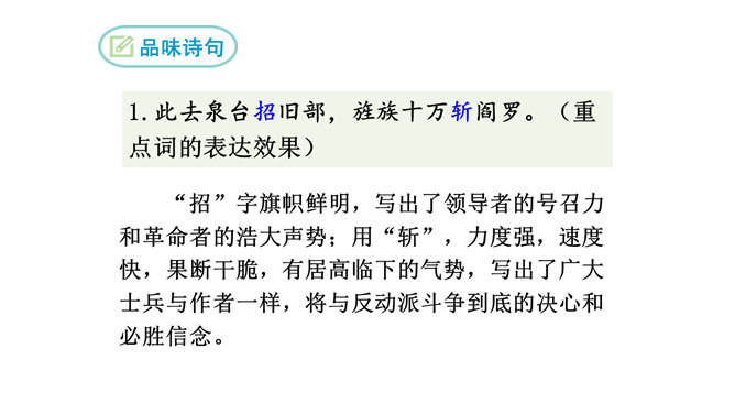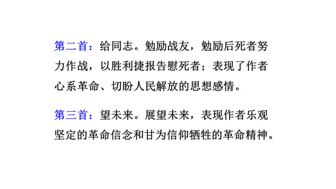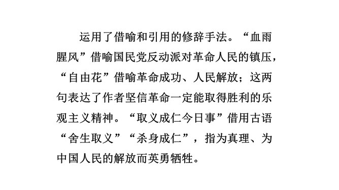 想象、理想相结合充分表达了诗人的无产阶级革命家的伟大气魄。如第一首中一、二句写了创业艰难的现实。三、四句便借助想象,用“去泉台”“招旧部”“斩阎罗”抒发豪迈的革命胸襟。第二首、第三首想象“捷报飞来当纸钱”“人间遍种自由花”,都是在写实的基础上进行的浪漫主义的写法,表达作者强烈的思想感情,加强了诗的艺术感染力。借代和引用。如第三首多次用了借代和引用的修辞手法。“阎罗”是旧时所说的地狱之王,作者引用来比作人间的反动统治者。又如“旌旗”,原是旗帜的通称,这里借来指代军队或武装力量。所属专题:梅岭三章ppt。