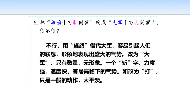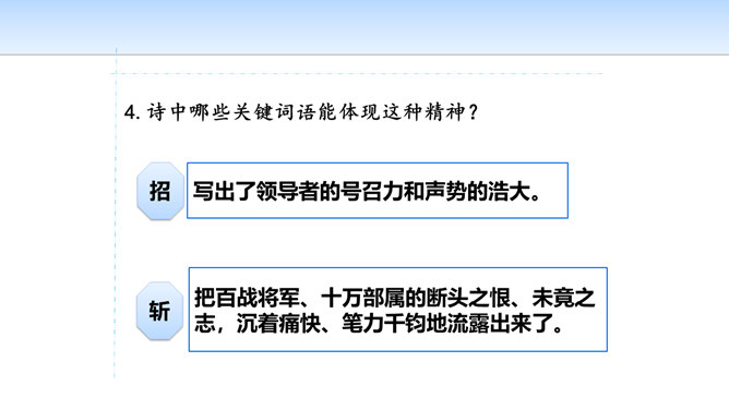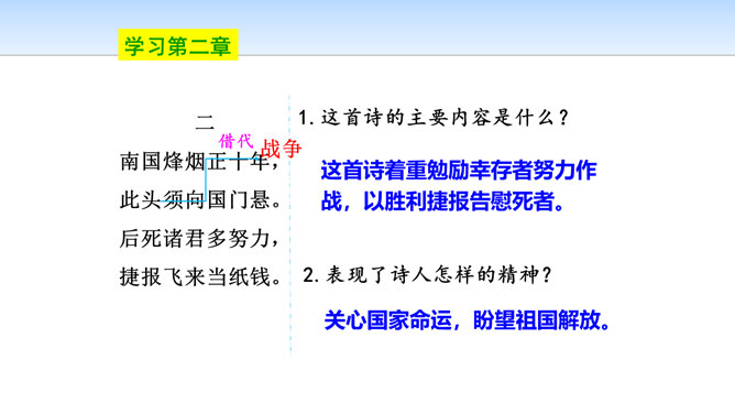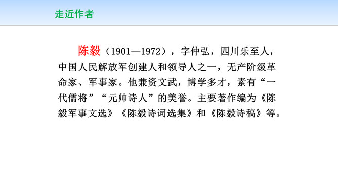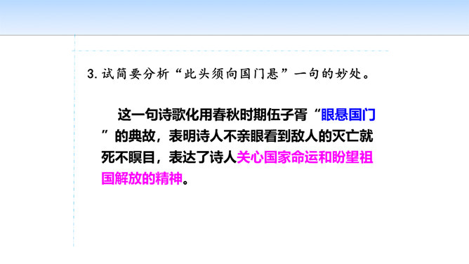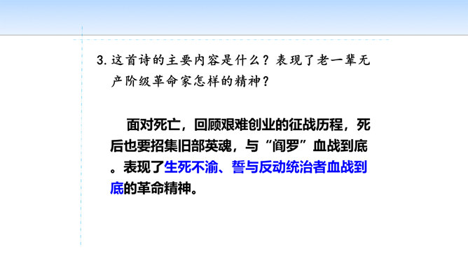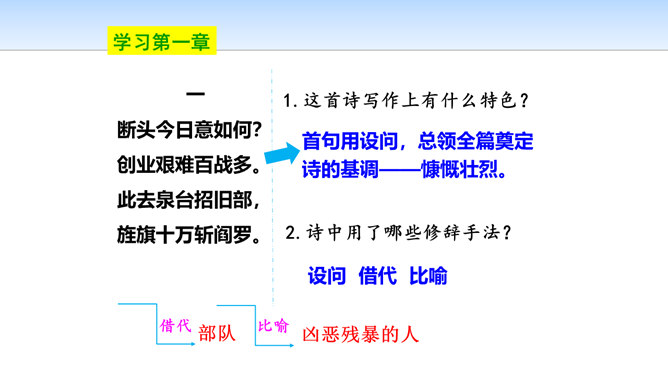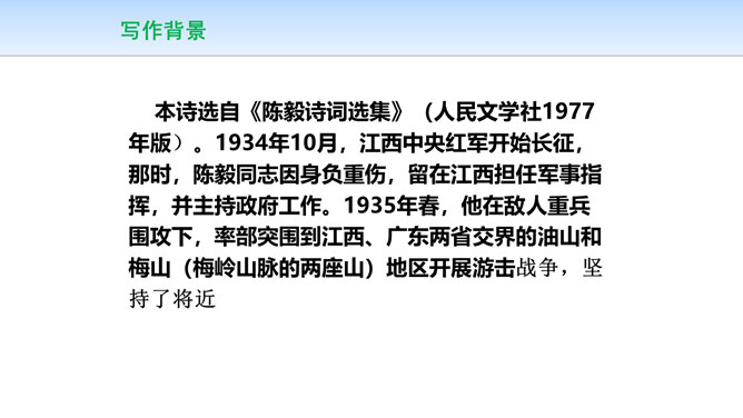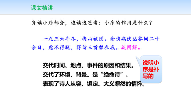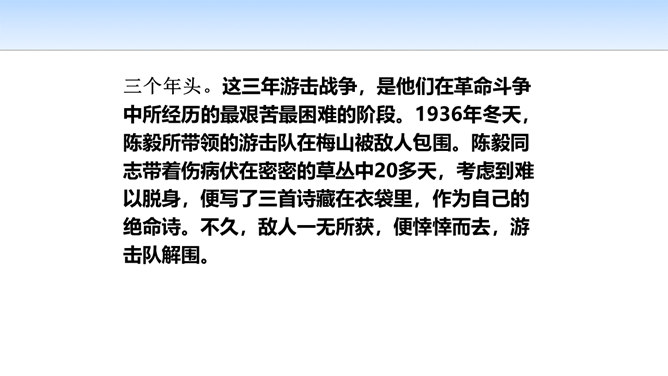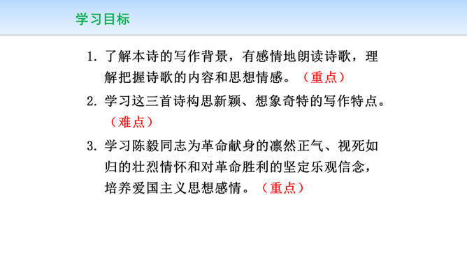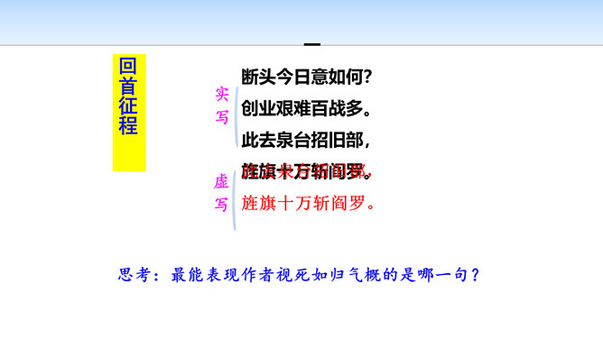 三首诗围绕“断头”构思,扣住“意如何”铺开,然后依时间顺序从“追怀往昔”“面对当日”“展望未来”三个角度回答首句问题,从眼前写到未来,从个人写到同志,层层深化,寥寥八十四字,就塑造了一个坚强的无产阶级革命家的形象。第一首起于现在时间,面对当时必死险境,抒发死后还要继续战斗,虽死不渝的强烈感情;第二首起于回首十年革命战争,再面对当时必死险境,抒发死不瞑目,激励后死同志英勇战斗的强烈感情;第三首,追溯参加革命之时即为推翻反动统治而战斗,再面对当时必死险境,表达革命理想必将实现的坚定革命信念和乐观革命精神。所属专题:梅岭三章ppt。