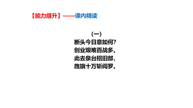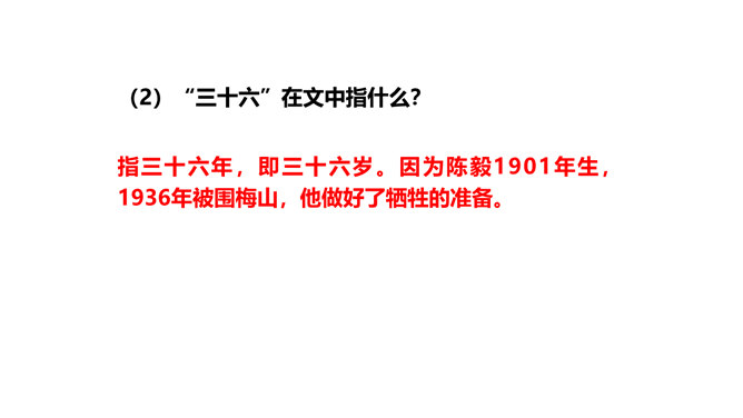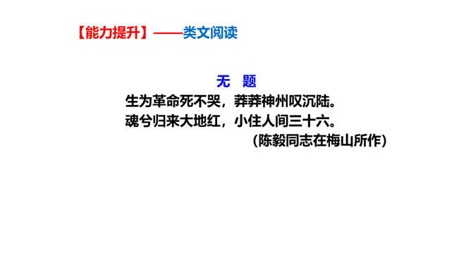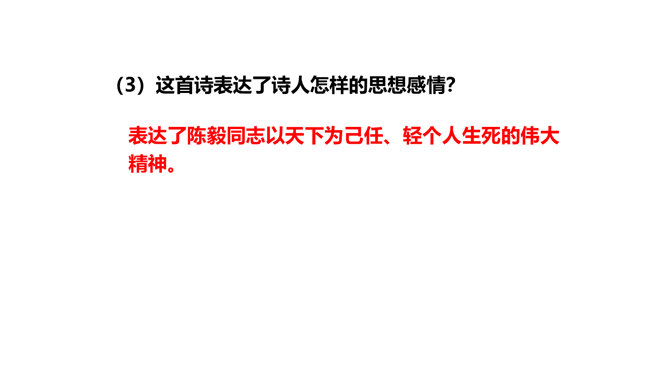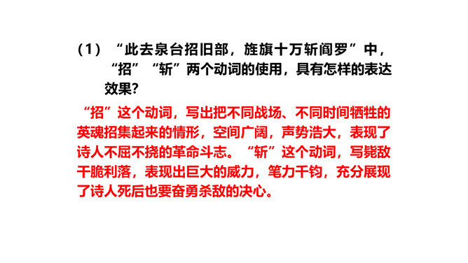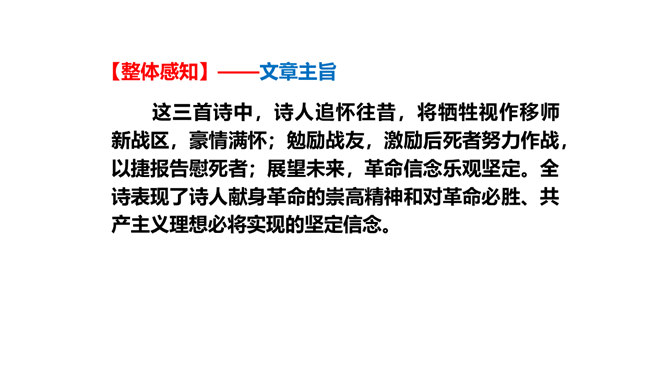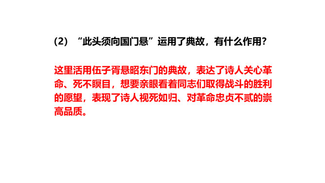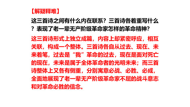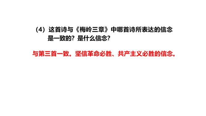 旧词新用,引用典故,进行创造性转化。旧词、典故的创造性转化是这组诗章引人注目的特点。诗中诗人将蒋介石和当时南京国民政府统治下的人间地狱比作“阎罗”和“泉台”,用“纸钱”来代指革命军队的“捷报”,赋予并传达出一种全新的含义。陈毅活用伍子胥“悬昭东门”的典故,意为死不瞑目,据城门高处以观天下大势,表达出在“断头”威胁面前的浩然正气。这三首诗之间有什么内在联系?三首诗各着重写什么?表现了老一辈无产阶级革命家怎样的革命精神?所属专题:梅岭三章ppt。