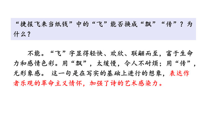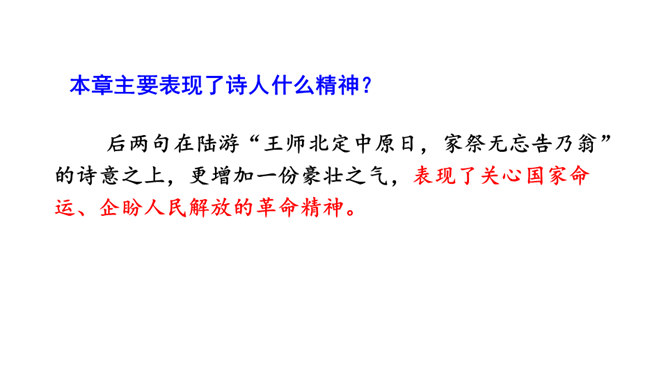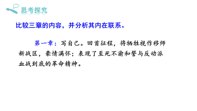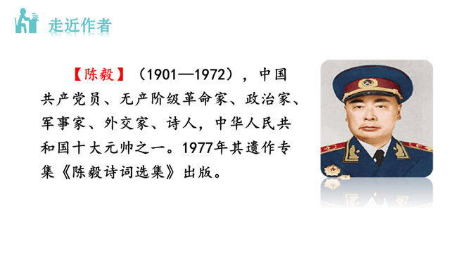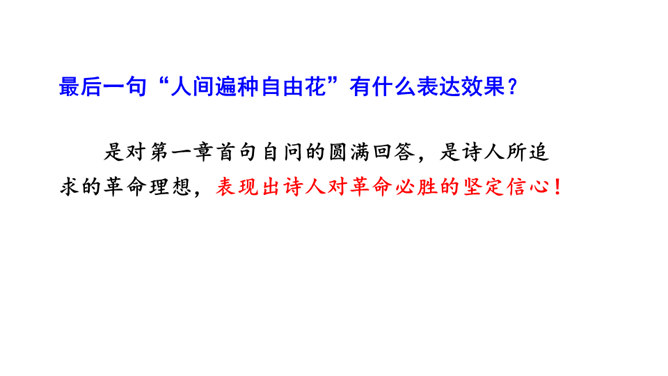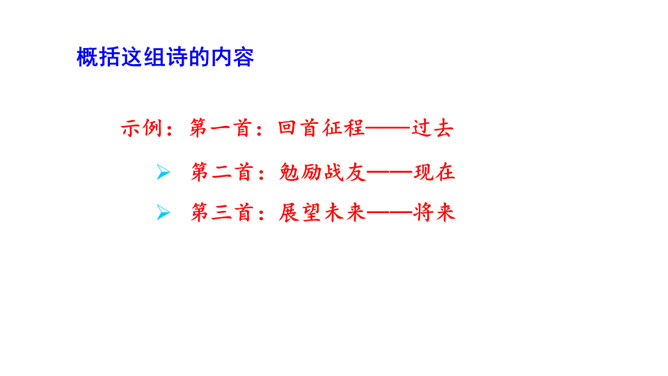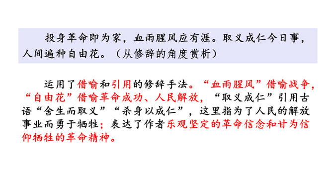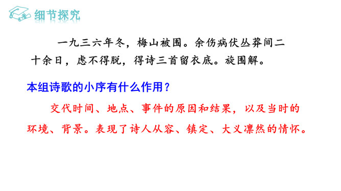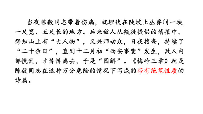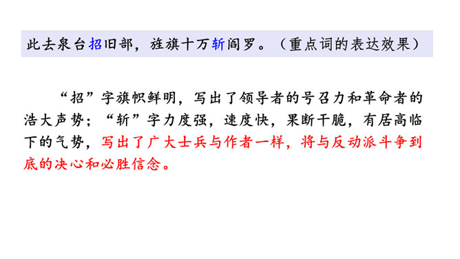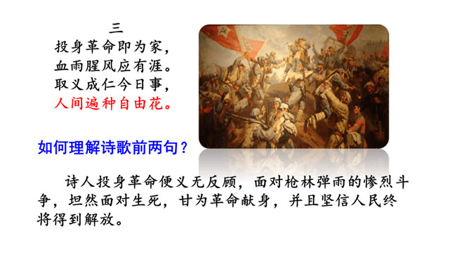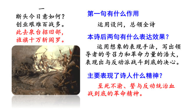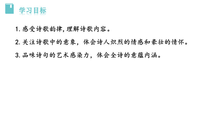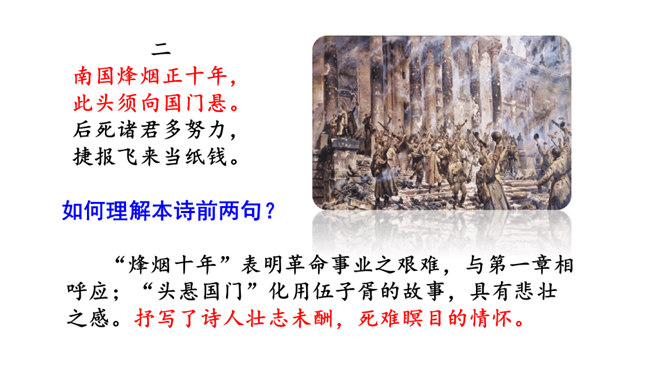 1.感受诗歌韵律,理解诗歌内容。2.关注诗歌中的意象,体会诗人炽烈的情感和豪壮的情怀。3.品味诗句的艺术感染力,体会全诗的意蕴内涵。本诗后两句有什么表达效果?运用想象的表现手法,写出领导者的号召力和革命力量的浩大,表现出与反动派战斗到底的决心。主要表现了诗人什么精神?至死不渝、誓与反动统治血战到底的革命精神。“烽烟十年”表明革命事业之艰难,与第一章相呼应;“头悬国门”化用伍子胥的故事,具有悲壮之感。抒写了诗人壮志未酬,死难瞑目的情怀。所属专题:梅岭三章ppt。