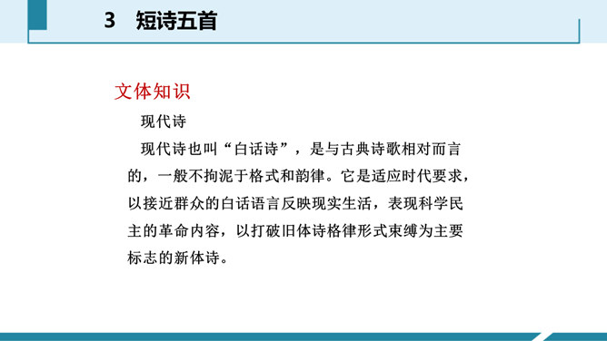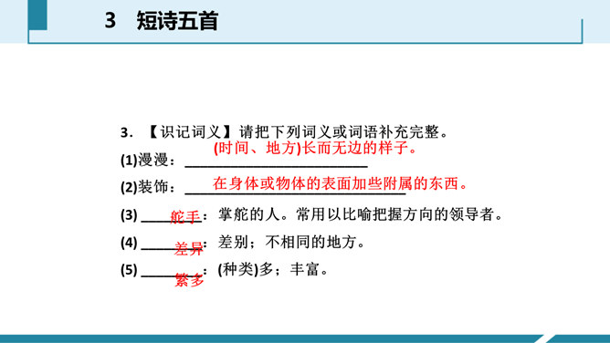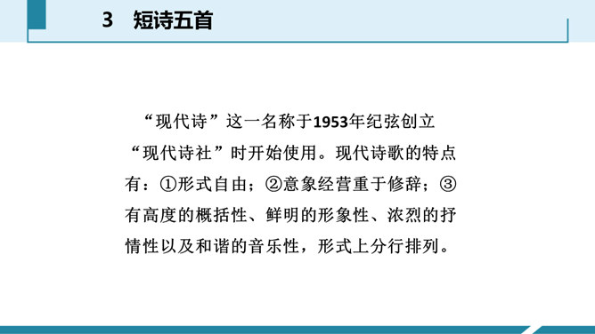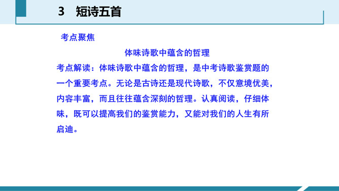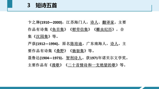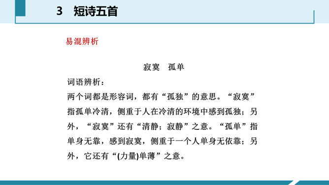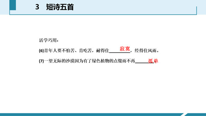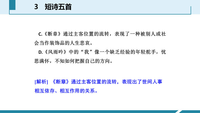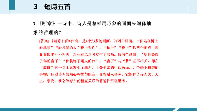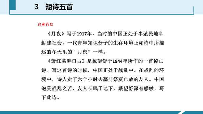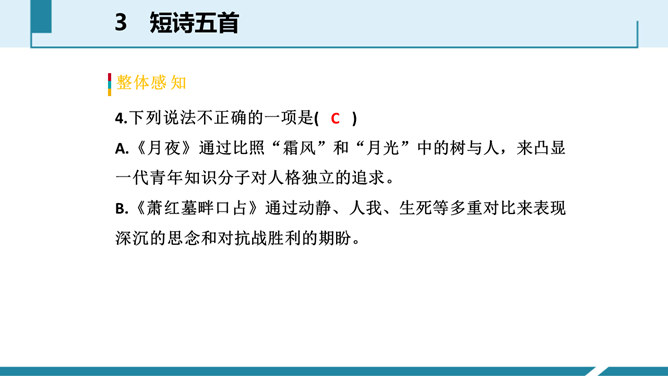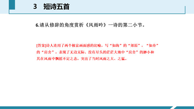 说说你对《月夜》中的“树”和《萧红墓畔口占》中的“红山茶”的理解。在《月夜》一诗中,于“霜风”“月光”里,“树”傲然独立,象征着一代青年知识分子不妥协、不退缩的独立人格追求。在《萧红墓畔口占》一诗中,诗人以色彩绚烂的“红山茶”隐喻和赞扬亡者生命之灿烂,人格之高洁;同时,也映照出悼者内心的庄严与热烈。请从修辞的角度赏析《风雨吟》一诗的第二小节。诗人连用了两个极富画面感的比喻,写“如海”的“郊原”,“如舟”的“房舍”,表现了无边无际、没有尽头的茫茫大地中“房舍”的渺小和其在风雨中飘摇不定之态。所属专题:短诗五首ppt。