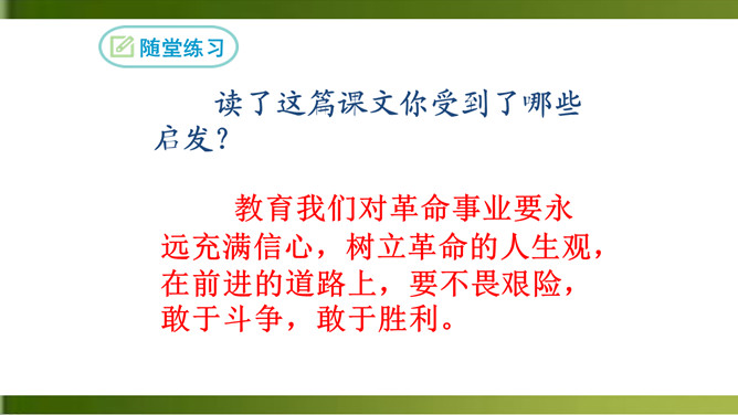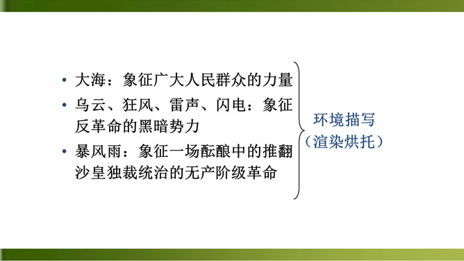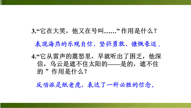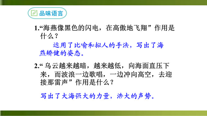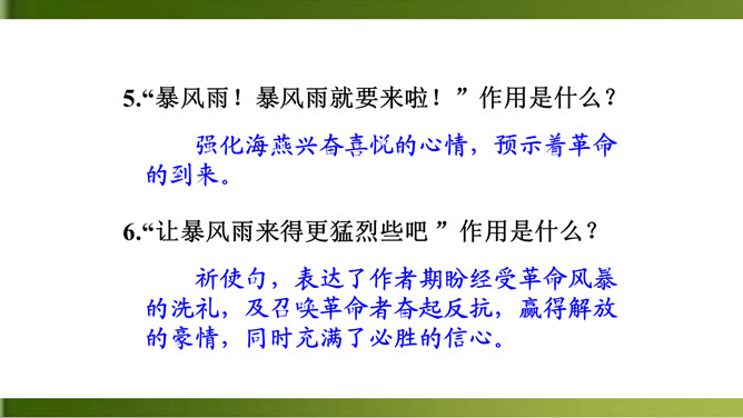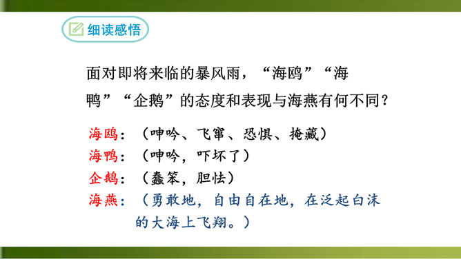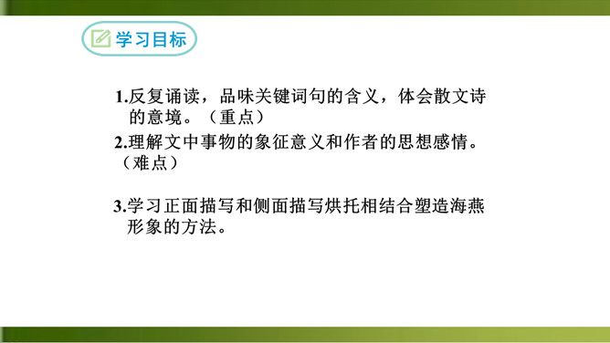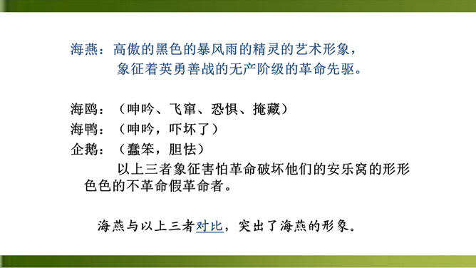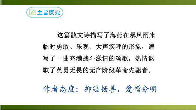 1.反复诵读,品味关键词句的含义,体会散文诗的意境。(重点)2.理解文中事物的象征意义和作者的思想感情。(难点)3.学习正面描写和侧面描写烘托相结合塑造海燕形象的方法。面对即将来临的暴风雨,“海鸥”“海鸭”“企鹅”的态度和表现与海燕有何不同?“海燕像黑色的闪电,在高傲地飞翔”作用是什么?运用了比喻和拟人的手法,写出了海燕矫健的姿态。这篇散文诗描写了海燕在暴风雨来临时勇敢、乐观、大声疾呼的形象,谱写了一曲充满战斗激情的颂歌,热情讴歌了英勇无畏的无产阶级革命先驱者。所属专题:海燕ppt。