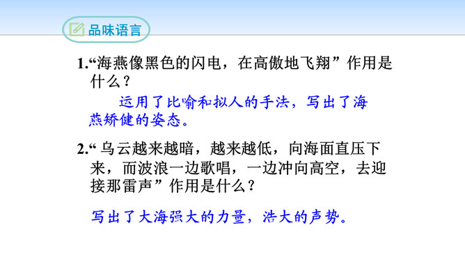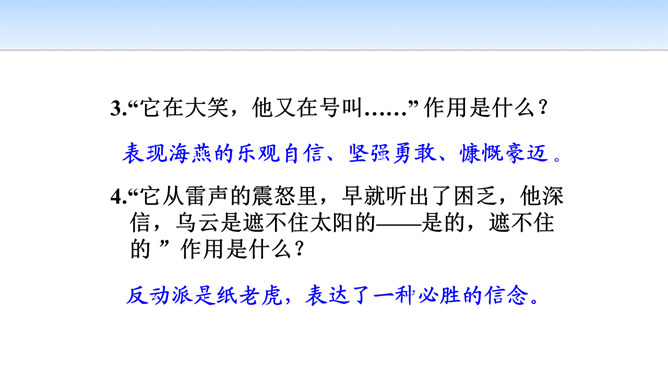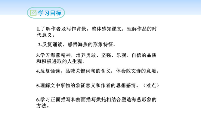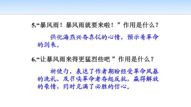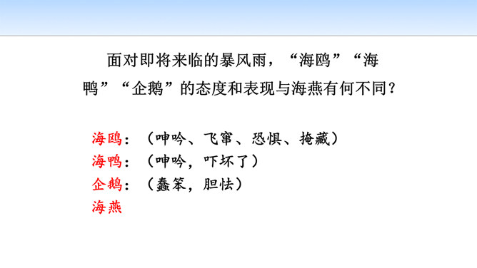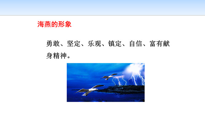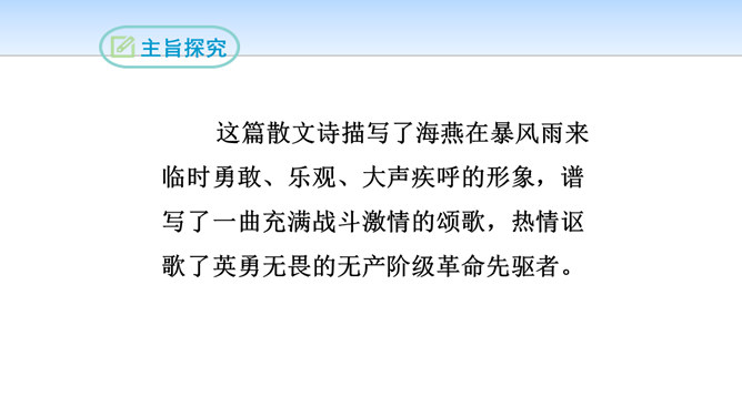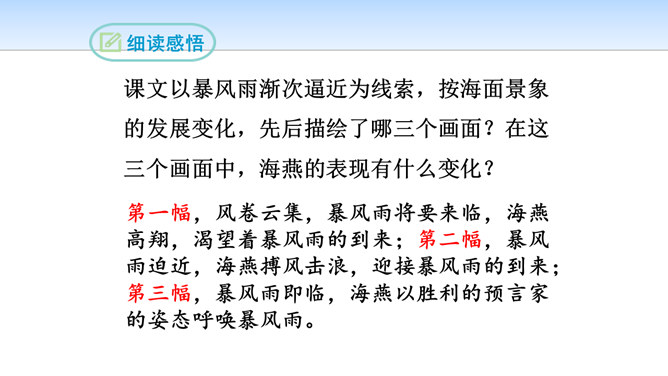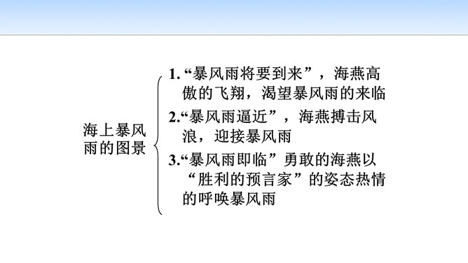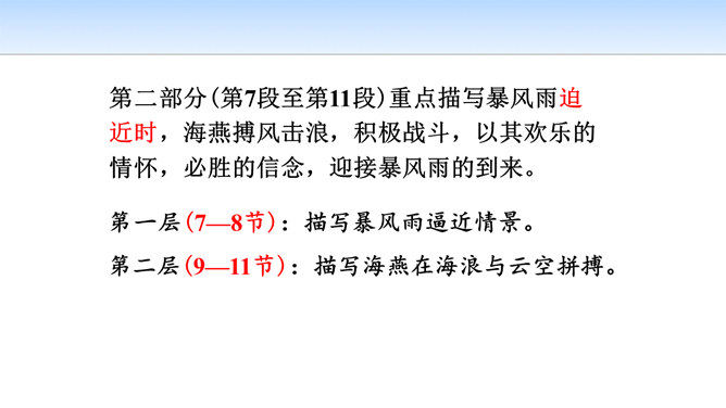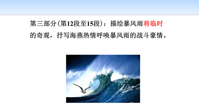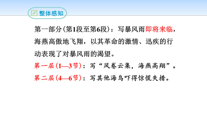 第一部分(第1段至第6段):写暴风雨即将来临,海燕高傲地飞翔,以其革命的激情、迅疾的行动表现了对暴风雨的渴望。第一层(1—3节):写“风卷云集,海燕高翔”。 第二层(4—6节):写其他海鸟吓得惊慌失措。第二部分(第7段至第11段)重点描写暴风雨迫近时,海燕搏风击浪,积极战斗,以其欢乐的情怀,必胜的信念,迎接暴风雨的到来。第一层(7—8节):描写暴风雨逼近情景。 第二层(9—11节):描写海燕在海浪与云空拼搏。第三部分(第12段至15段):描绘暴风雨将临时的奇观,抒写海燕热情呼唤暴风雨的战斗豪情。所属专题:海燕ppt。