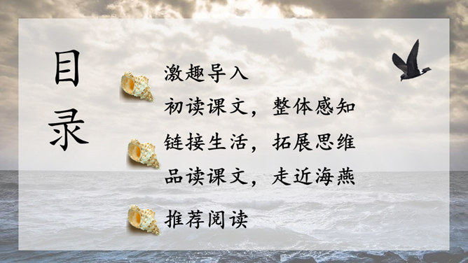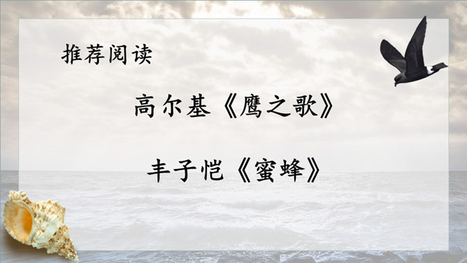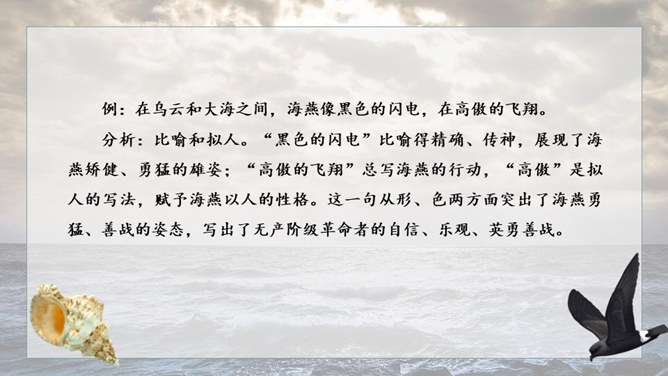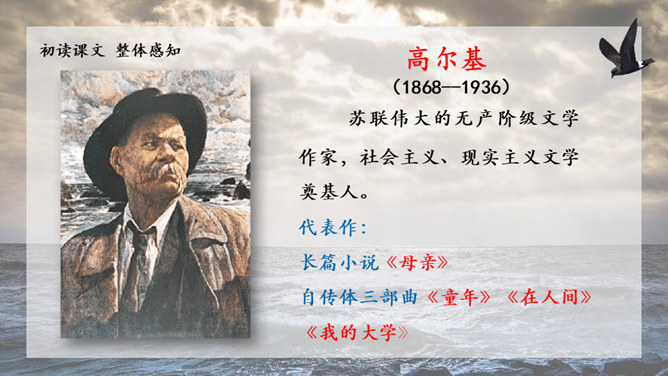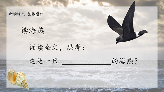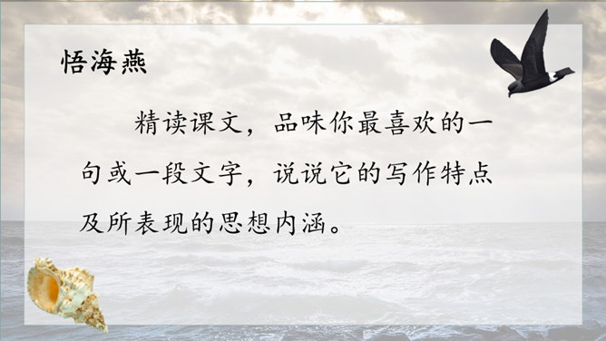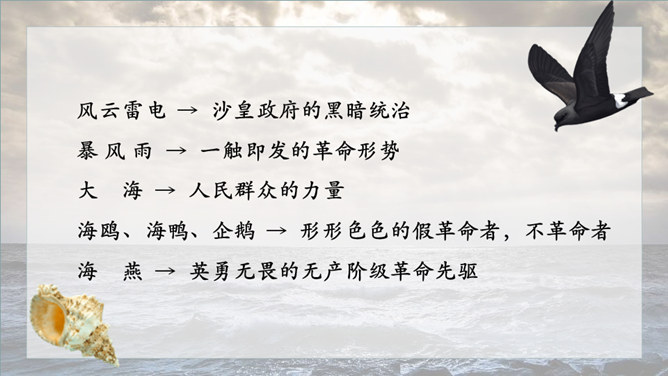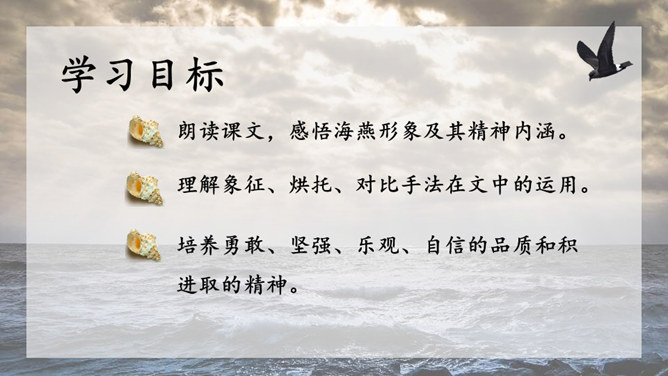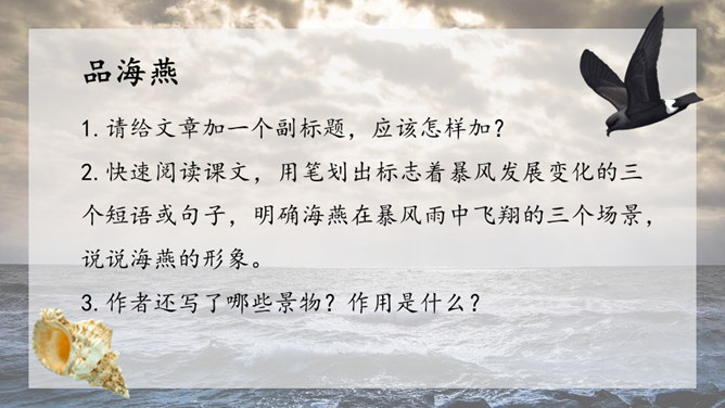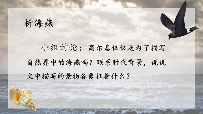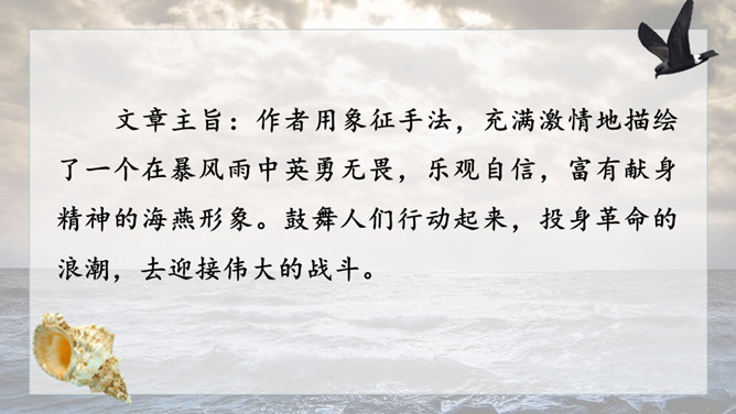 1.请给文章加一个副标题,应该怎样加?2.快速阅读课文,用笔划出标志着暴风发展变化的三个短语或句子,明确海燕在暴风雨中飞翔的三个场景,说说海燕的形象。3.作者还写了哪些景物?作用是什么?朗读课文,感悟海燕形象及其精神内涵。理解象征、烘托、对比手法在文中的运用。培养勇敢、坚强、乐观、自信的品质和积进取的精神。小组讨论:高尔基仅仅是为了描写自然界中的海燕吗?联系时代背景,说说文中描写的景物各象征着什么?文章主旨:作者用象征手法,充满激情地描绘了一个在暴风雨中英勇无畏,乐观自信,富有献身精神的海燕形象。所属专题:海燕ppt。