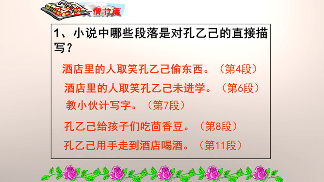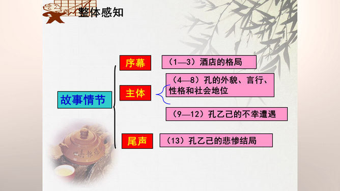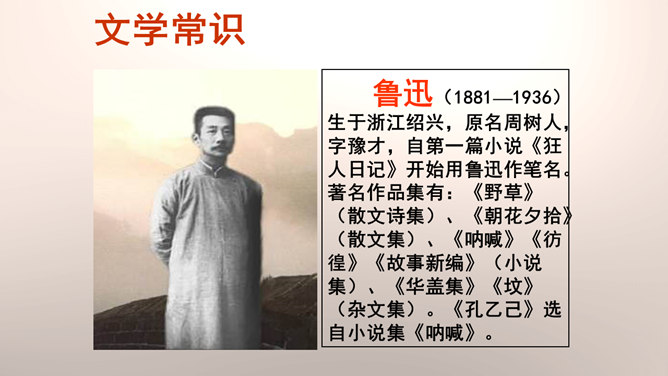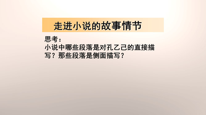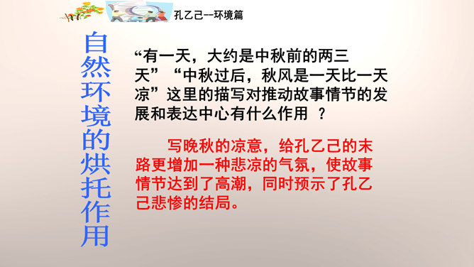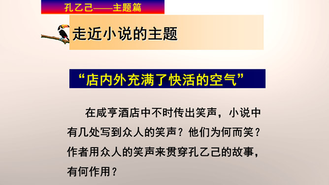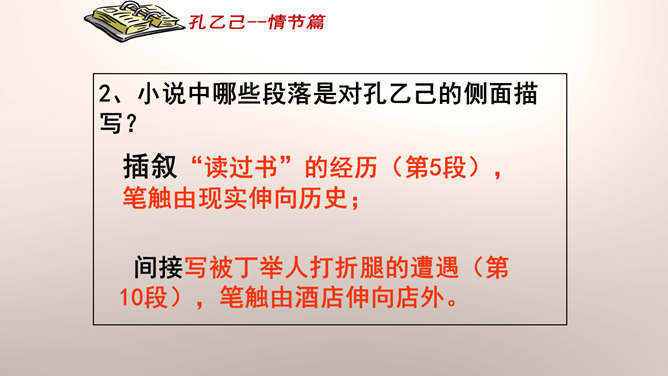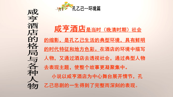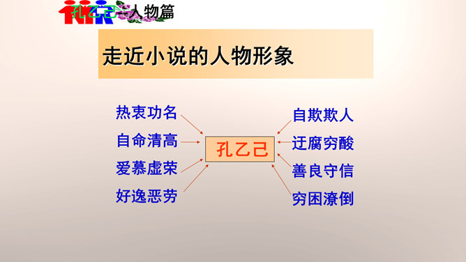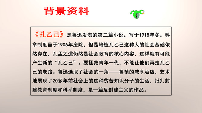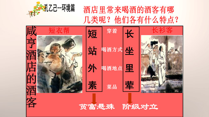 “我”是孔乙己悲剧的见证人。这种第一人称写法增加了小说的真实感和亲切感。以一位不谙世事的酒店小伙计的口吻,不动声色地讲述着孔乙己的凄惨遭遇,貌似平淡轻松,实则蕴涵着深沉的批判力量,连12岁的小伙计都鄙视孔乙己,更能说明这个社会对不幸者的冷漠,使作品更增加了悲剧的意味。正是读书人出身的丁举人,置孔乙己于绝境,作者设计这样的情节有什么用意?设计这样的情节尖锐的揭露了科举制度的本质和罪恶。科举制度造成了两种读书人不同的命运,少数爬上去的,成为残酷的压迫者,多数爬不上去的,成为悲惨的牺牲品。所属专题:孔乙己ppt。