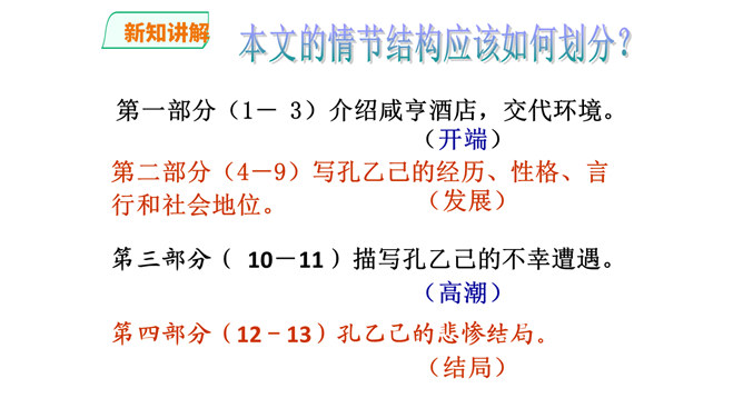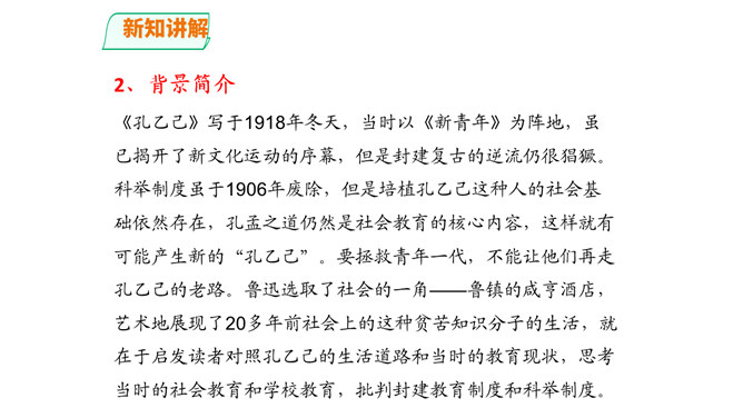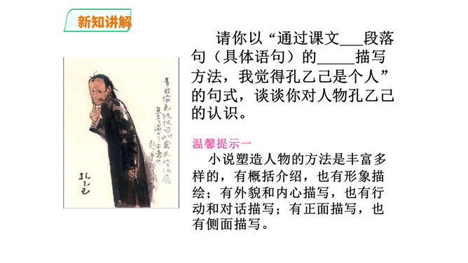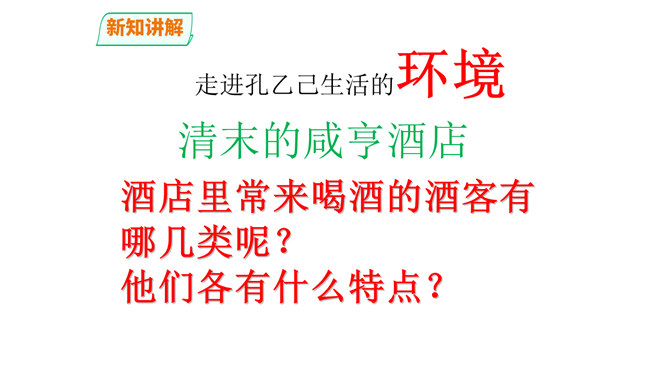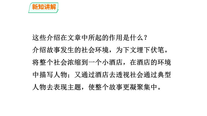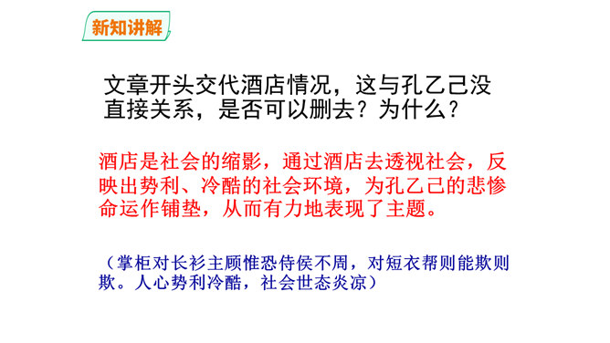 这些介绍在文章中所起的作用是什么?介绍故事发生的社会环境,为下文埋下伏笔。将整个社会浓缩到一个小酒店,在酒店的环境中描写人物;又通过酒店去透视社会通过典型人物去表现主题,使整个故事更凝聚集中。文章开头交代酒店情况,这与孔乙己没直接关系,是否可以删去?为什么?酒店是社会的缩影,通过酒店去透视社会,反映出势利、冷酷的社会环境,为孔乙己的悲惨命运作铺垫,从而有力地表现了主题。运用了外貌描写,形象生动地写出(表现)了孔乙己穷途末路、极度悲惨的境地。从侧面表现了社会对他的冷漠无情。所属专题:孔乙己ppt。