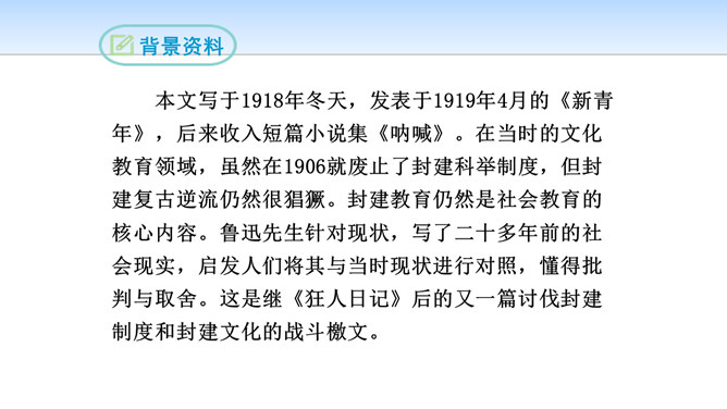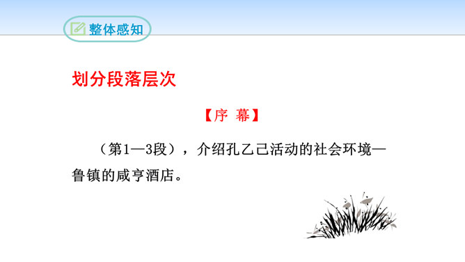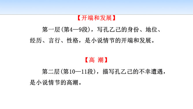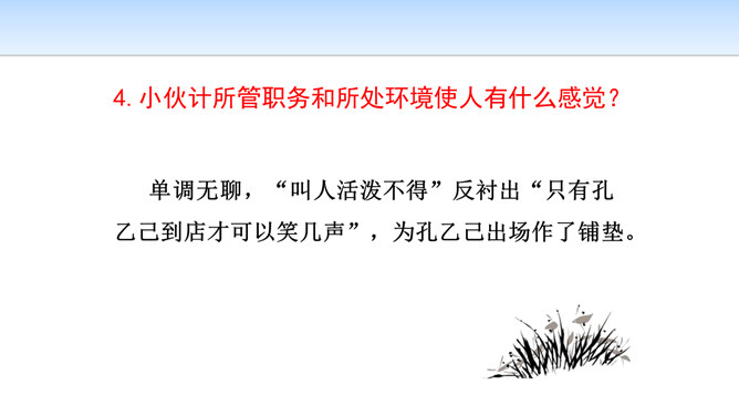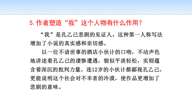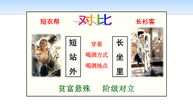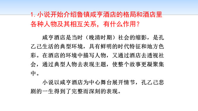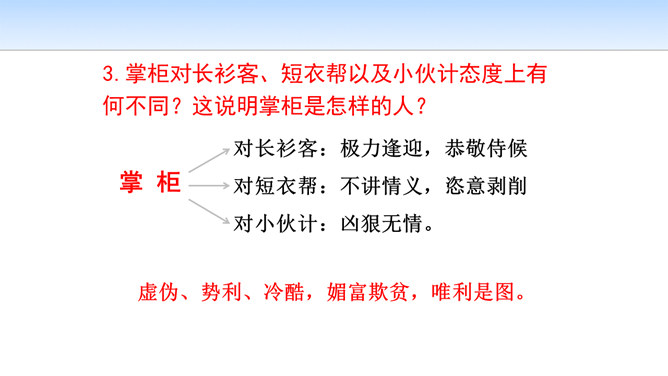 小说开始介绍鲁镇咸亨酒店的格局和酒店里各种人物及其相互关系,有什么作用?咸亨酒店是当时(晚清时期)社会的缩影,是孔乙己生活的典型环境,具有鲜明的时代特征和地方色彩。在酒店的环境中描写人物,又通过酒店去透视社会,通过典型人物去表现主题,使整个故事更凝聚集中。小说以咸亨酒店为中心舞台展开情节,孔乙己悲剧的一生得到了完整而深刻的表现。掌柜对长衫客、短衣帮以及小伙计态度上有何不同?这说明掌柜是怎样的人?虚伪、势利、冷酷,媚富欺贫,唯利是图。所属专题:孔乙己ppt。