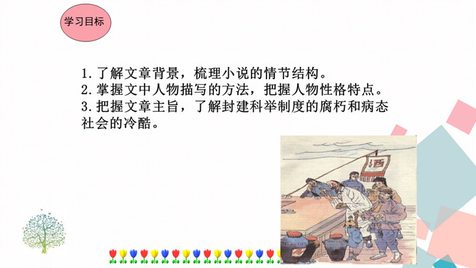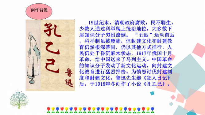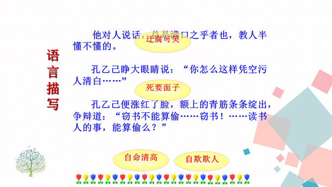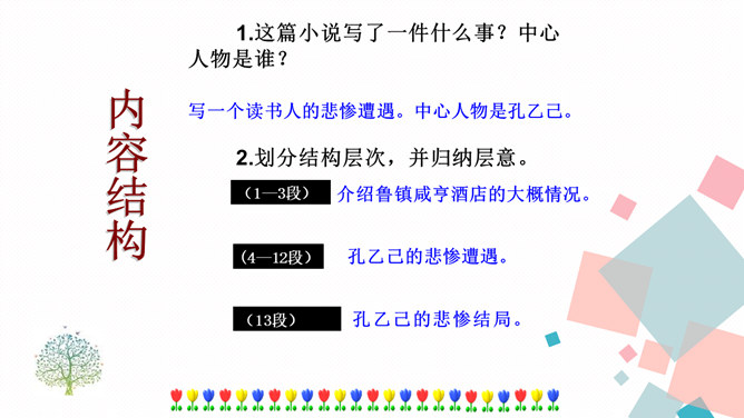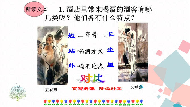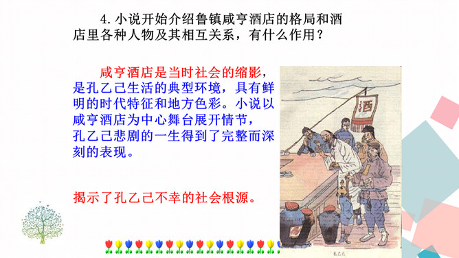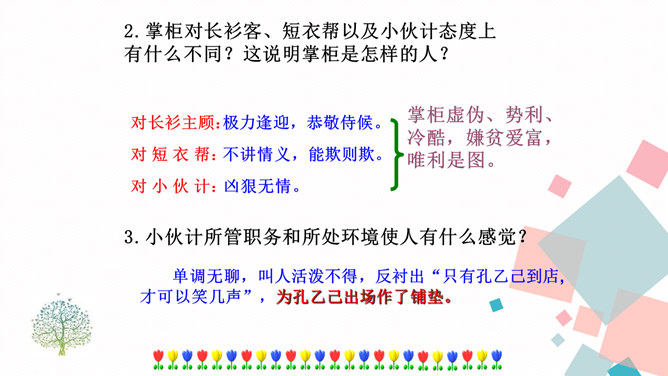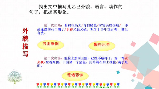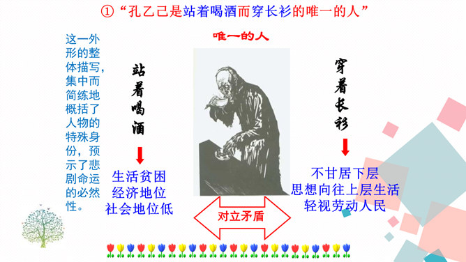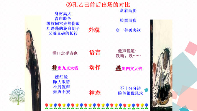 1.巧妙地运用了对比手法。孔乙己先后两次出场的情况对比,表现他的性格特征与不幸遭遇;科举考试的获胜者与失败者的对比,揭露科举制度的罪恶;小孩、大人对待孔乙己的不同态度的对比,揭露封建教育使人们丧失良知和仁爱而变得麻木冷漠;等等。2.通过语言、动作、神态等方面的描写表现人物性格,完美地塑造了一个社会底层的落魄知识分子形象。3.巧妙地用社会环境描写烘托突出人物形象。 咸亨酒店是孔乙己活动的空间,是中国封建社会的缩影。掌柜对“短衣帮”与“长衫客”的不同态度,店内单调无聊、令人窒息的气氛。所属专题:孔乙己ppt。