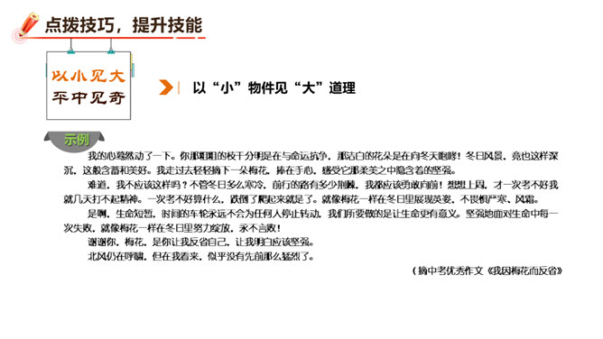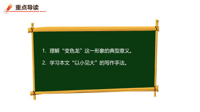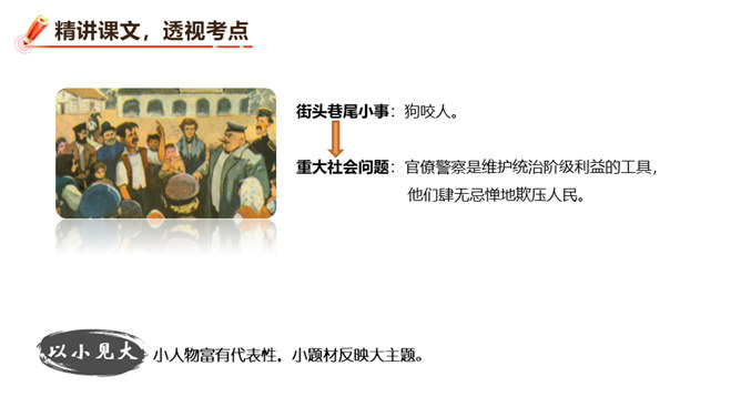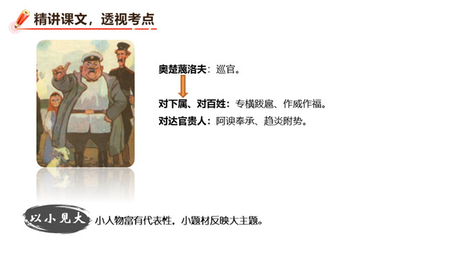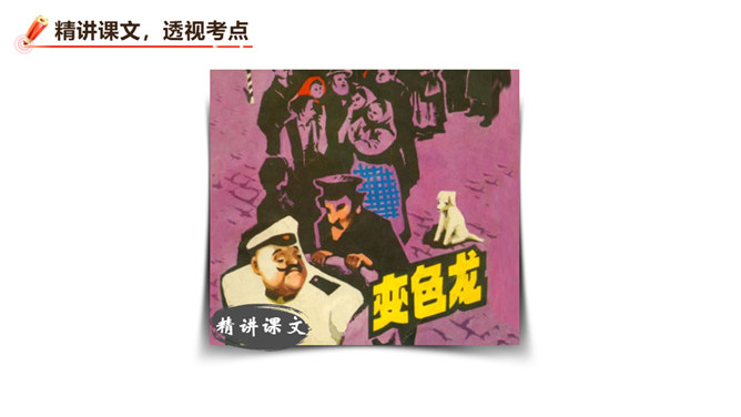 理解“变色龙”这一形象的典型意义。学习本文“以小见大”的写作手法。契诃夫,俄罗斯世界级短篇小说巨匠,杰出的剧作家,是俄罗斯19世纪末期最后一位批判现实主义艺术大师,与法国作家莫泊桑和美国作家欧·亨利并称为“世界三大短篇小说家”。街头巷尾小事:狗咬人。重大社会问题:官僚警察是维护统治阶级利益的工具,他们肆无忌惮地欺压人民。小人物富有代表性,小题材反映大主题。所属专题:变色龙ppt。