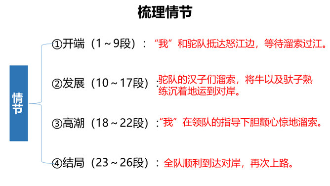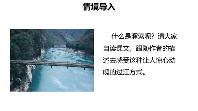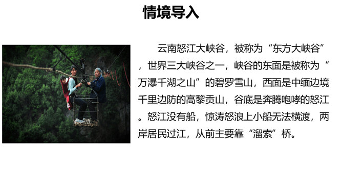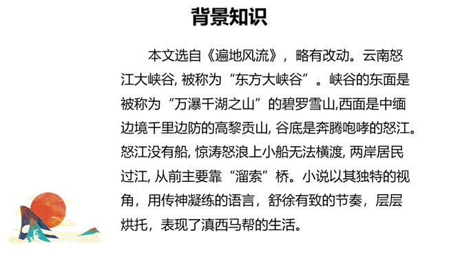 云南怒江大峡谷, 被称为“东方大峡谷”。峡谷的东面是被称为“万瀑千湖之山”的碧罗雪山,西面是中缅边境千里边防的高黎贡山, 谷底是奔腾咆哮的怒江。怒江没有船, 惊涛怒浪上小船无法横渡, 两岸居民过江, 从前主要靠“溜索”桥。小说以其独特的视角,用传神凝练的语言,舒徐有致的节奏,层层烘托,表现了滇西马帮的生活。本文讲述马帮飞渡峡谷的故事,既突出了怒江峡谷的孤悬、高峻、险恶,又表现了马帮汉子沉着、冷静、从容的姿态,写出了作者对马帮汉子粗犷豪迈、勇敢无畏的精神的钦敬和赞颂,突出表现了人在自然面前接受挑战,战胜艰险的气定神闲的姿态。所属专题:溜索ppt。