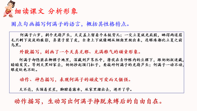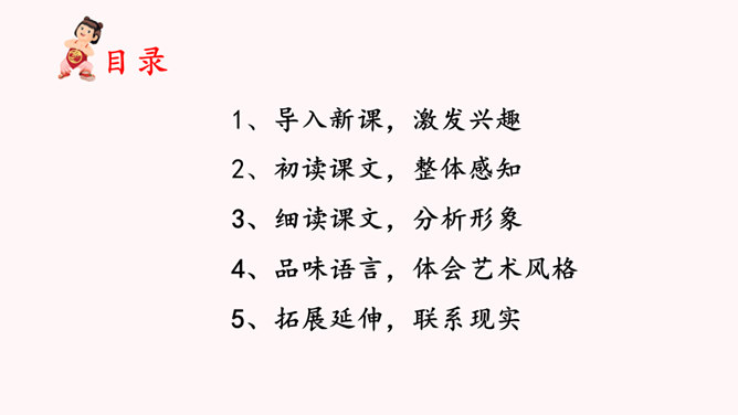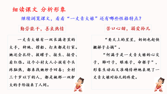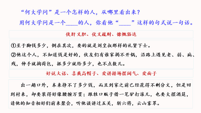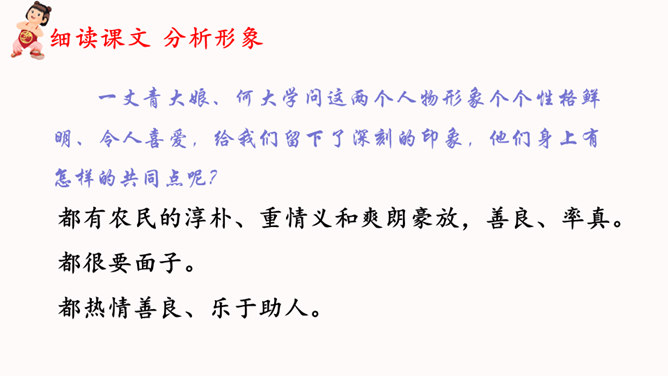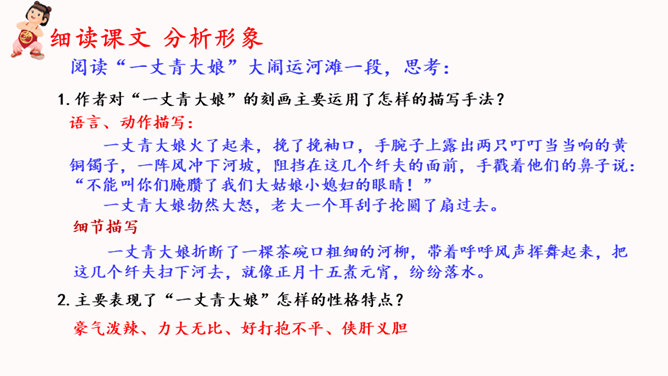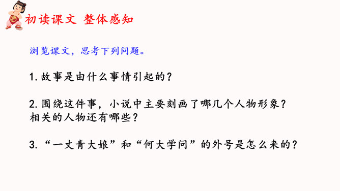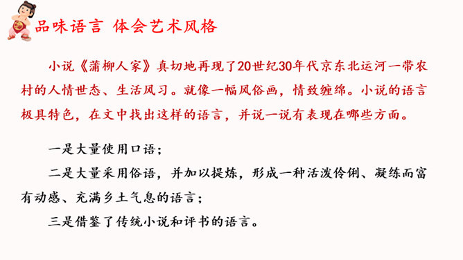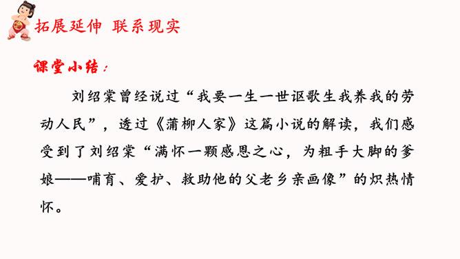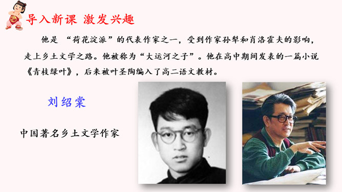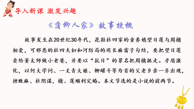 了解刘绍棠及其乡土文学的相关知识;理清小说情节,把握人物性格。学习塑造人物的方法,欣赏鲜明的人物形象;品读语言,理解小说多样化的艺术风格。感受小说浓郁的乡土气息,领悟劳动人民淳厚朴实的人情美。故事是由什么事情引起的?围绕这件事,小说中主要刻画了哪几个人物形象?相关的人物还有哪些?“一丈青大娘”和“何大学问”的外号是怎么来的?一丈青大娘、何大学问这两个人物形象个个性格鲜明、令人喜爱,给我们留下了深刻的印象,他们身上有怎样的共同点呢?都有农民的淳朴、重情义和爽朗豪放。所属专题:蒲柳人家ppt。