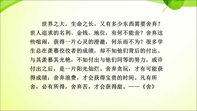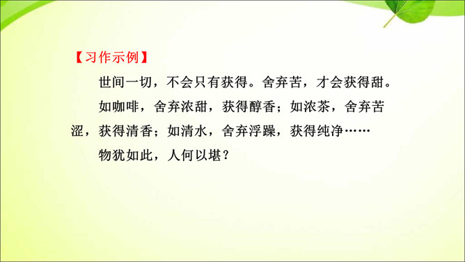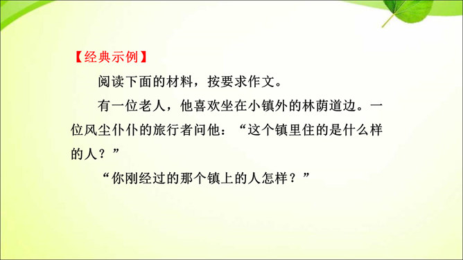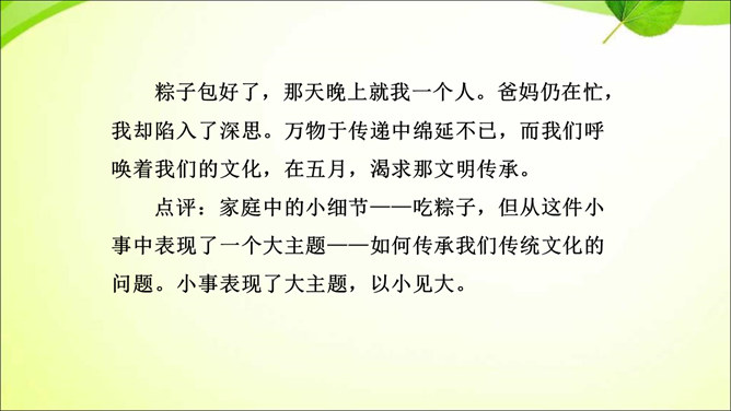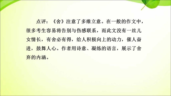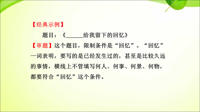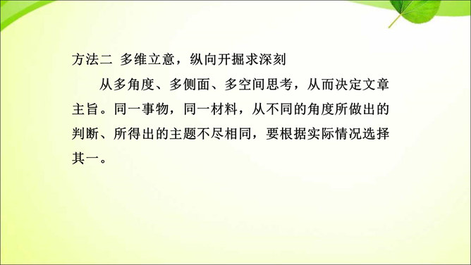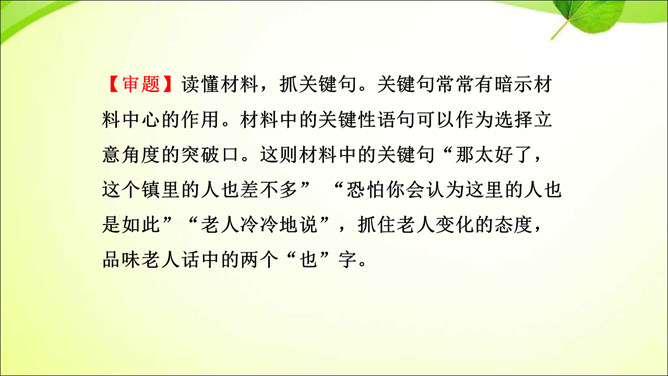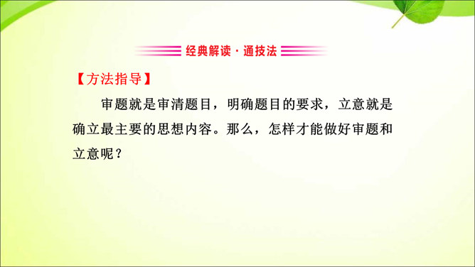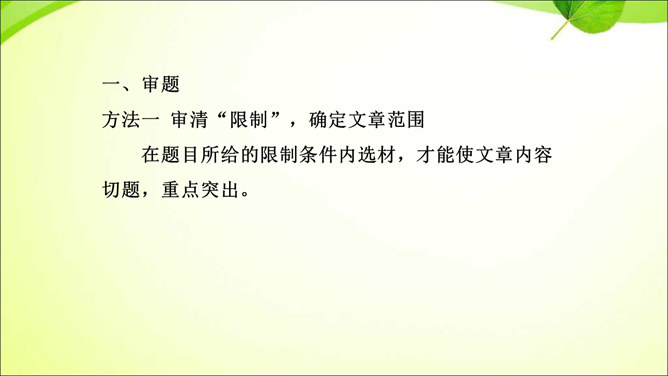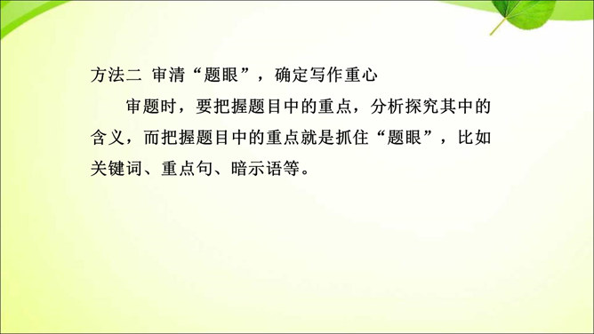 审题就是审清题目,明确题目的要求,立意就是确立最主要的思想内容。那么,怎样才能做好审题和立意呢?方法一 审清“限制”,确定文章范围。在题目所给的限制条件内选材,才能使文章内容切题,重点突出。审清“题眼”,确定写作重心。审题时,要把握题目中的重点,分析探究其中的含义,而把握题目中的重点就是抓住“题眼”,比如关键词、重点句、暗示语等。以小见大,化大为小炼主旨。小处落笔,大处着眼,选用的是小事物,记叙的是小事情,描写的是细节,剖析的是细小现象,但是所表现的是重大主题,所阐发的是深刻道理。所属专题:审题立意ppt。