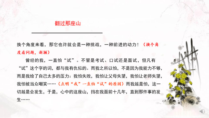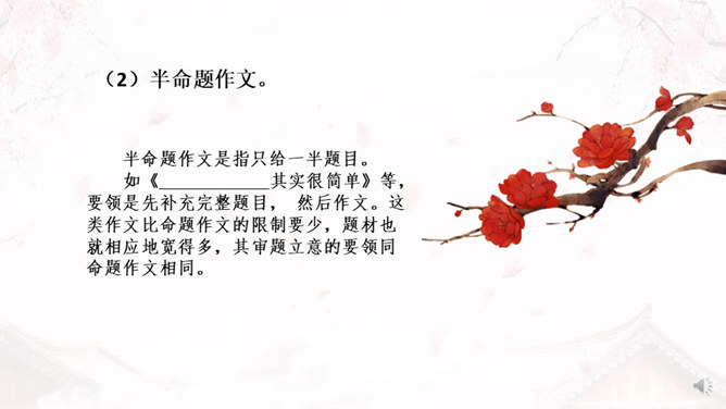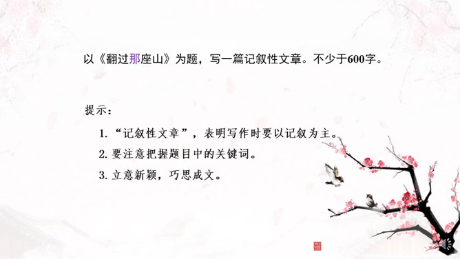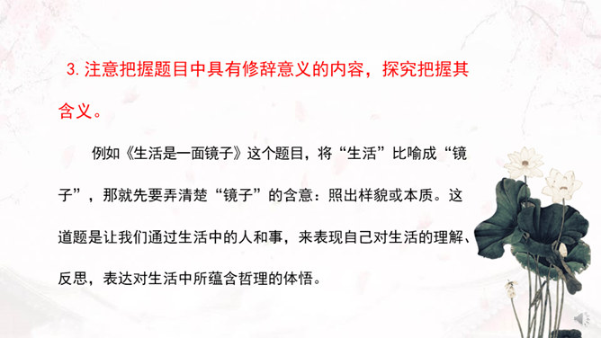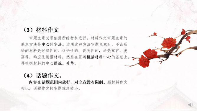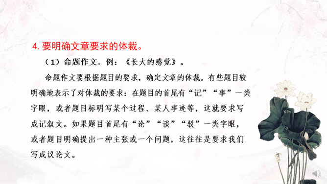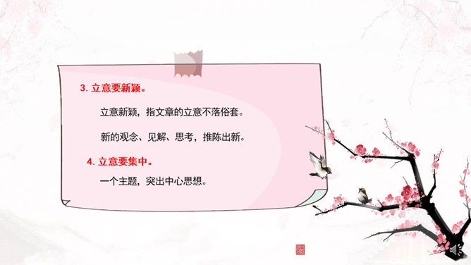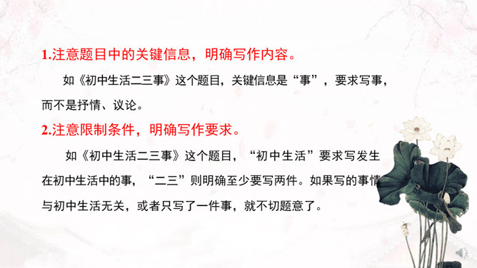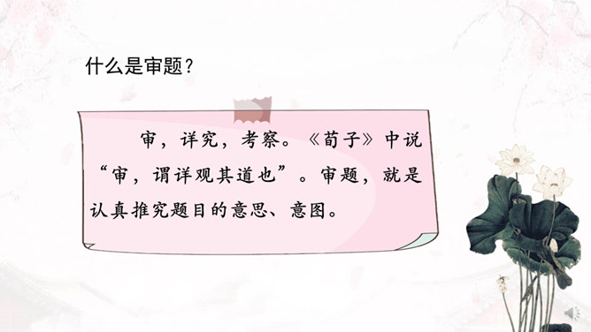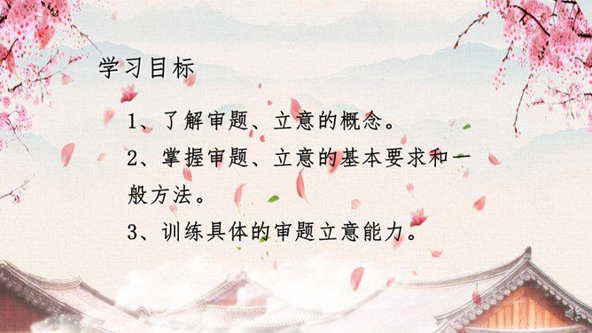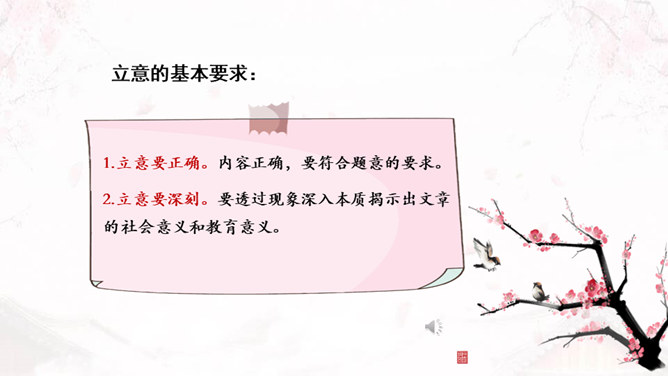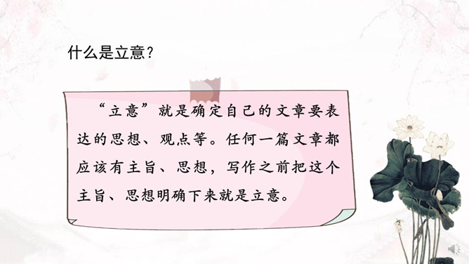 学习目标:1、了解审题、立意的概念。2、掌握审题、立意的基本要求和一般方法。3、训练具体的审题立意能力。什么是审题?审,详究,考察。《荀子》中说“审,谓详观其道也”。审题,就是认真推究题目的意思、意图。什么是立意?“立意”就是确定自己的文章要表达的思想、观点等。任何一篇文章都应该有主旨、思想,写作之前把这个主旨、思想明确下来就是立意。注意题目中的关键信息,明确写作内容。如《初中生活二三事》这个题目,关键信息是“事”,要求写事,而不是抒情、议论。所属专题:审题立意ppt。