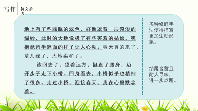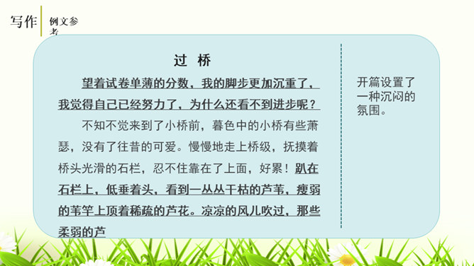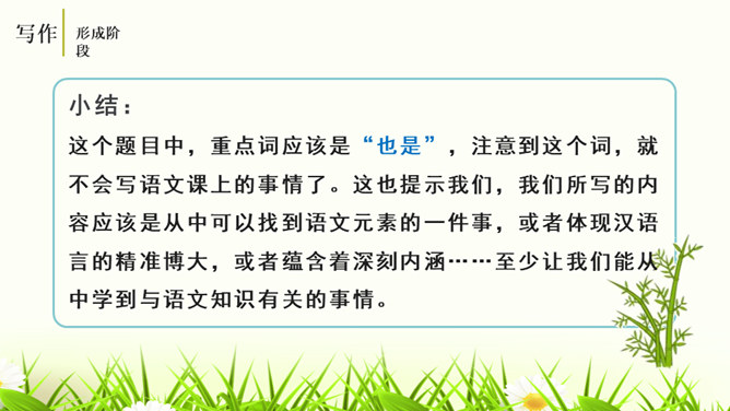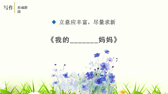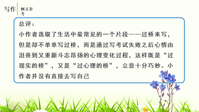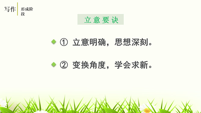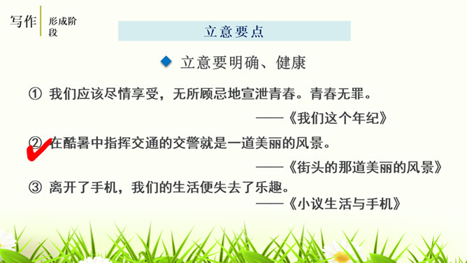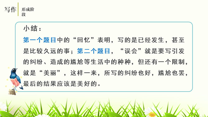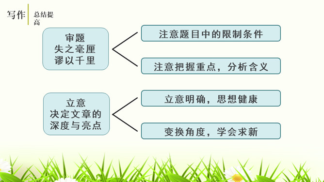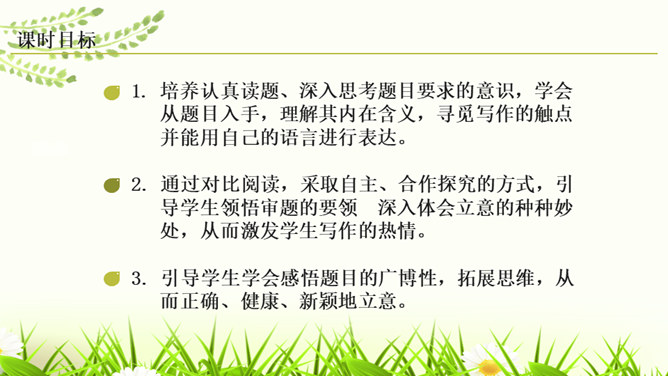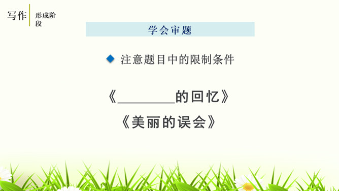 培养认真读题、深入思考题目要求的意识,学会从题目入手,理解其内在含义,寻觅写作的触点并能用自己的语言进行表达。通过对比阅读,采取自主、合作探究的方式,引导学生领悟审题的要领深入体会立意的种种妙处,从而激发学生写作的热情。引导学生学会感悟题目的广博性,拓展思维,从而正确、健康、新颖地立意。第一个题目中的“回忆”表明,写的是已经发生,甚至是比较久远的事;第二个题目,“误会”就是要写引发的纠纷、造成的尴尬等生活中的种种,但还有一个限制,就是“美丽”,最后的结果应该是美好的。所属专题:审题立意ppt。