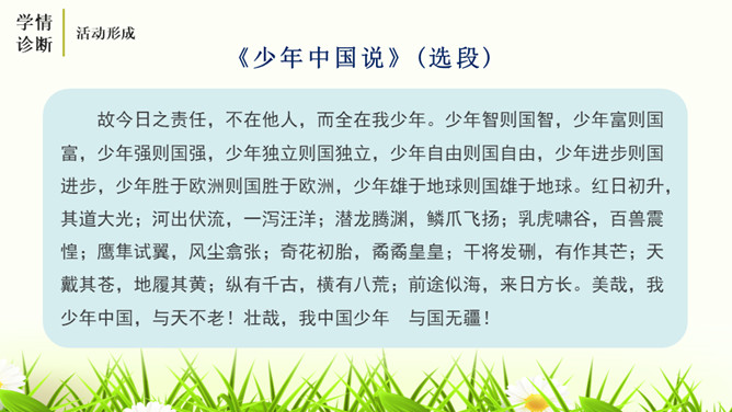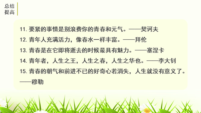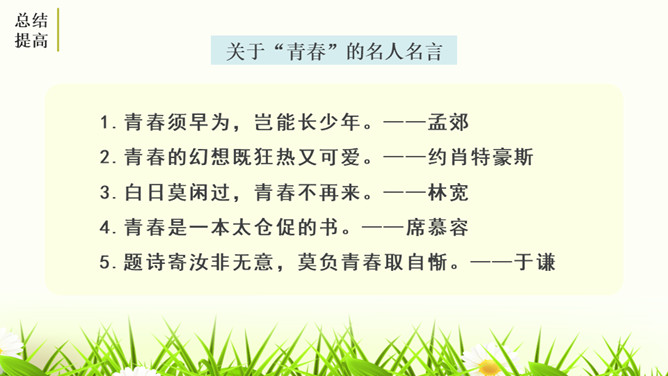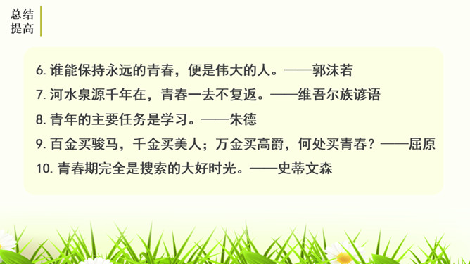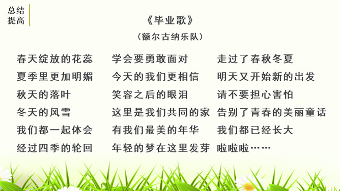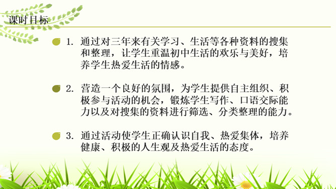 通过活动使学生正确认识自我、热爱集体,培养健康、积极的人生观及热爱生活的态度。营造一个良好的氛围,为学生提供自主组织、积极参与活动的机会,锻炼学生写作、口语交际能力以及对搜集的资料进行筛选、分类整理的能力。通过对三年来有关学习、生活等各种资料的搜集和整理,让学生重温初中生活的欢乐与美好,培养学生热爱生活的情感。所属专题:岁月如歌,我们的初中生活ppt。