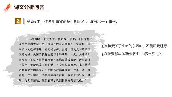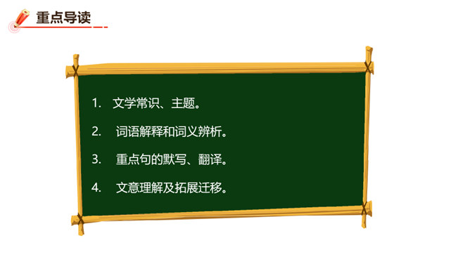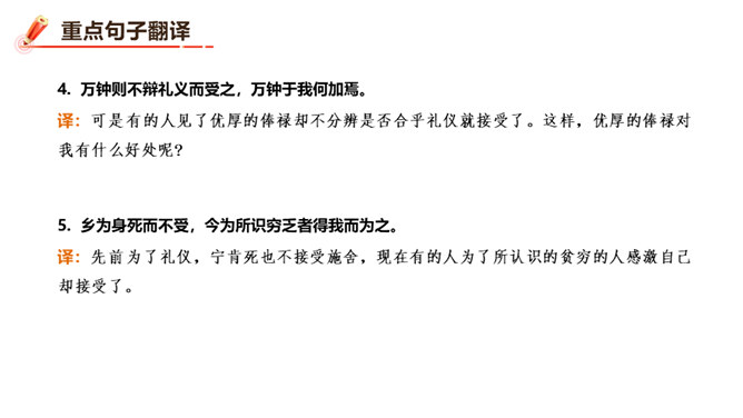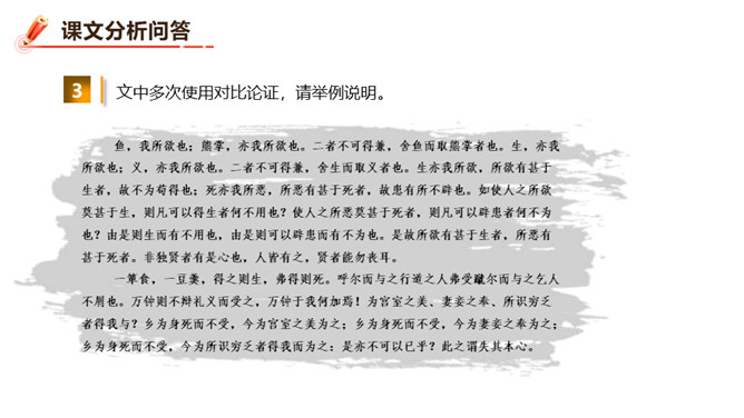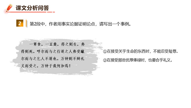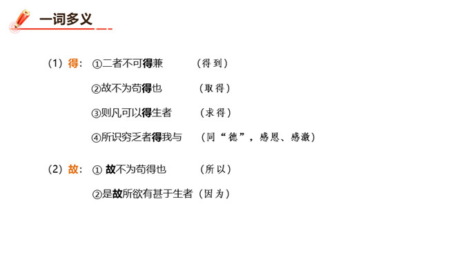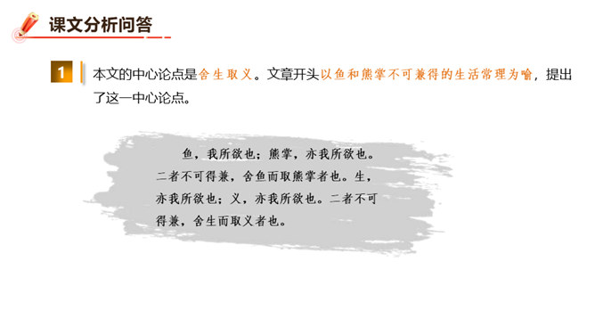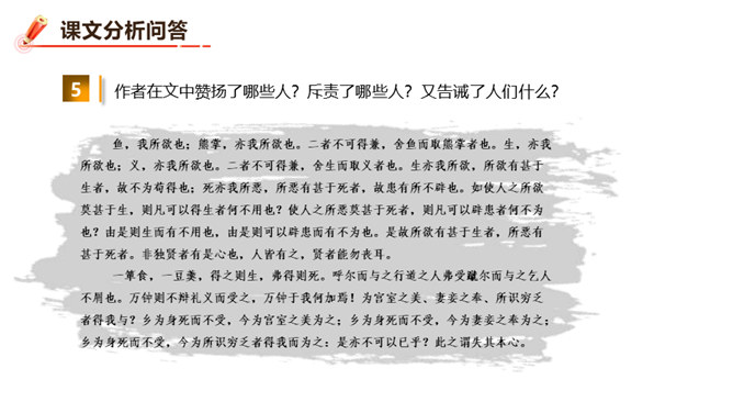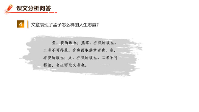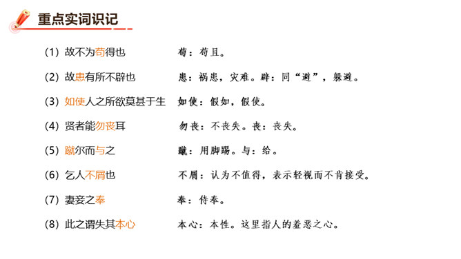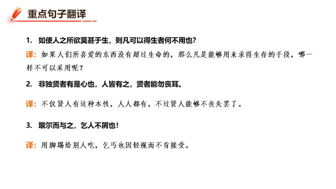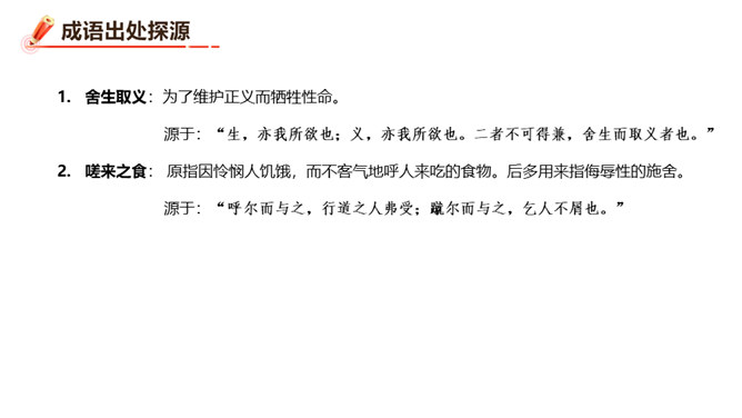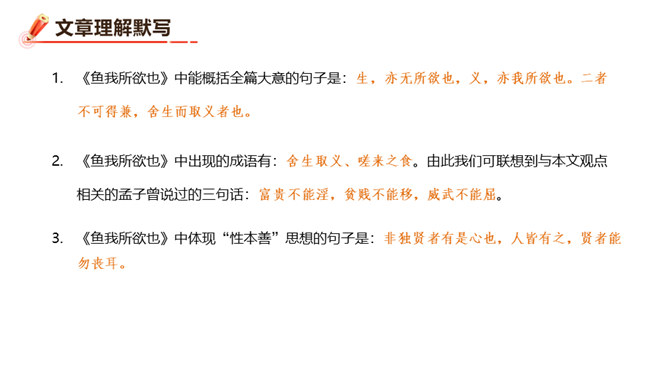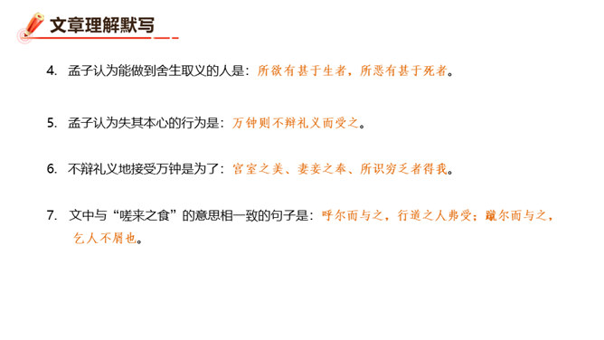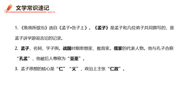 文学常识、主题。词语解释和词义辨析。重点句的默写、翻译。文意理解及拓展迁移。1. 选自《孟子•告子上》。《孟子》是孟子和几位弟子共同撰写的,是孟子讲学游说言论的记录。2. 孟子,名轲,字子舆。战国时期思想家、教育家。儒家的代表人物。他与孔子合称“孔孟”,他被后人尊称为“亚圣”。3. 孟子思想的核心是“仁”“义”,政治上主张“仁政”。舍生取义:为了维护正义而牺牲性命。源于:“生,亦我所欲也;义,亦我所欲也。二者不可得兼,舍生而取义者也。”嗟来之食: 原指因怜悯人饥饿,而不客气地呼人来吃的食物。后多用来指侮辱性的施舍。所属专题:鱼我所欲也ppt。