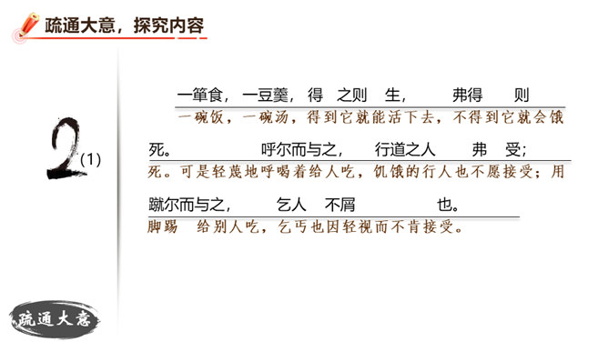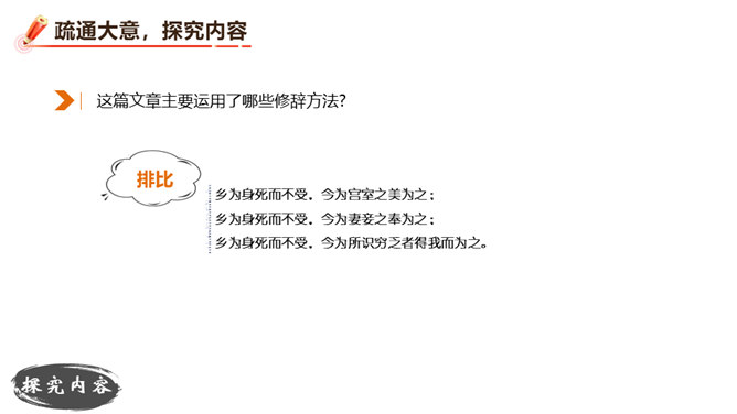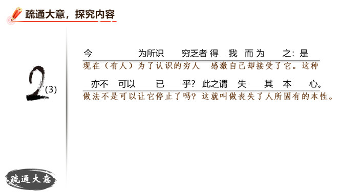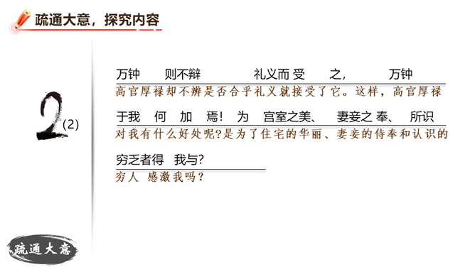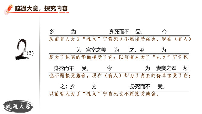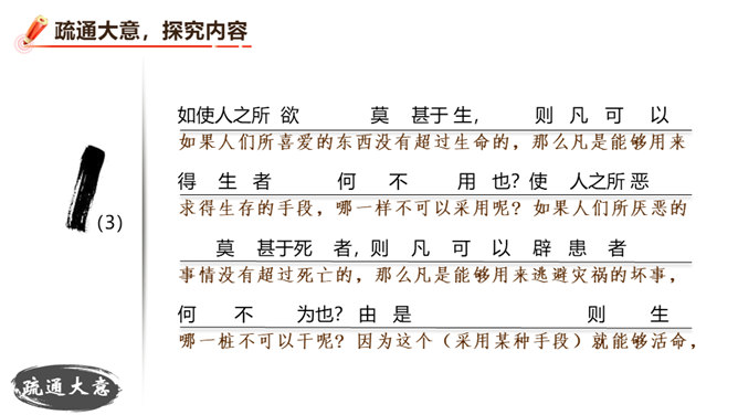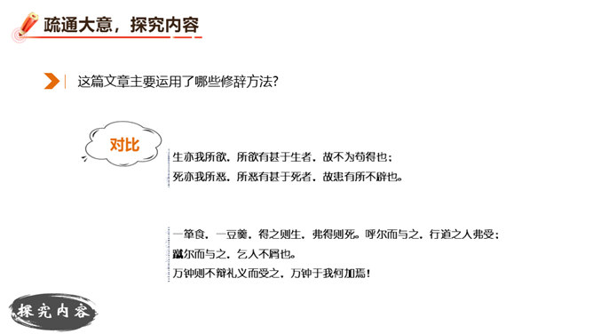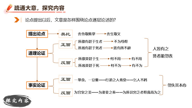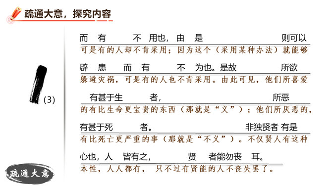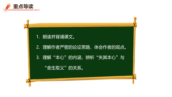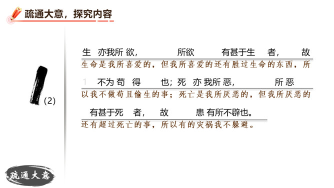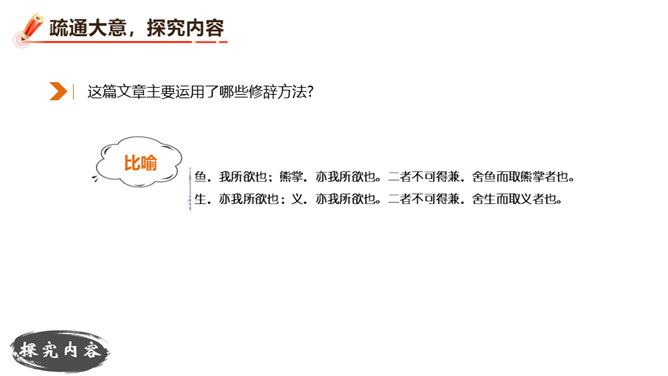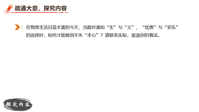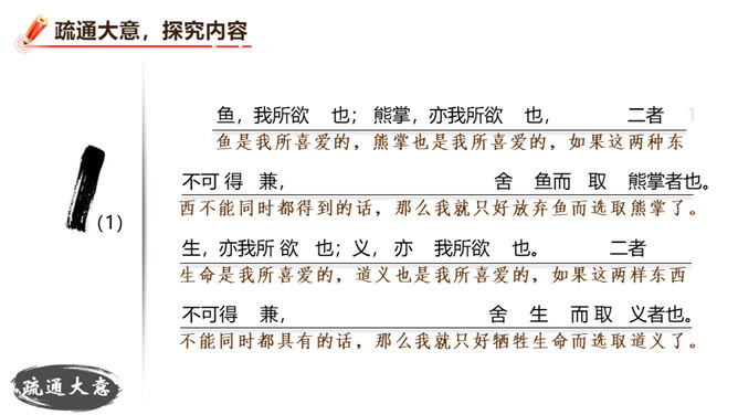 朗读并背诵课文。理解作者严密的论证思路,体会作者的观点。理解“本心”的内涵,辨析“失其本心”与“舍生取义”的关系。在物质生活日益丰富的今天,当面对诸如“生”与“义”、“忧患”与“安乐”的选择时,如何才能做到不失“本心”?请联系实际,谈谈你的看法。孟子提出了“鱼和熊掌不可得兼”的问题和应当“舍生取义”的观点。在当今社会,面对人生的各种考验,我们应如何处理好“舍生取义”和“珍爱生命”的关系?请举例说明。所属专题:鱼我所欲也ppt。