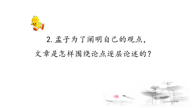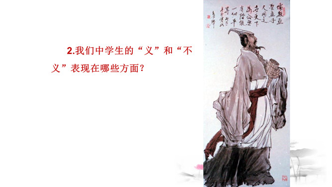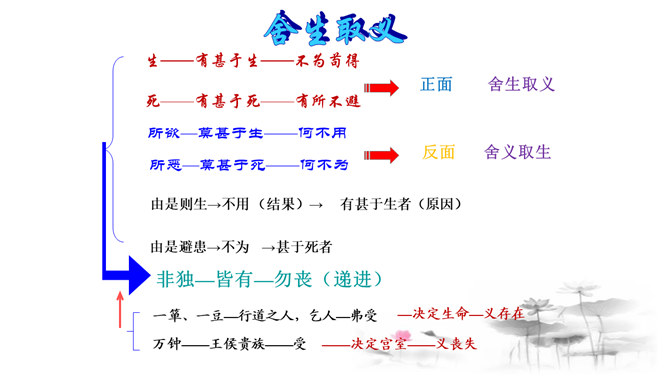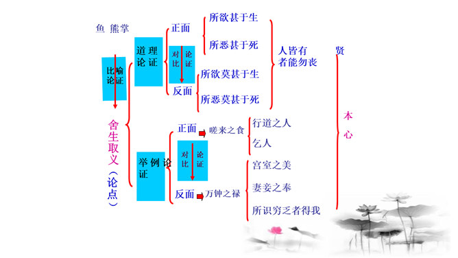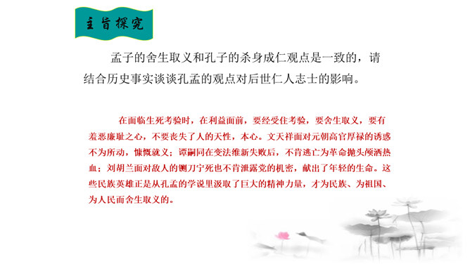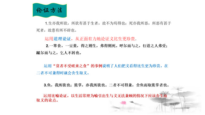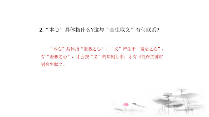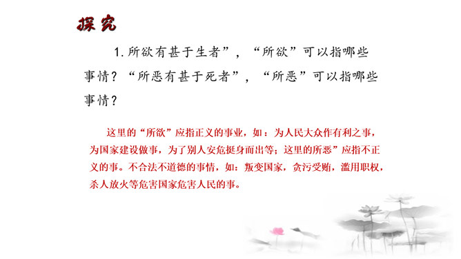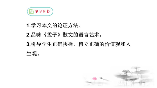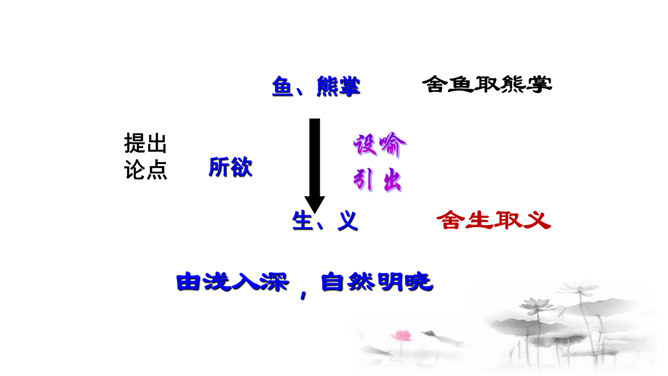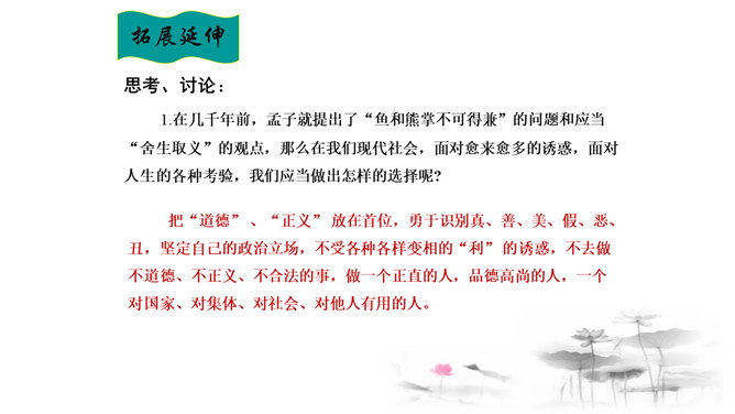 把“道德” 、“正义” 放在首位,勇于识别真、善、美、假、恶、丑,坚定自己的政治立场,不受各种各样变相的“利” 的诱惑。孟子以自己的行为实践着自己的人生主张,孱弱的身躯担负着民族的大义。面对散发着孟子生命气息的文字,我们的心中充满了崇敬,但却不要认为高不可及。舍生取义,是这样的崇高与豁达,是这样的平凡与伟大;这是男儿舍身报国的壮志雄心,这是中华儿女报效母亲的赤胆忠心,更是我们建设和谐社会的行为准则。让我们高吟《鱼我所欲也》,保持自己固有的本心,谱写现实生活的舍生取义的壮丽篇章。所属专题:鱼我所欲也ppt。