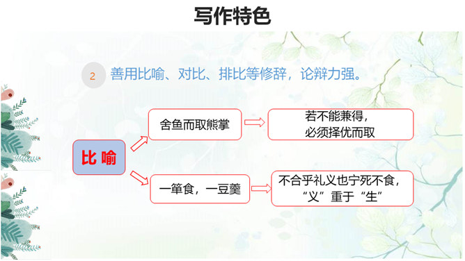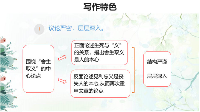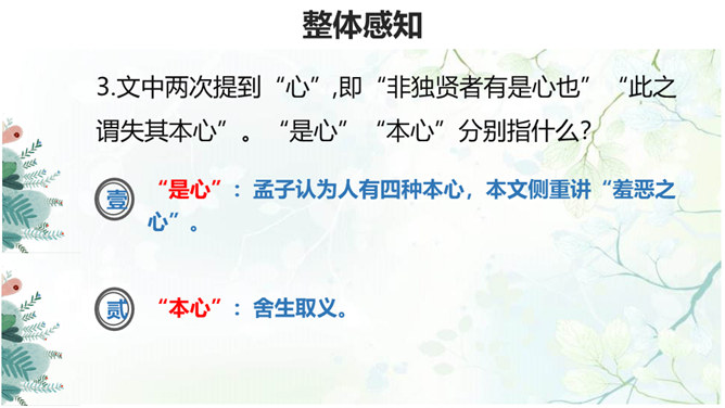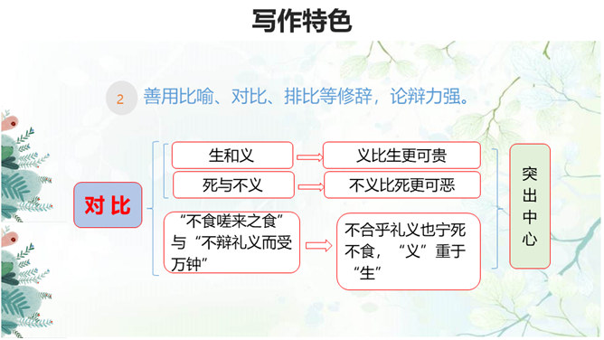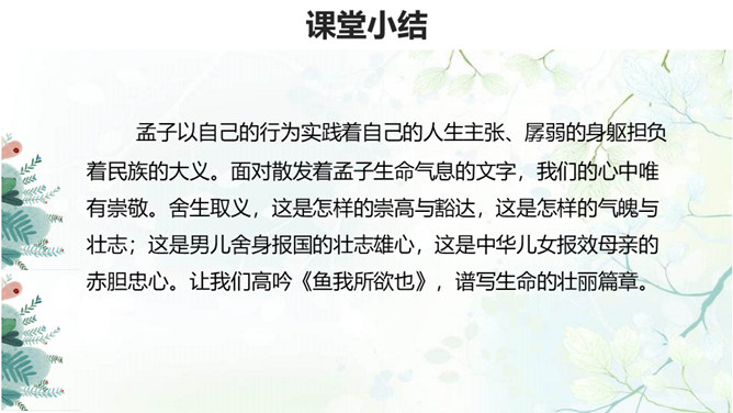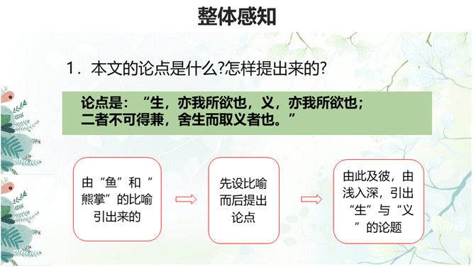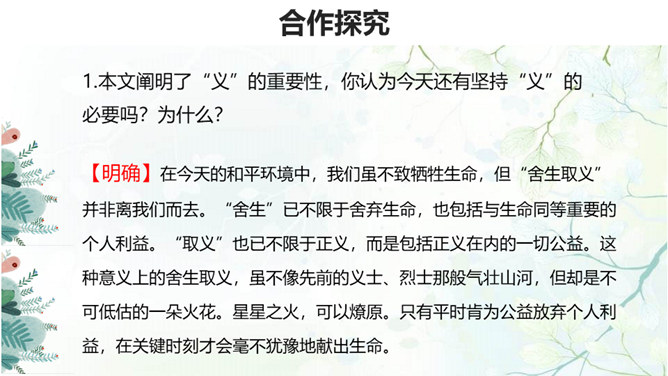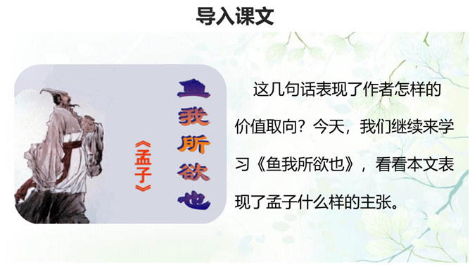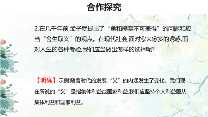 本文阐明了“义”的重要性,你认为今天还有坚持“义”的必要吗?为什么?在今天的和平环境中,我们虽不致牺牲生命,但“舍生取义”并非离我们而去。“舍生”已不限于舍弃生命,也包括与生命同等重要的个人利益。“取义”也已不限于正义,而是包括正义在内的一切公益。这种意义上的舍生取义,虽不像先前的义士、烈士那般气壮山河,但却是不可低估的一朵火花。星星之火,可以燎原。只有平时肯为公益放弃个人利益,在关键时刻才会毫不犹豫地献出生命。请以“义与利”为话题写一篇文章。所属专题:鱼我所欲也ppt。