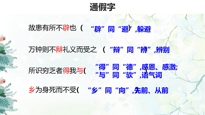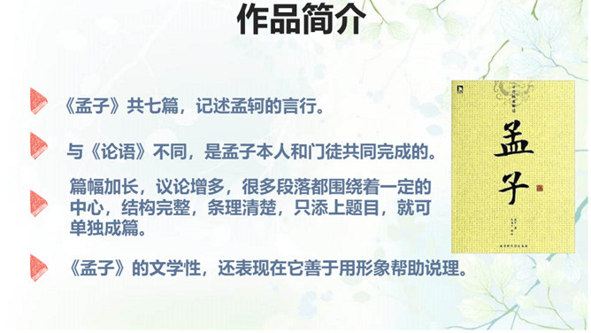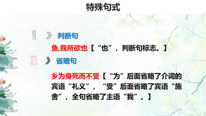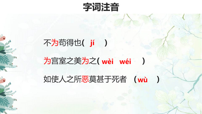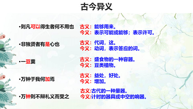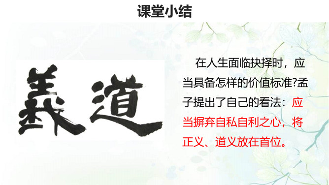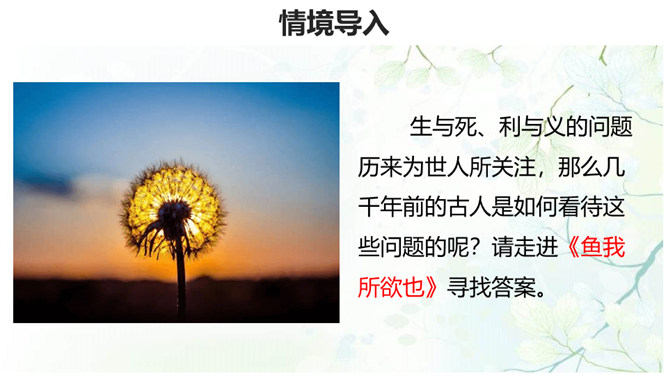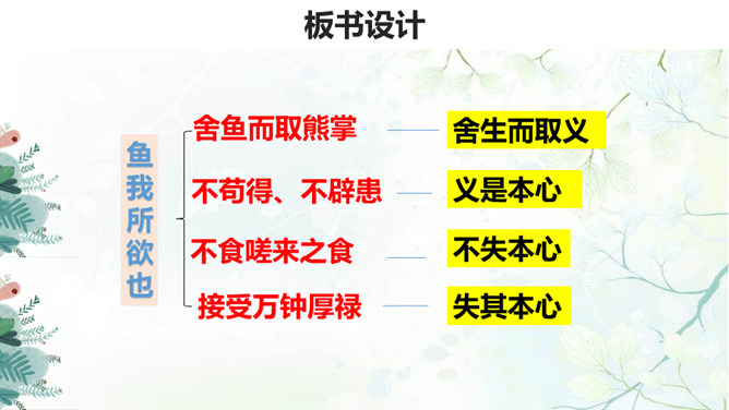 生与死、利与义的问题历来为世人所关注,那么几千年前的古人是如何看待这些问题的呢?在人生面临抉择时,应当具备怎样的价值标准?孟子提出了自己的看法:应当摒弃自私自利之心,将正义、道义放在首位。1.背诵课文。 2.理清本文的论证思路,画出全文结构提纲。《孟子》共七篇,记述孟轲的言行。与《论语》不同,是孟子本人和门徒共同完成的。篇幅加长,议论增多,很多段落都围绕着一定的中心,结构完整,条理清楚,只添上题目,就可单独成篇。《孟子》的文学性,还表现在它善于用形象帮助说理。所属专题:鱼我所欲也ppt。