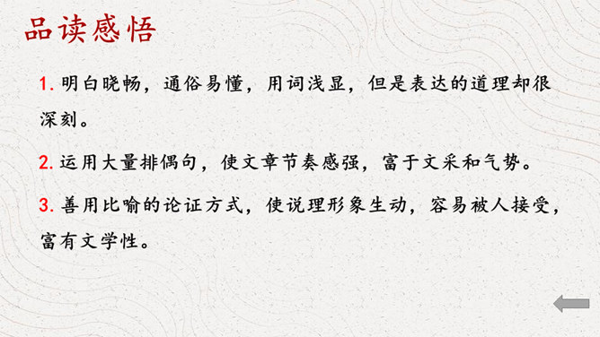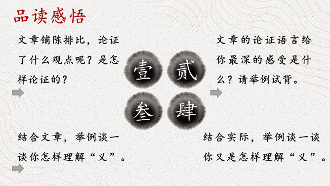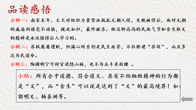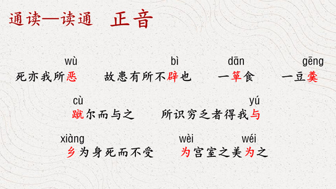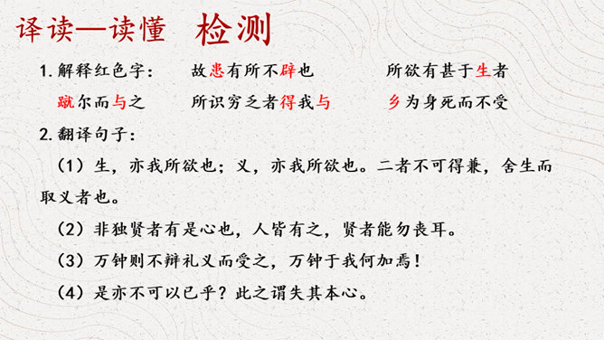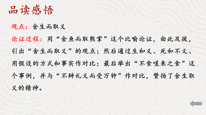 同学们认识这个字吗?这个字就是“义”,你看这个字的写法,上面是一个“羊”字,下面是一个“我”字,甲骨文中的“羊”表示祭牲,“我”是兵器,又表示仪仗。合而会意,“义”的本义就是指杀牲祭祀的礼仪或仪式,引申指公正合宜的道理或举动。如:正义;义不容辞。那怎样才算是公正合宜的举动呢?怎样的表现才算是“义”呢?下面我们就走进课文,一起来寻找答案。1.借助注释,自读自译 ,圈出疑难。2.小组讨论,标划疑难,代表发言。文章铺陈排比,论证了什么观点呢?是怎样论证的?所属专题:鱼我所欲也ppt。