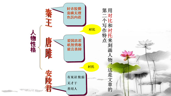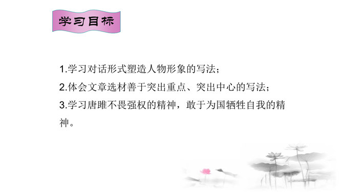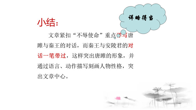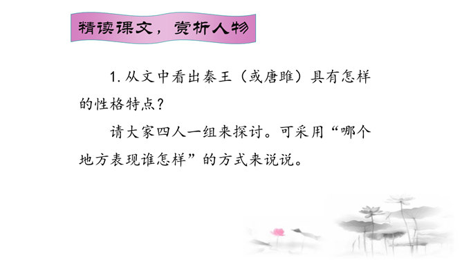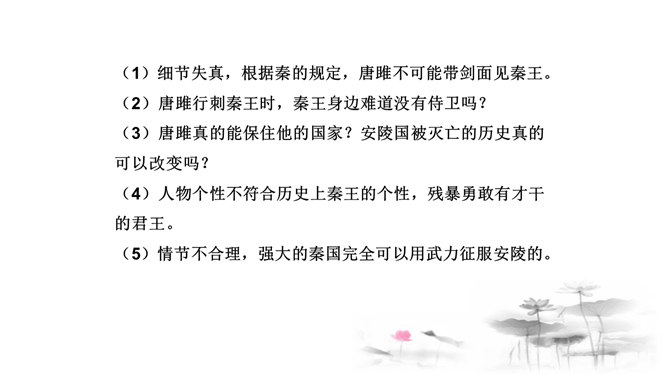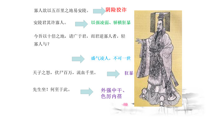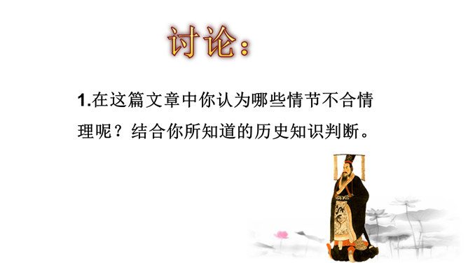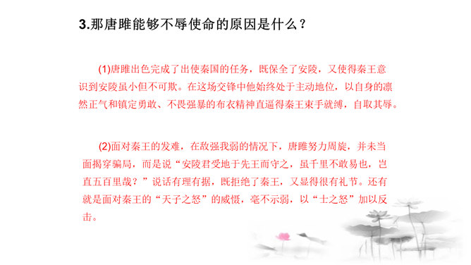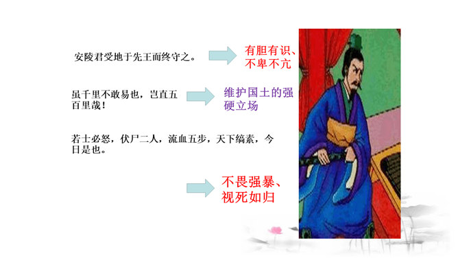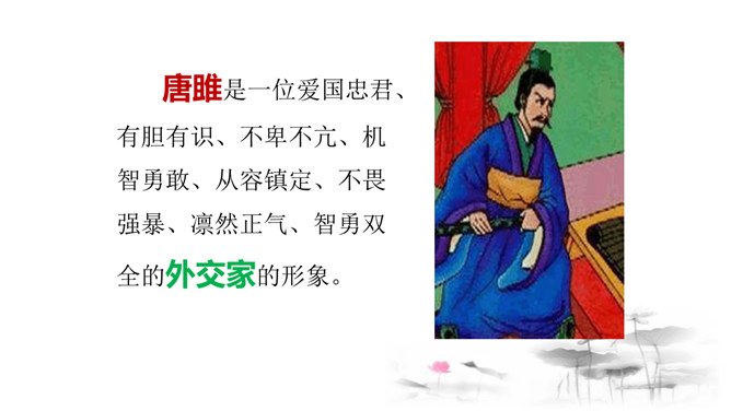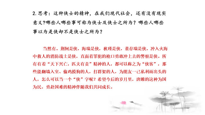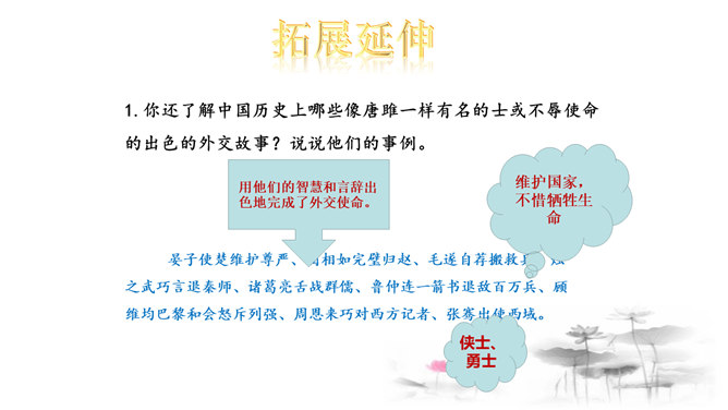 思考:这种侠士的精神,在我们现代社会,还有没有现实意义?哪些人哪些事可称为侠士及侠士之所为?哪些人哪些事以为是侠却不是侠士之所为?当然有。荆轲是侠,海瑞是侠,秋瑾是侠,董存瑞是侠,冲入火海中救人的消防战士是侠,直面着罪犯的枪口勇敢冲上去的警察是侠。所有有着“天下兴亡,匹夫有责”精神的人,都可以称之为“侠客”,那些能翻墙入室、偷鸡摸狗的人,打群架的人,为朋友一己私利而出头的人,怎么可以当一个“侠”字呢?希望今后的岁月里,唐雎的这种为国为民,勇赴国难的精神伴随我们共同成长。所属专题:唐雎不辱使命ppt。