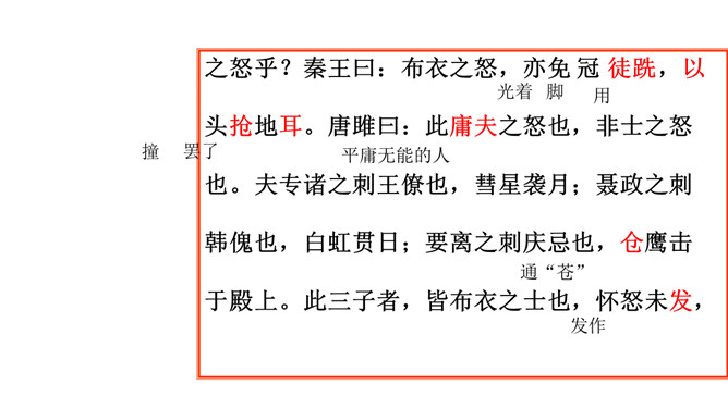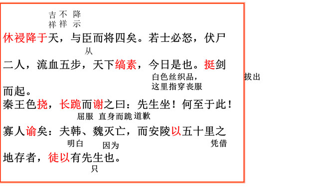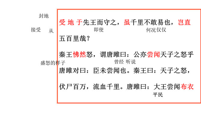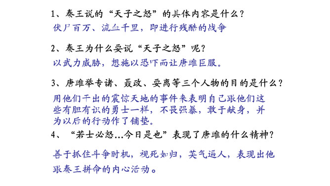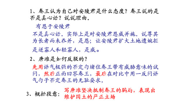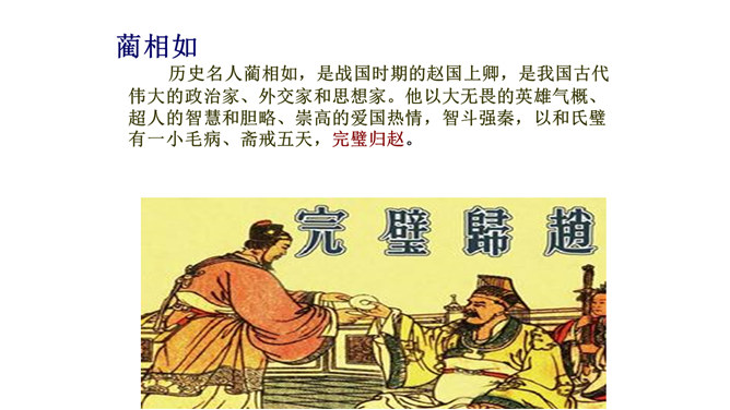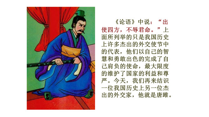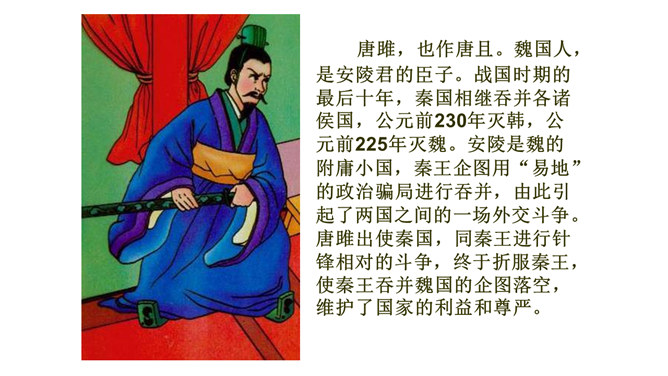 历史名人蔺相如,是战国时期的赵国上卿,是我国古代伟大的政治家、外交家和思想家。他以大无畏的英雄气概、超人的智慧和胆略、崇高的爱国热情,智斗强秦,以和氏璧有一小毛病、斋戒五天,完璧归赵。诸葛亮不仅是一位伟大的政治家、军事家,也是一位杰出的外交家。诸葛亮前往江东促成孙刘联盟时,舌战群儒,用外交手段建立了孙刘联合抗曹统一战线,后来更是取得赤壁大战的胜利,粉碎了曹操一举南下的企图,保存和壮大了刘备集团的势力,为鼎立一方奠定了坚实的基础。今天,我们再来结识一位我国历史上另一位杰出的外交家,他就是唐雎。所属专题:唐雎不辱使命ppt。