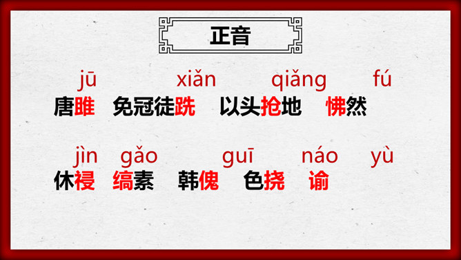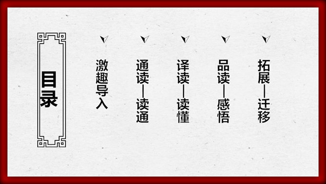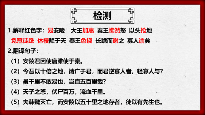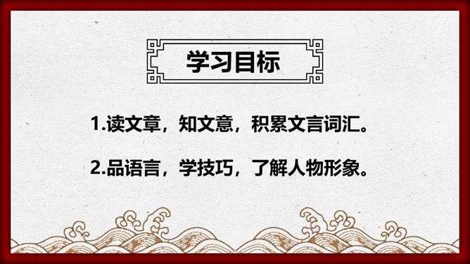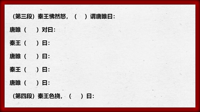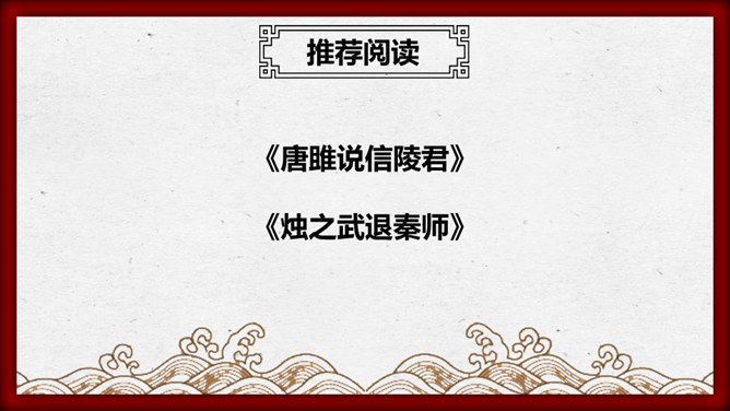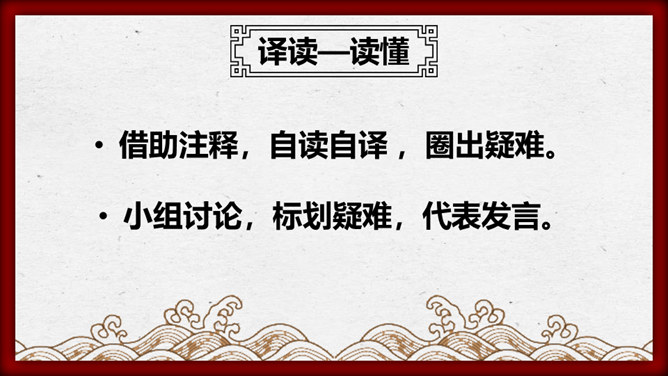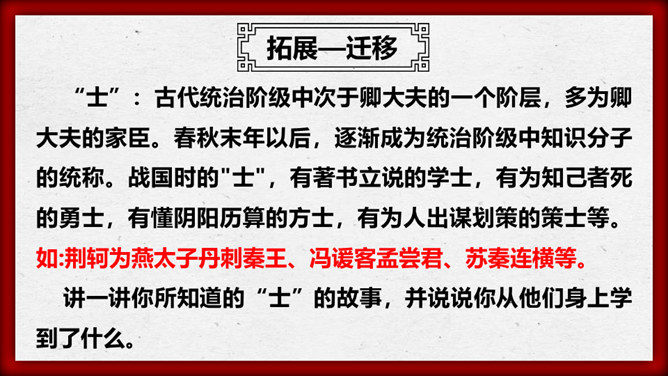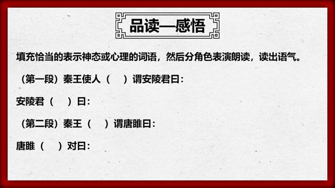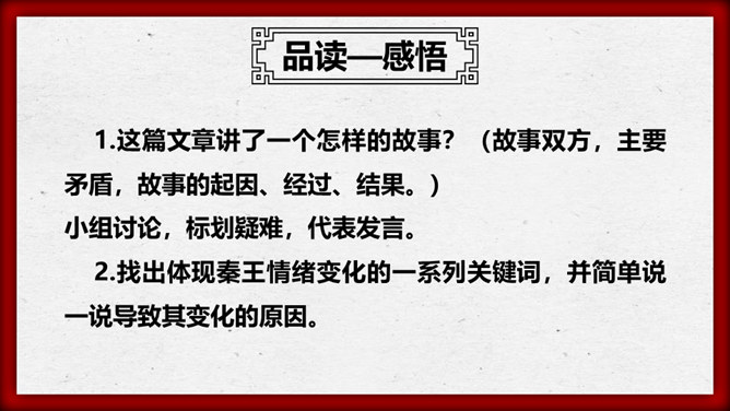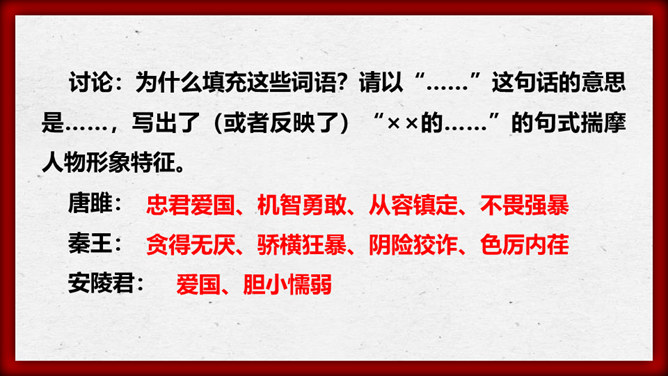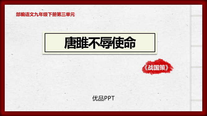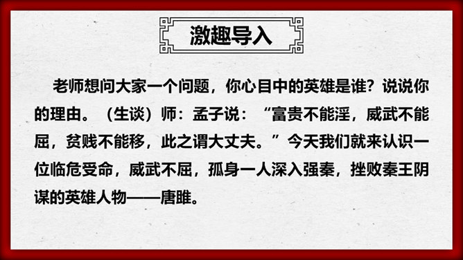 1.读文章,知文意,积累文言词汇。2.品语言,学技巧,了解人物形象。老师想问大家一个问题,你心目中的英雄是谁?说说你的理由。(生谈)师:孟子说:“富贵不能淫,威武不能屈,贫贱不能移,此之谓大丈夫。”今天我们就来认识一位临危受命,威武不屈,孤身一人深入强秦,挫败秦王阴谋的英雄人物——唐雎。借助注释,自读自译 ,圈出疑难。小组讨论,标划疑难,代表发言。这篇文章讲了一个怎样的故事?(故事双方,主要矛盾,故事的起因、经过、结果。)小组讨论,标划疑难,代表发言。所属专题:唐雎不辱使命ppt。