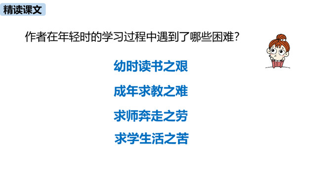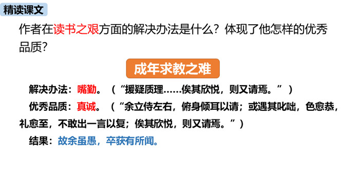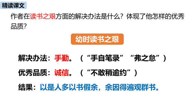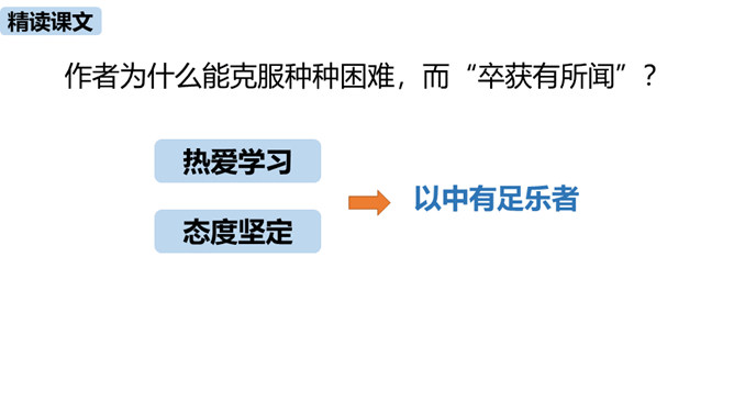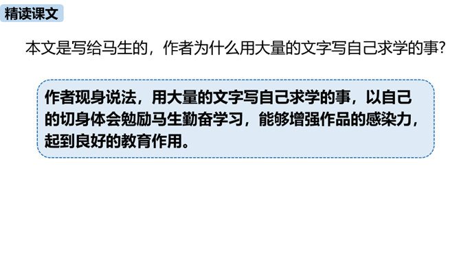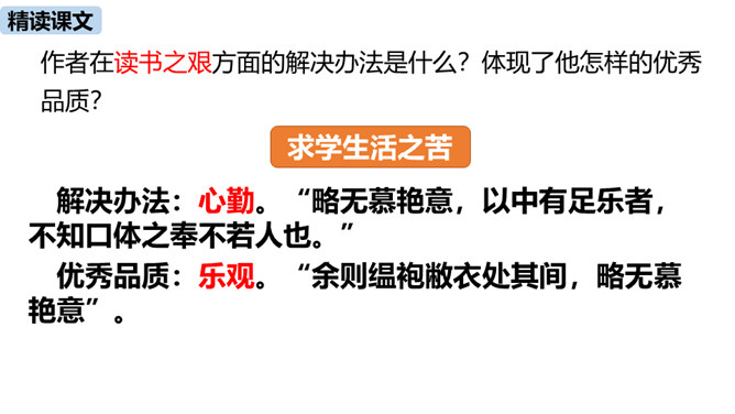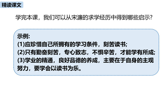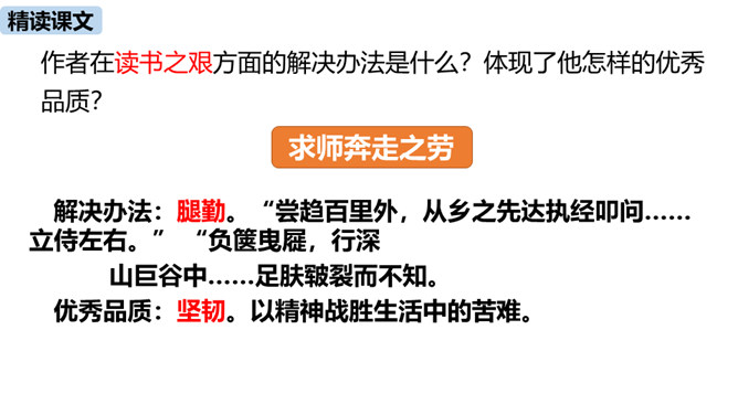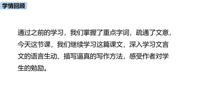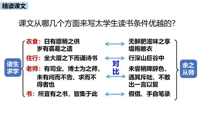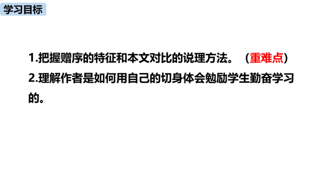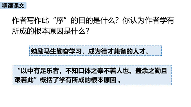 1.把握赠序的特征和本文对比的说理方法。(重难点)2.理解作者是如何用自己的切身体会勉励学生勤奋学习的。通过之前的学习,我们掌握了重点字词,疏通了文意,今天这节课,我们继续学习这篇课文,深入学习文言文的语言生动、描写逼真的写作方法,感受作者对学生的勉励。作者通过对比想说明什么道理?通过对比,说明了学习条件的好坏对学习效果没有决定性的影响。成功的重要因素是求学者的态度:要“勤且艰”,要勤奋,要舍得吃苦,要有恒心。作者写作此“序”的目的是什么?你认为作者学有所成的根本原因是什么?所属专题:送东阳马生序ppt。