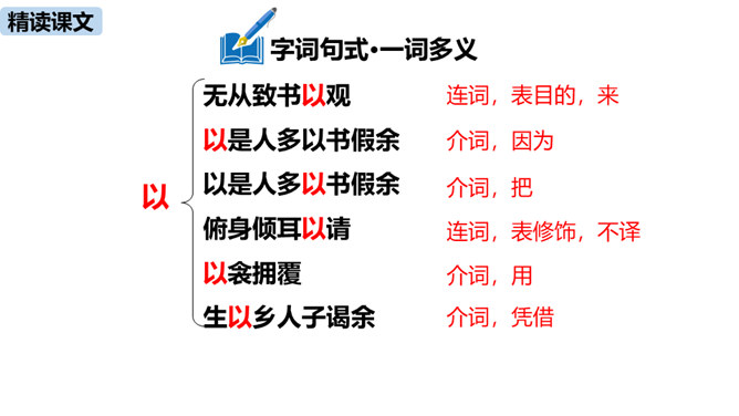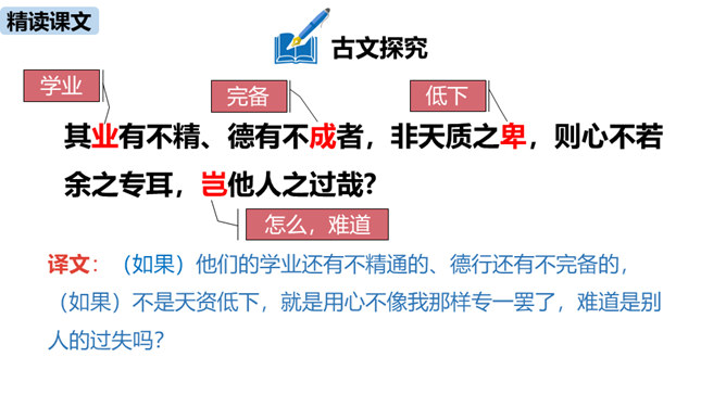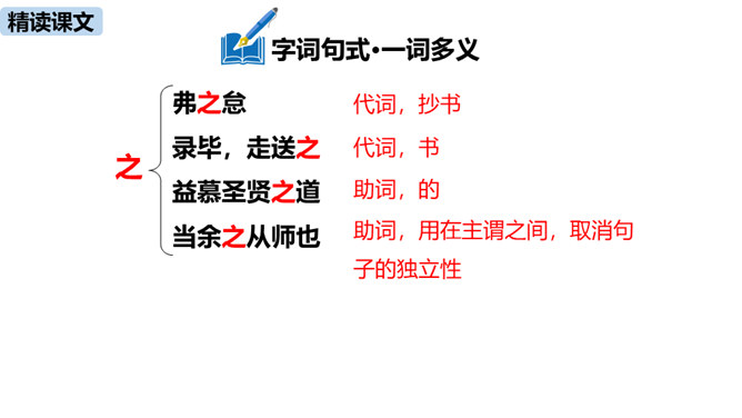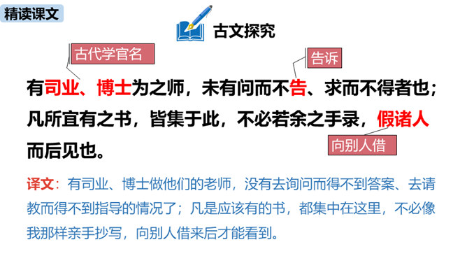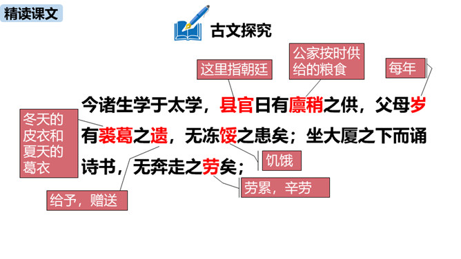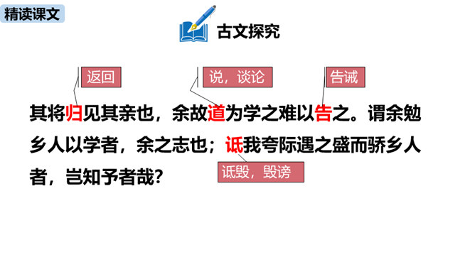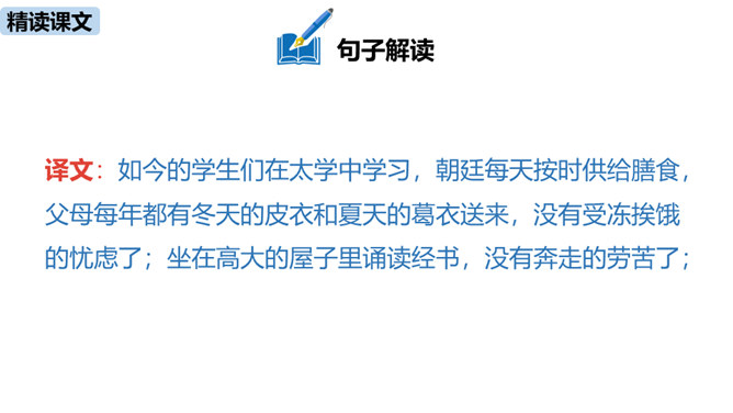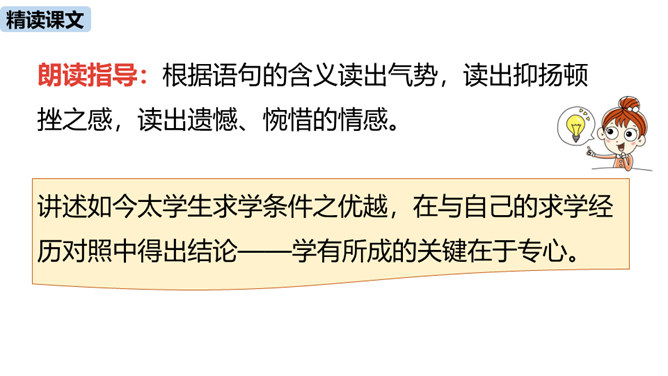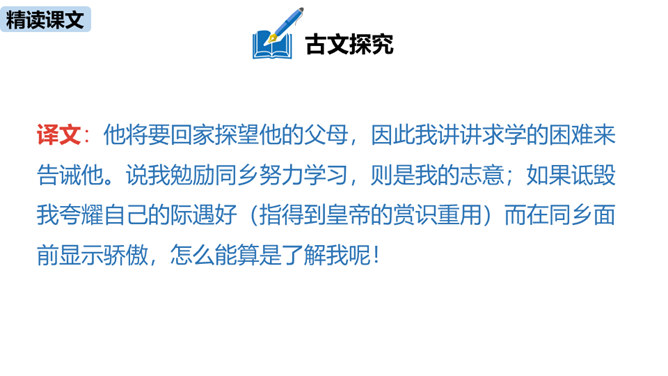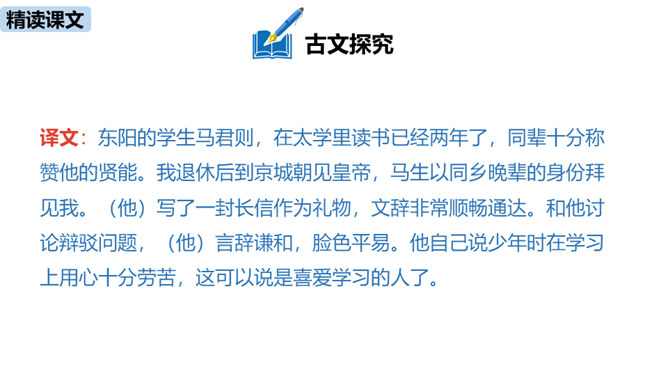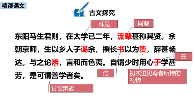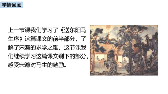 1.疏通文意。(重点)2.理解、掌握课文中的重点词语和句式。(难点)朗读指导:根据语句的含义读出气势,读出抑扬顿挫之感,读出遗憾、惋惜的情感。讲述如今太学生求学条件之优越,在与自己的求学经历对照中得出结论——学有所成的关键在于专心。朗读指导:对马生的褒奖的句子,要读出赞许的感情;叙述作者写作目的的句子,语气要平和;最后抒发作者情感、表露心迹的句子,读时语调稍高,最后一句语调最高。讲述和后辈马生的交往,点明作者写这篇文章的目的。所属专题:送东阳马生序ppt。