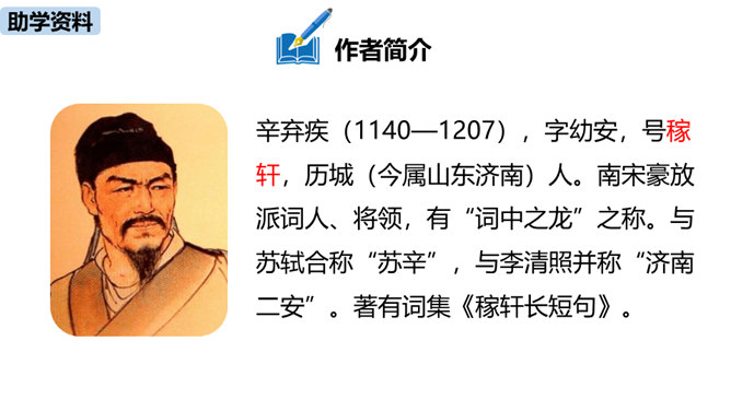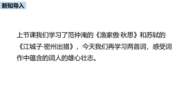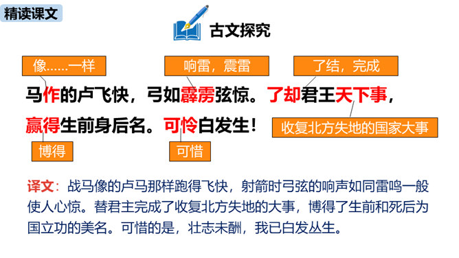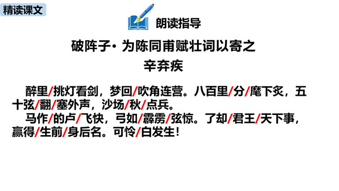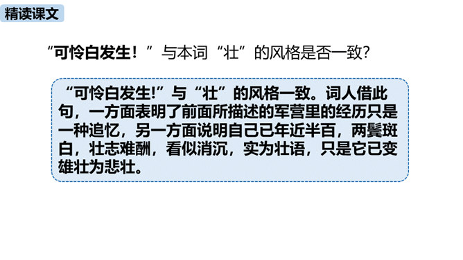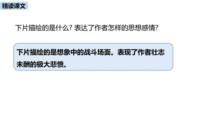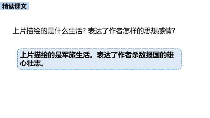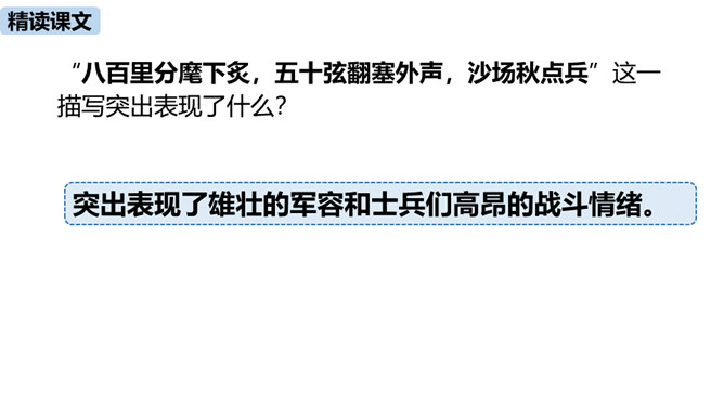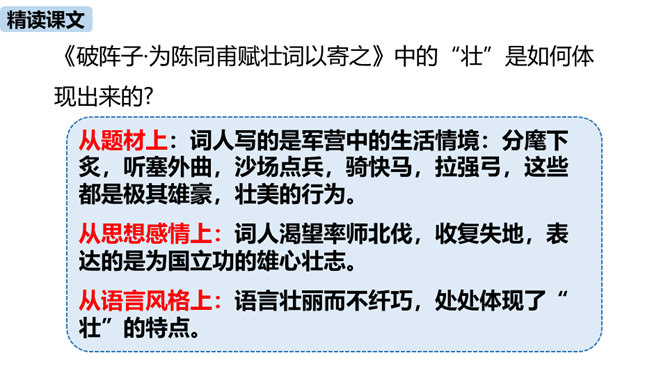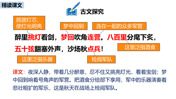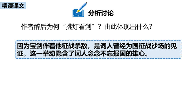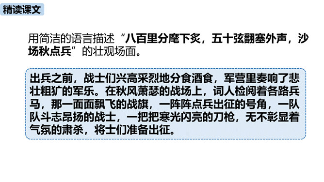 理解诗的凝练、含蓄的语言以及多种修辞手法。作者醉后为何“挑灯看剑”?由此体现出什么?因为宝剑伴着他征战杀敌,是词人曾经为国征战沙场的见证。这一举动隐含了词人念念不忘报国的雄心。用简洁的语言描述“八百里分麾下炙,五十弦翻塞外声,沙场秋点兵”的壮观场面。出兵之前,战士们兴高采烈地分食酒食,军营里奏响了悲壮粗犷的军乐。在秋风萧瑟的战场上,词人检阅着各路兵马,那一面面飘飞的战旗,一阵阵点兵出征的号角,一队队斗志昂扬的战士,一把把寒光闪亮的刀枪,无不彰显着气氛的肃杀,将士们准备出征。