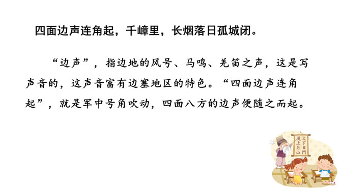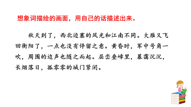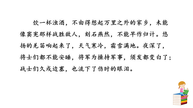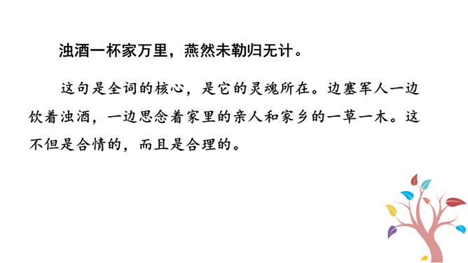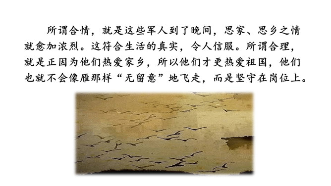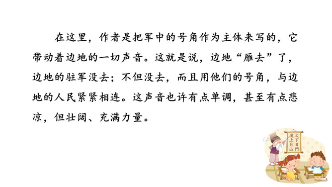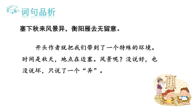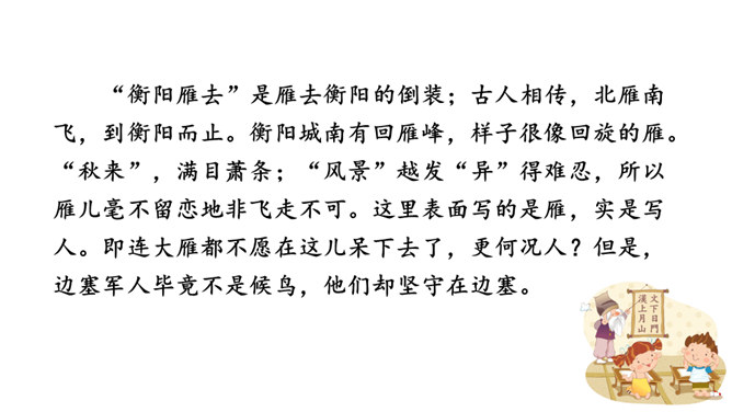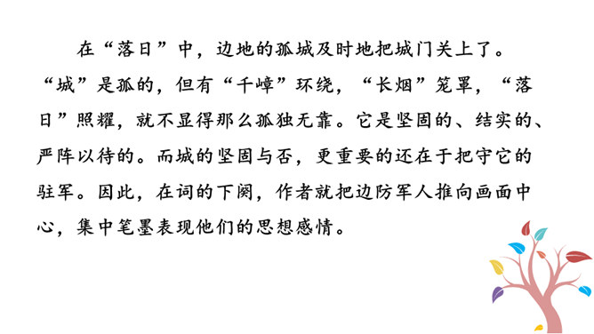 他们忧虑国家的安全,抱怨朝廷无人整顿武备,更为当局没有一个正确的方针政策而愤懑,以致边防军人久住“塞下”,将老,却不能退休家园,兵少,却不能与妻子团圆。这首边塞词既表现将军的英雄气概及征夫的艰苦生活,也暗寓对宋王朝重内轻外政策的不满。爱国激情,浓重乡思,兼而有之,构成了将军与征夫思乡却渴望建功立业的复杂而又矛盾的情绪。这种情绪主要是通过全词景物的描写,气氛的渲染,婉曲地传达出来。综观全词,意境开阔苍凉,形象生动鲜明,反映出作者耳闻目睹、亲身经历的场景,表达了作者自己和戍边将士们的内心感情。所属专题:渔家傲秋思ppt。