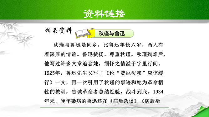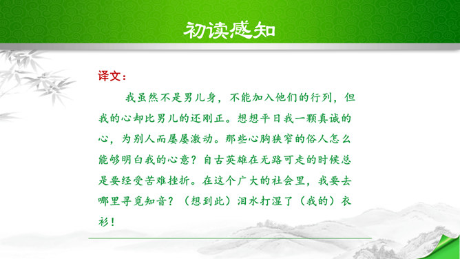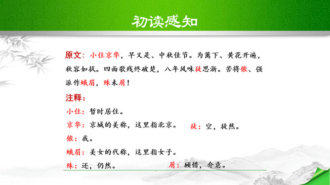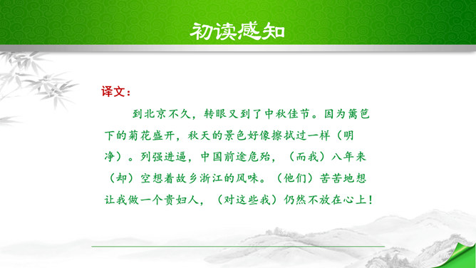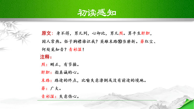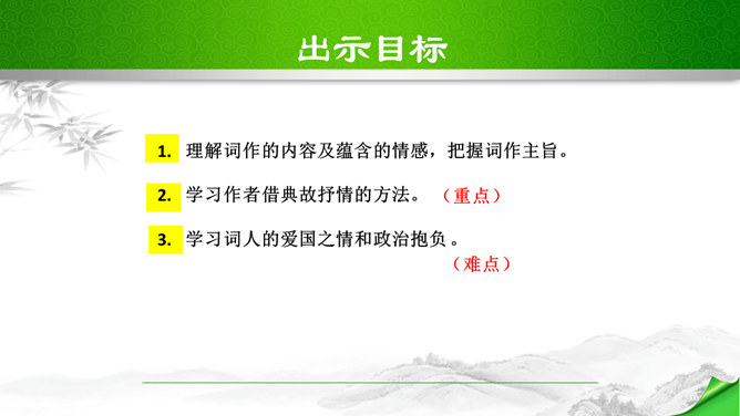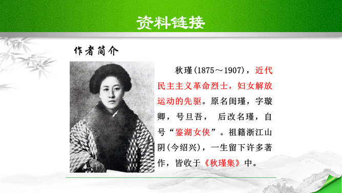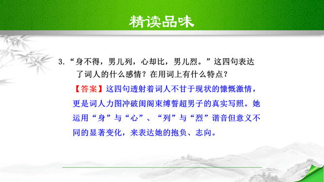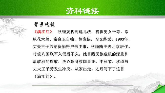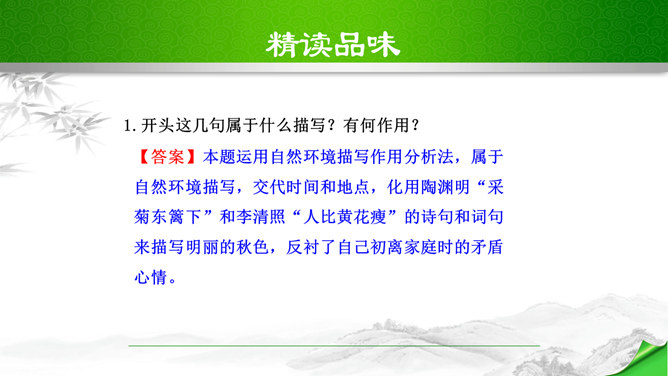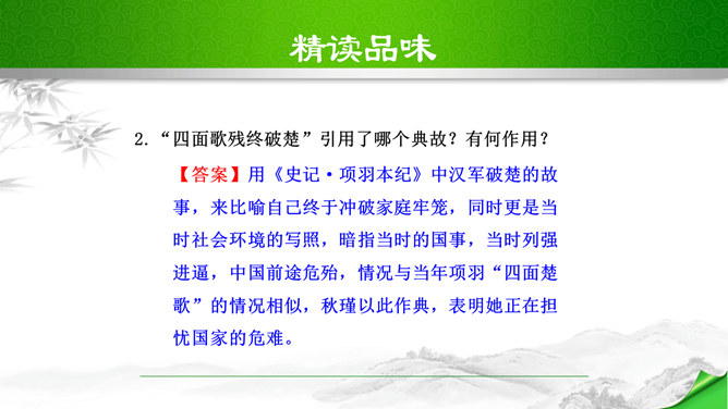 开头这几句属于什么描写?有何作用?本题运用自然环境描写作用分析法,属于自然环境描写,交代时间和地点,化用陶渊明“采菊东篱下”和李清照“人比黄花瘦”的诗句和词句来描写明丽的秋色,反衬了自己初离家庭时的矛盾心情。“四面歌残终破楚”引用了哪个典故?有何作用?用《史记·项羽本纪》中汉军破楚的故事,来比喻自己终于冲破家庭牢笼,同时更是当时社会环境的写照,暗指当时的国事,当时列强进逼,中国前途危殆,情况与当年项羽“四面楚歌”的情况相似,秋瑾以此作典,表明她正在担忧国家的危难。所属专题:满江红ppt。