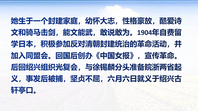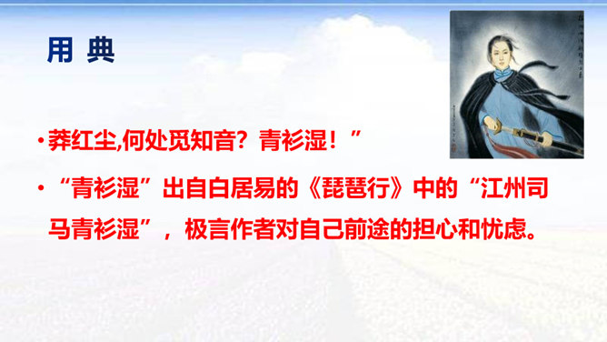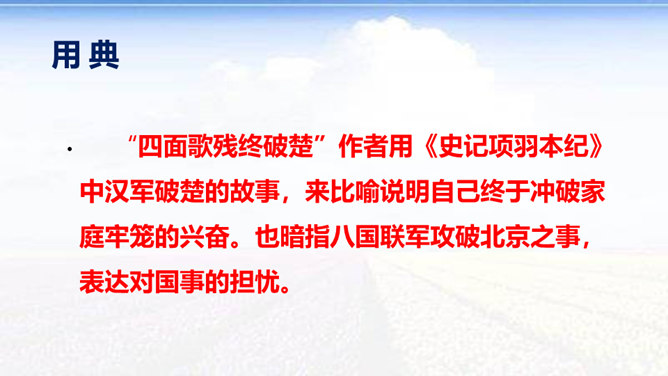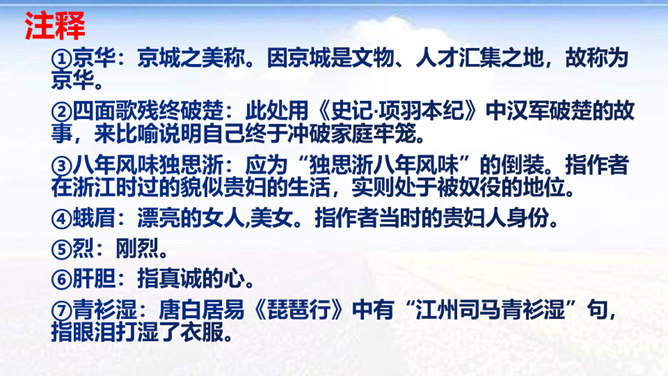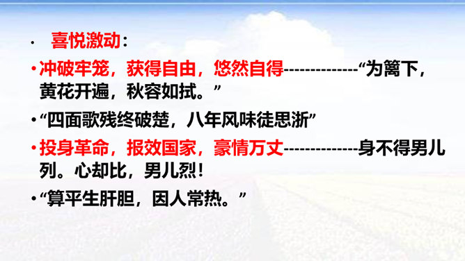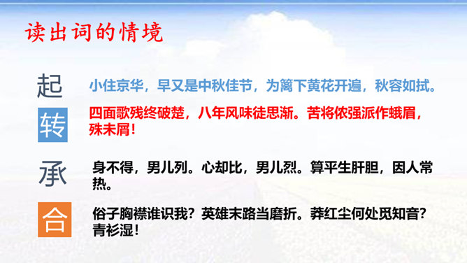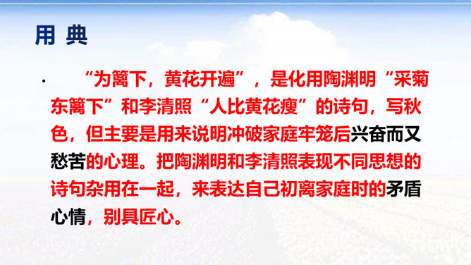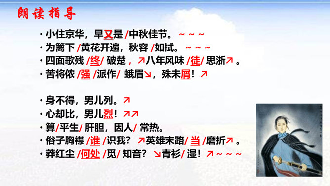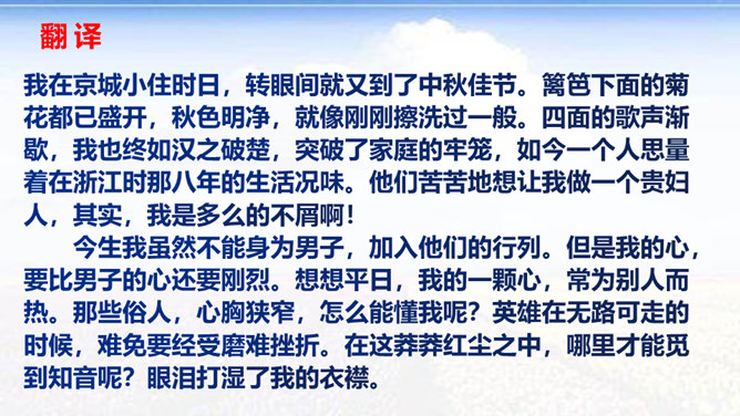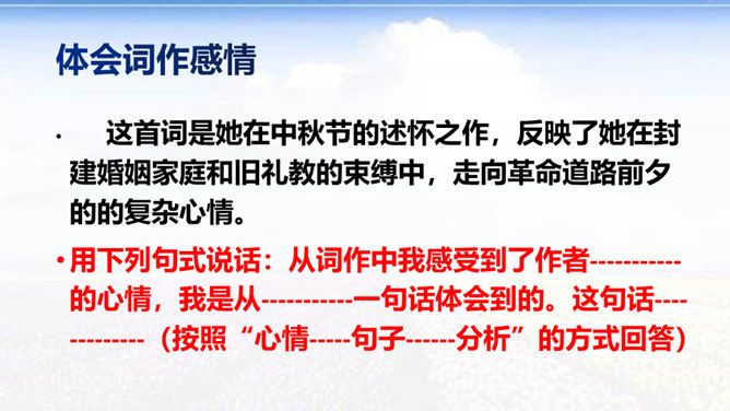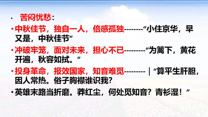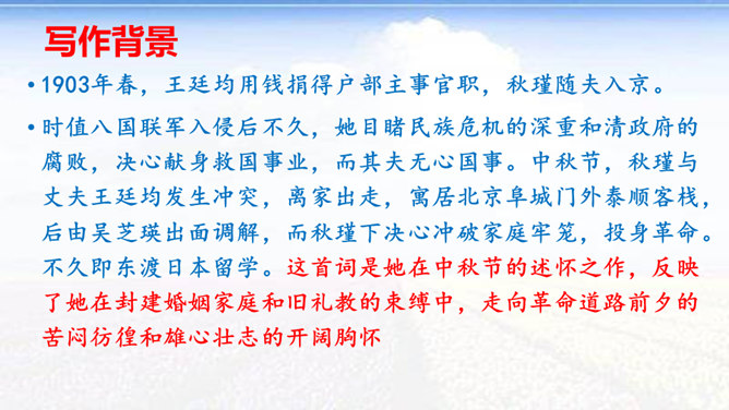 时值八国联军入侵后不久,她目睹民族危机的深重和清政府的腐败,决心献身救国事业,而其夫无心国事。中秋节,秋瑾与丈夫王廷均发生冲突,离家出走,寓居北京阜城门外泰顺客栈,后由吴芝瑛出面调解,而秋瑾下决心冲破家庭牢笼,投身革命。不久即东渡日本留学。这首词是她在中秋节的述怀之作,反映了她在封建婚姻家庭和旧礼教的束缚中,走向革命道路前夕的苦闷彷徨和雄心壮志的开阔胸怀 。“为篱下,黄花开遍”,是化用陶渊明“采菊东篱下”和李清照“人比黄花瘦”的诗句,写秋色,但主要是用来说明冲破家庭牢笼后兴奋而又愁苦的心理。