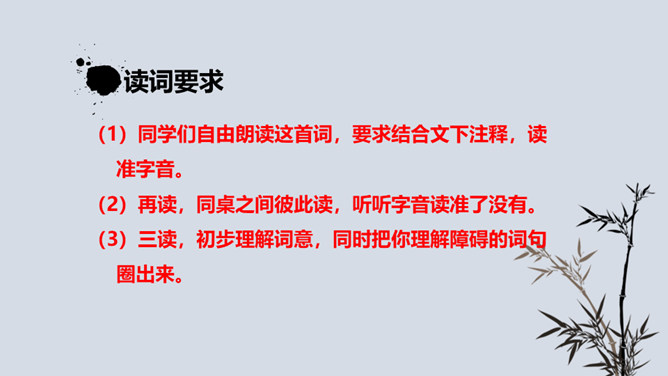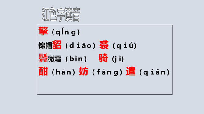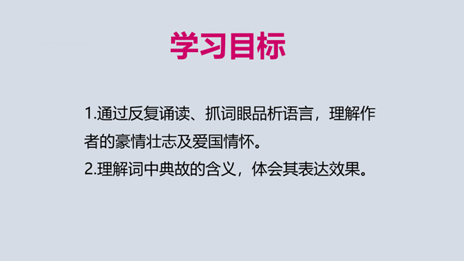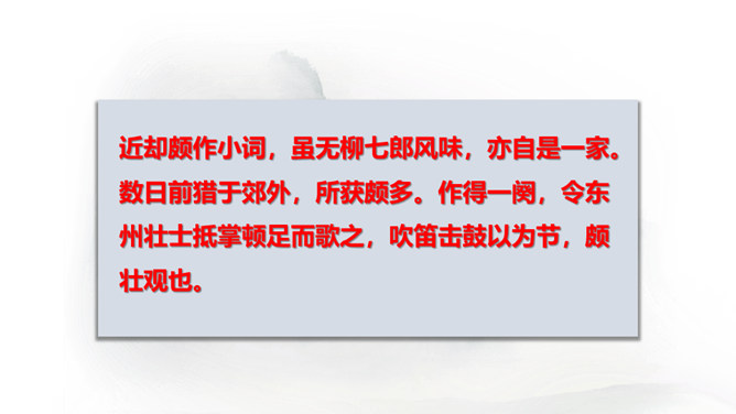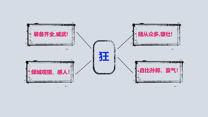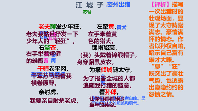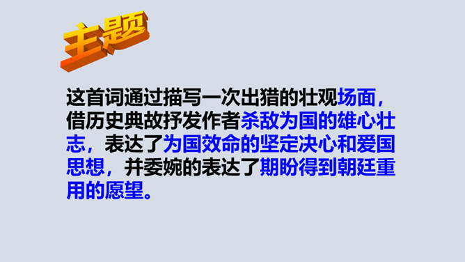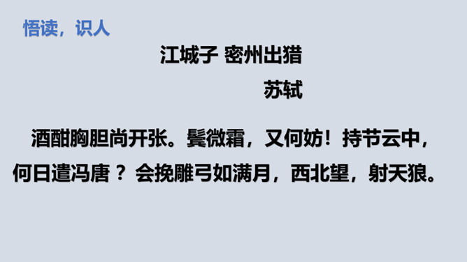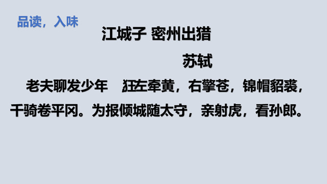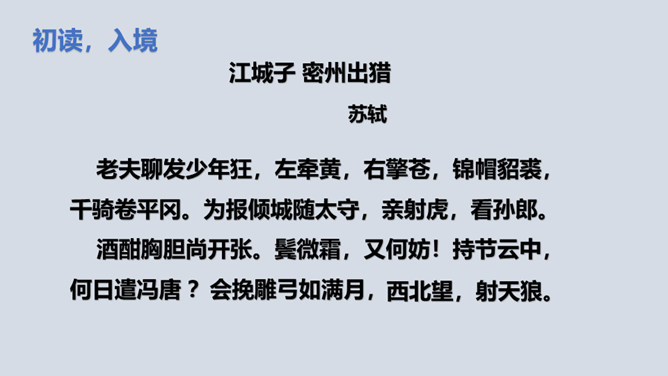 1.通过反复诵读、抓词眼品析语言,理解作者的豪情壮志及爱国情怀。2.理解词中典故的含义,体会其表达效果。(1)同学们自由朗读这首词,要求结合文下注释,读准字音。(2)再读,同桌之间彼此读,听听字音读准了没有。(3)三读,初步理解词意,同时把你理解障碍的词句圈出来。描写一次出猎时的壮观场面,显现了太守踌躇满志、豪情满怀的情态。作者以孙权自喻,暗示自己富有雄才大略。“聊”“狂”既突出了豪壮气势,也透露出隐隐约约的怨愤之情。所属专题:江城子·密州出猎ppt。