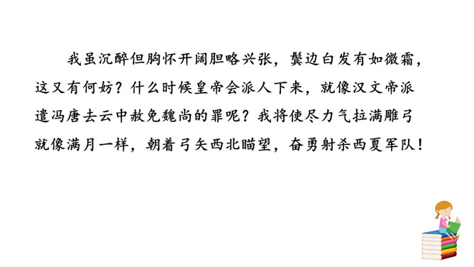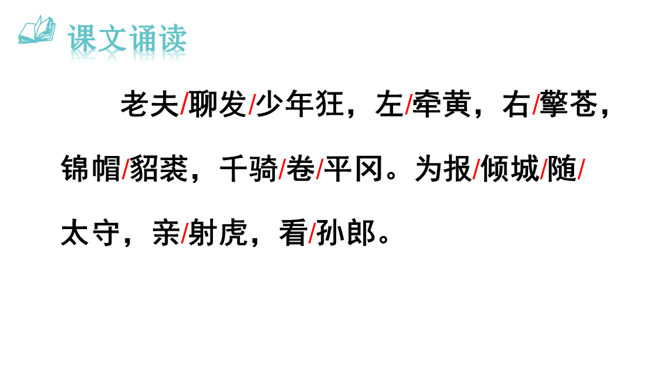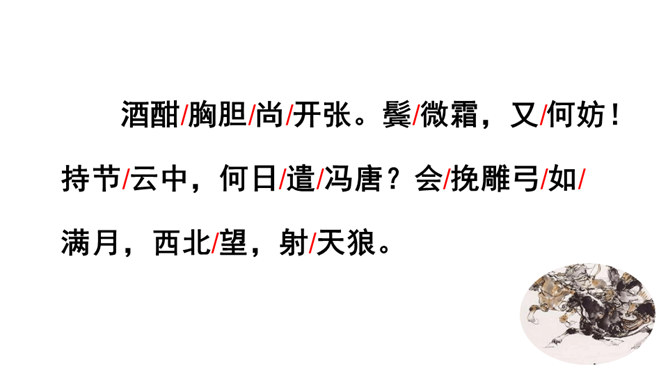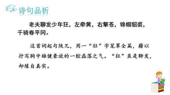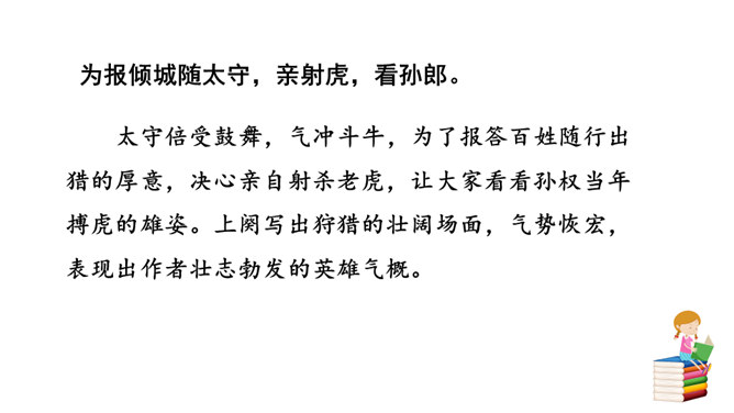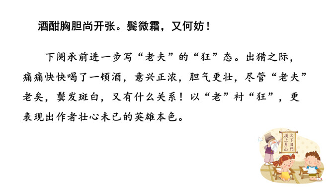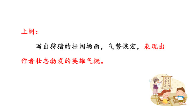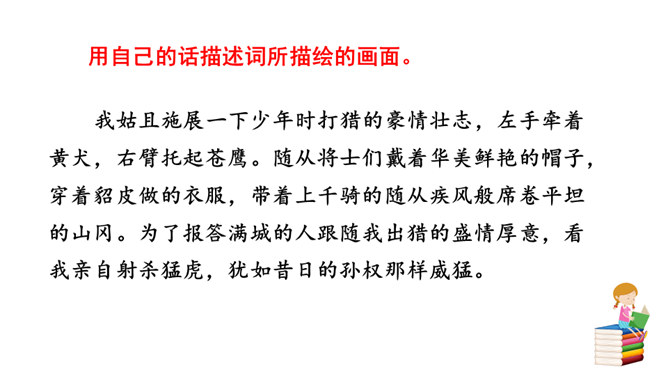 用自己的话描述词所描绘的画面。我姑且施展一下少年时打猎的豪情壮志,左手牵着黄犬,右臂托起苍鹰。随从将士们戴着华美鲜艳的帽子,穿着貂皮做的衣服,带着上千骑的随从疾风般席卷平坦的山冈。为了报答满城的人跟随我出猎的盛情厚意,看我亲自射杀猛虎,犹如昔日的孙权那样威猛。我虽沉醉但胸怀开阔胆略兴张,鬓边白发有如微霜,这又有何妨?什么时候皇帝会派人下来,就像汉文帝派遣冯唐去云中赦免魏尚的罪呢?我将使尽力气拉满雕弓就像满月一样,朝着弓矢西北瞄望,奋勇射杀西夏军队!所属专题:江城子·密州出猎ppt。