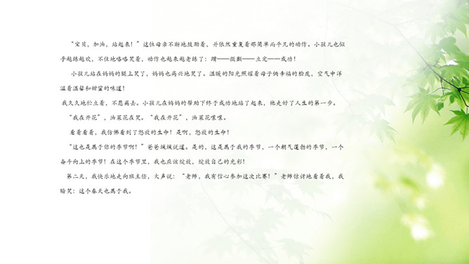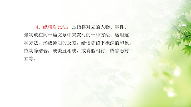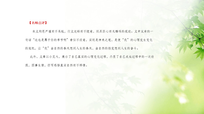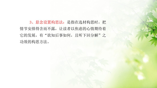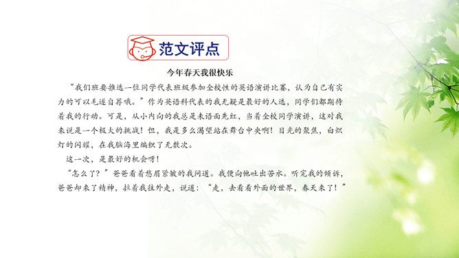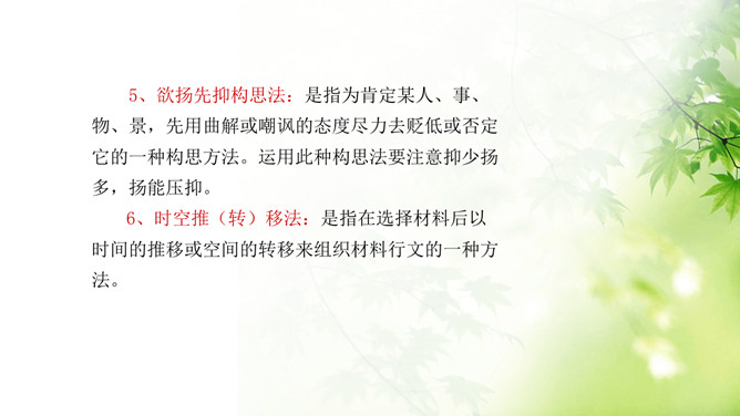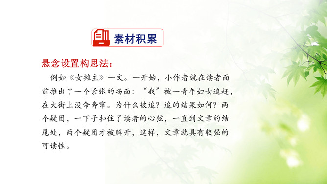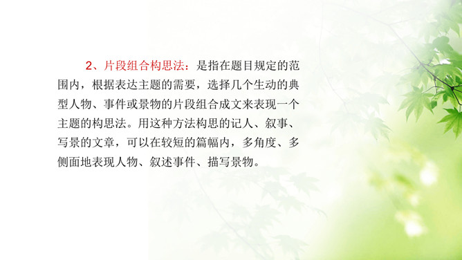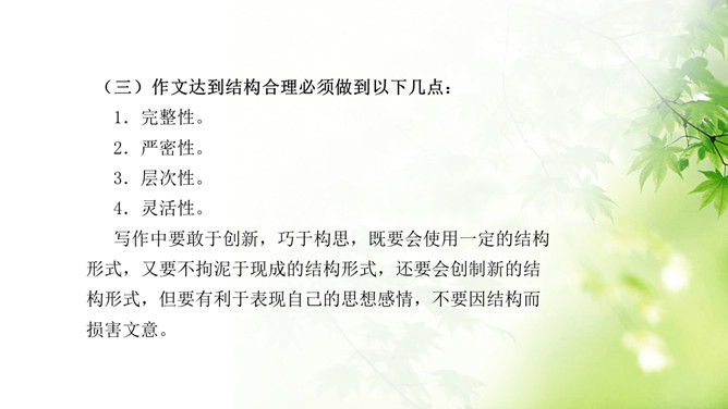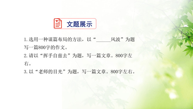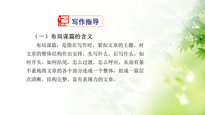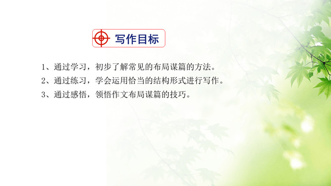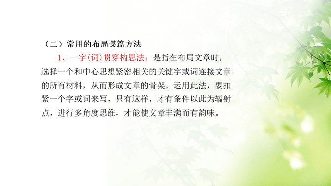 通过练习,学会运用恰当的结构形式进行写作。通过感悟,领悟作文布局谋篇的技巧。在写作时,紧扣文章的主题,对文章的整体结构作出安排,先写什么,后写什么,如何开头,如何结尾,怎么过渡,怎么呼应,从而有条不紊地将文章的各个部分连成一个整体,组成一篇层次清晰、结构完整、富有表现力的文章。一字(词)贯穿构思法:是指在布局文章时,选择一个和中心思想紧密相关的关键字或词连接文章的所有材料,从而形成文章的骨架。运用此法,要扣紧一个字或词来写,只有这样,才有条件以此为辐射点,进行多角度思维,才能使文章丰满而有韵味。所属专题:布局谋篇ppt。