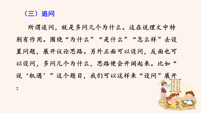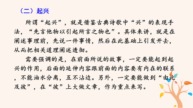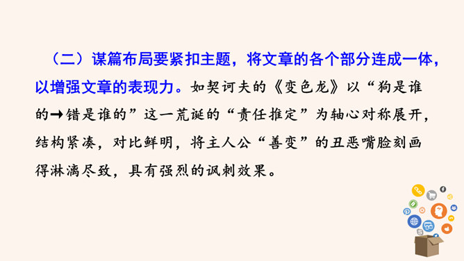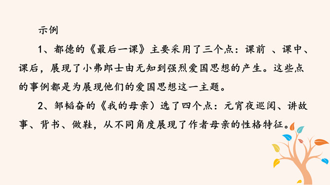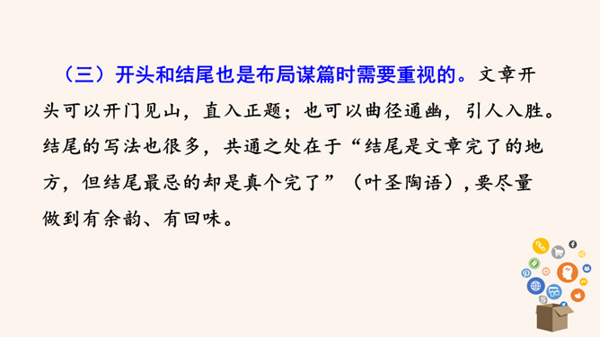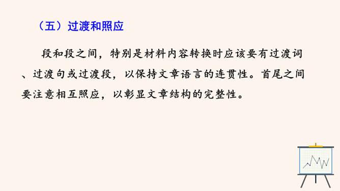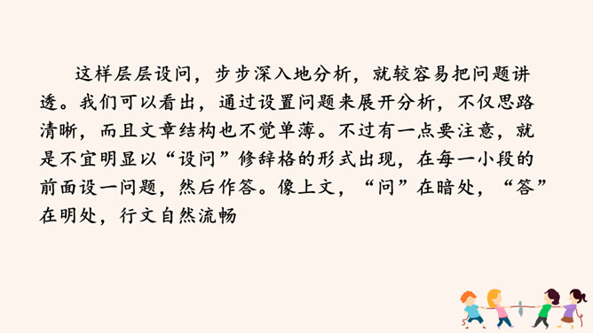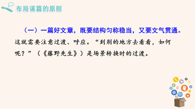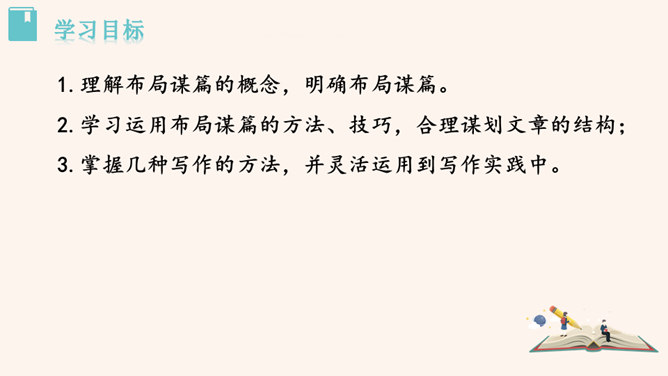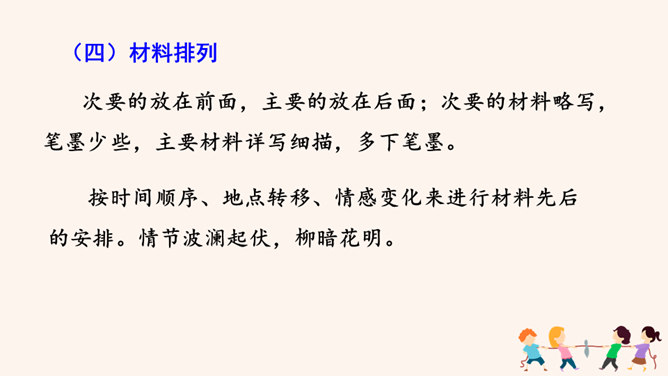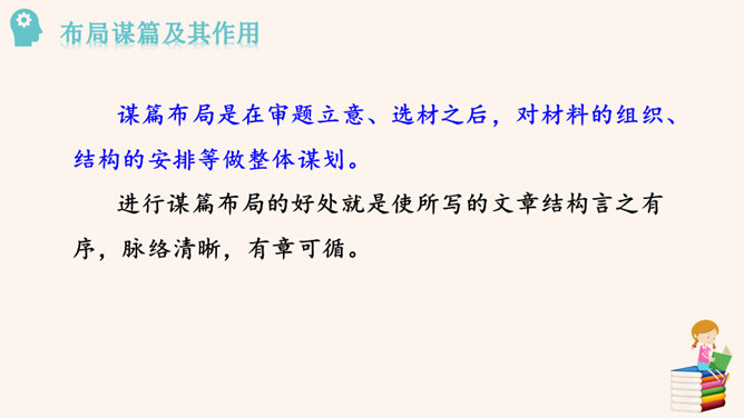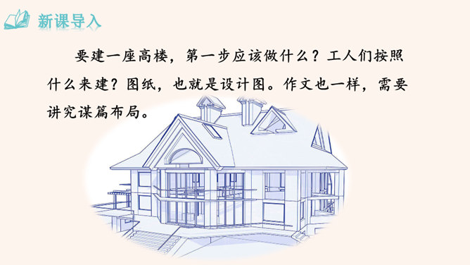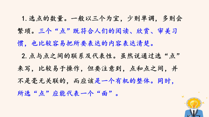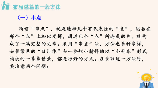 要建一座高楼,第一步应该做什么?工人们按照什么来建?图纸,也就是设计图。作文也一样,需要讲究谋篇布局。所谓“串点”,就是选择几个有代表性的“点”,然后在那个“点”上加以发挥,通过几个“点”所连成的片,就构成了一篇完整的文章。采用“串点”法,方法也多种多样,如最常见的“日记体”和一些短小精悍的以“小剧本”形式构成的一幕幕情景,都是很好的方式。在采取这一方法时,要注意两个问题:选点的数量。一般以三个为宜,少则单调,多则会繁琐。三个“点”既符合人们的阅读、审美习惯,也比较容易把所要表达的内容表达清楚。所属专题:布局谋篇ppt。