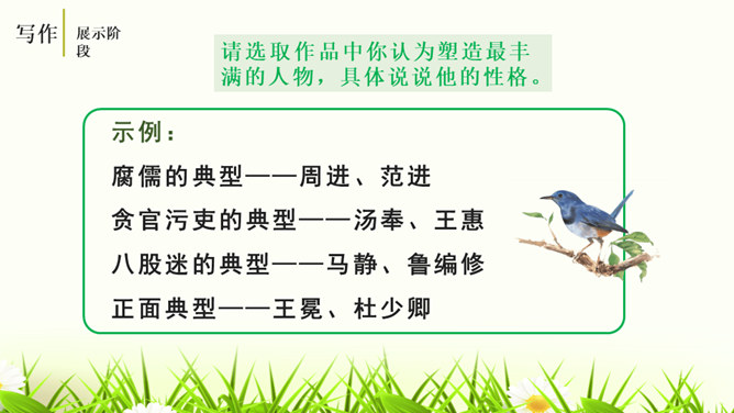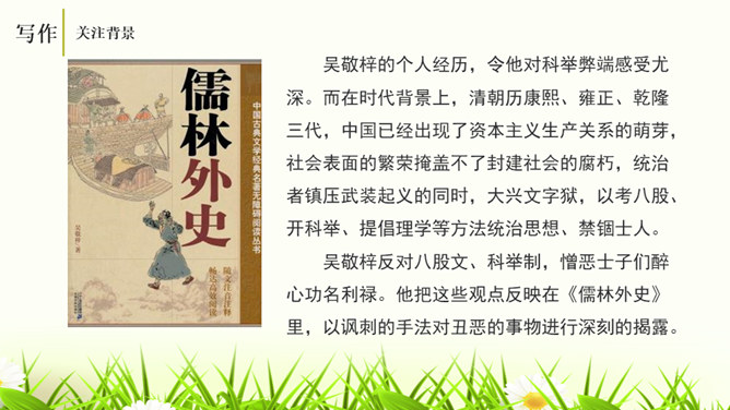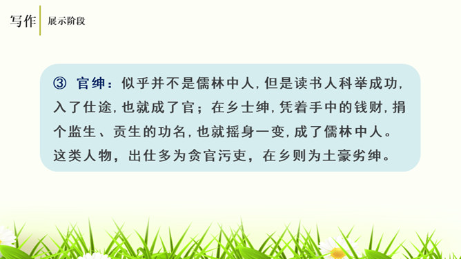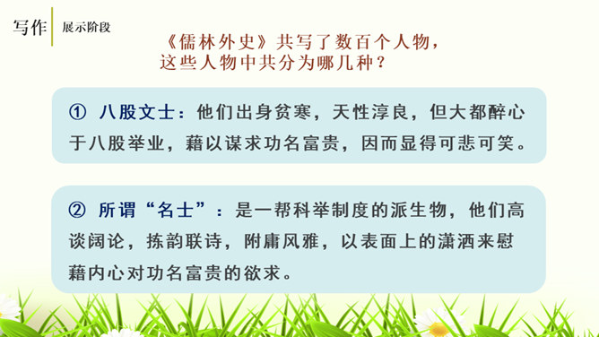 《儒林外史》共写了数百个人物,这些人物中共分为哪几种?八股文士:他们出身贫寒,天性淳良,但大都醉心于八股举业,藉以谋求功名富贵,因而显得可悲可笑。所谓“名士”:是一帮科举制度的派生物,他们高谈阔论,拣韵联诗,附庸风雅,以表面上的潇洒来慰藉内心对功名富贵的欲求。官绅:似乎并不是儒林中人,但是读书人科举成功,入了仕途,也就成了官;在乡士绅,凭着手中的钱财,捐个监生、贡生的功名,也就摇身一变,成了儒林中人。这类人物,出仕多为贪官污吏,在乡则为土豪劣绅。所属专题:儒林外史ppt。