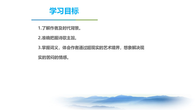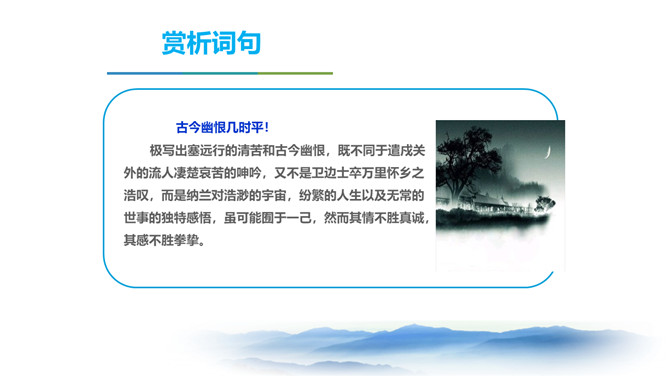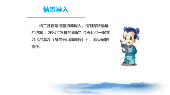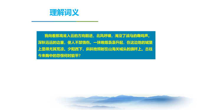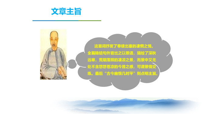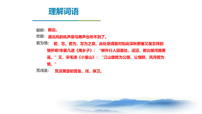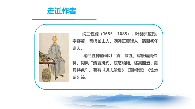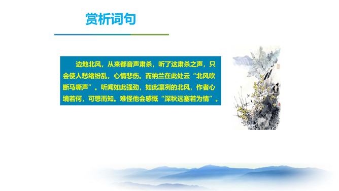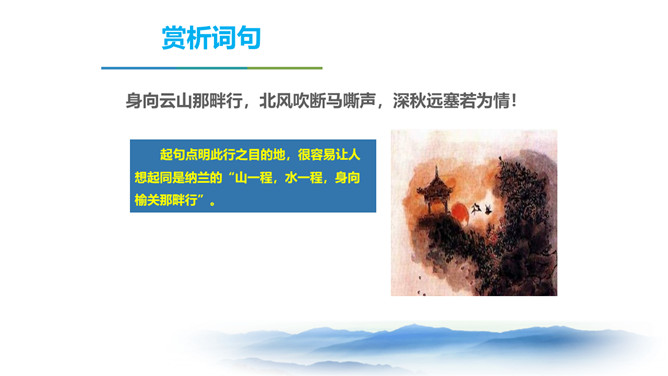 纳兰性德是清朝初年词人,面对深秋远远的边塞 ,发出了怎样的感叹?今天我们一起学习,感受词的情怀。1.了解作者及时代背景。2.准确把握诗歌主旨。3.掌握词义,体会作者通过超现实的艺术境界,想象解决现实的苦闷的情感。起句点明此行之目的地,很容易让人想起同是纳兰的“山一程,水一程,身向榆关那畔行”。边地北风,从来都音声肃杀,听了这肃杀之声,只会使人愁绪纷乱,心情悲伤。而纳兰在此处云“北风吹断马嘶声”。听闻如此强劲,如此凛冽的北风,作者心境若何,可想而知。难怪他会感慨“深秋远塞若为情”。所属专题:浣溪沙·身向云山那畔行ppt。