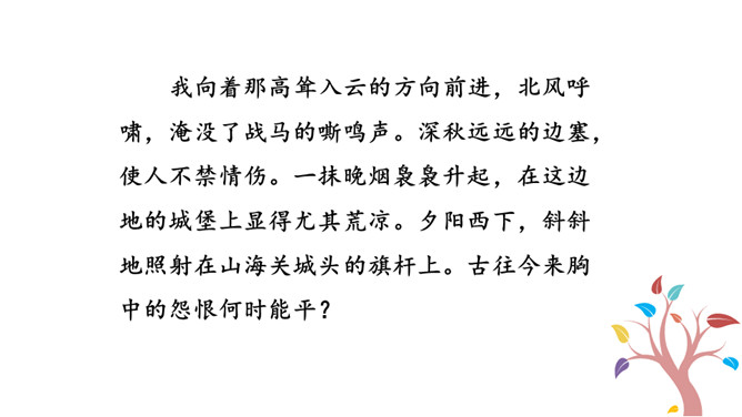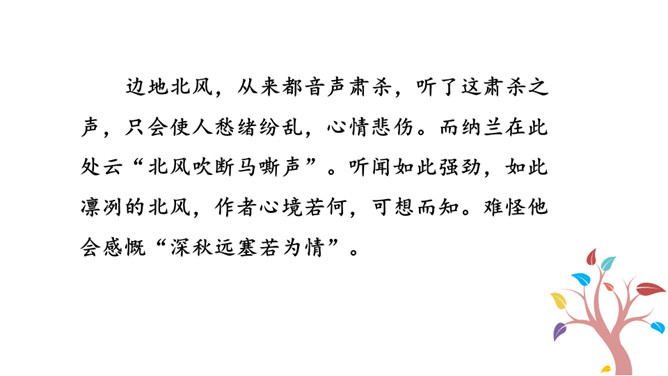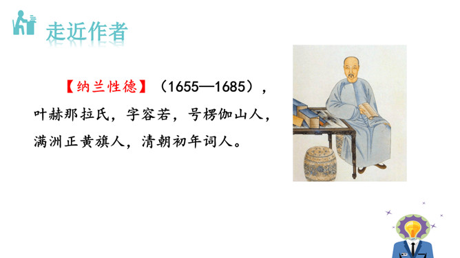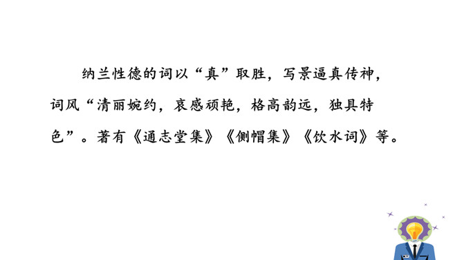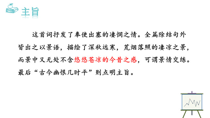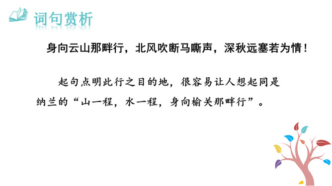 1.能够把握词的内容,赏析词语言。2.能够体会词人深沉的思想感情。极写出塞远行的清苦和古今幽恨,既不同于遣戍关外的流人凄楚哀苦的呻吟,又不是卫边士卒万里怀乡之浩叹,而是纳兰对浩渺的宇宙,纷繁的人生以及无常的世事的独特感悟,虽可能囿于一己,然而其情不胜真诚,其感不胜拳挚。这首词抒发了奉使出塞的凄惘之情。全篇除结句外皆出之以景语,描绘了深秋远寒,荒烟落照的凄凉之景,而景中又无处不含悠悠苍凉的今昔之感,可谓景情交练。最后“古今幽恨几时平”则点明主旨。所属专题:浣溪沙·身向云山那畔行ppt。
