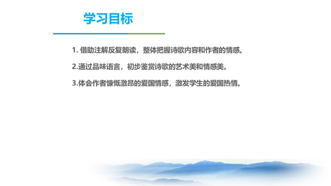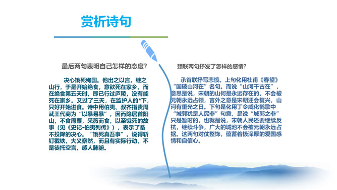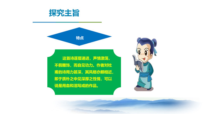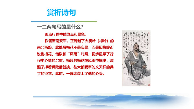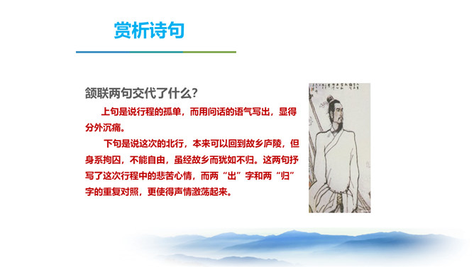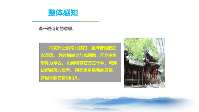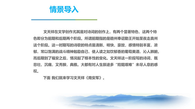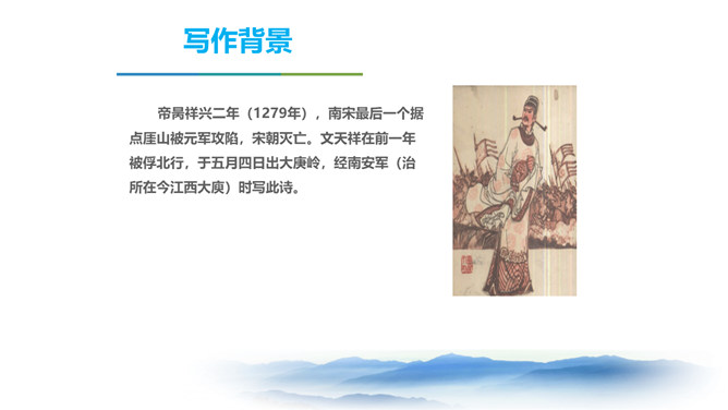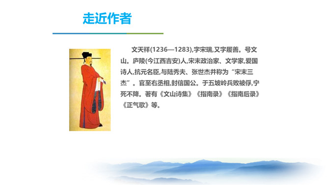 文天祥在文学创作尤其是对诗词的创作上,有两个显著特色,这两个特色即分为前期和后期两个阶段。所谓前期指的是赣州奉诏勤王开始至夜走真州这个阶段。这一时期写的诗歌的特点是清新、明快、豪放,感情特别丰富,浓郁,常以饱满的战斗精神勉励自己,使人读之如饮郁香的葡萄美酒,沁人肺腑。而后期到了福安之后,情况起了根本性的变化。文天祥这一阶段写的诗词,既悲壮、沉痛,又秀腴,典雅。大都有对人生旅途多“险阻艰难”未尽人意的感叹。借助注解反复朗读,整体把握诗歌内容和作者的情感。通过品味语言,初步鉴赏诗歌的艺术美和情感美。所属专题:南安军ppt。