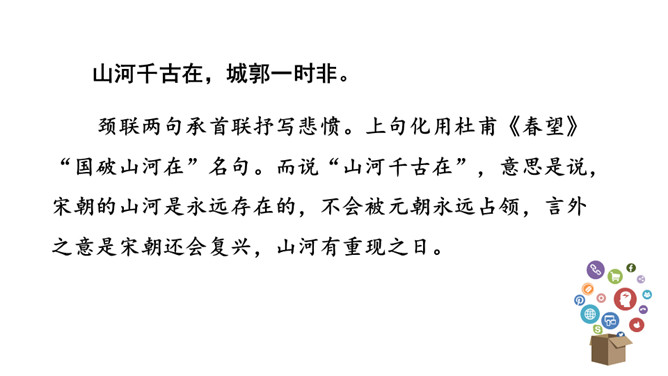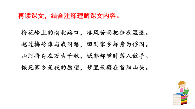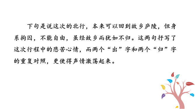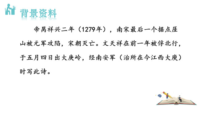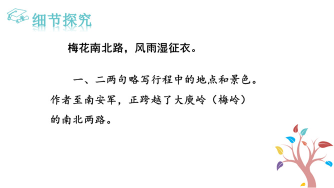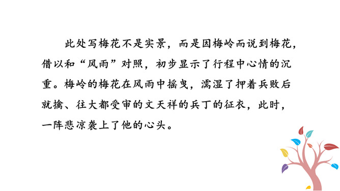 1.能够把握词的内容,赏析词语言。2.能够体会词人深沉的思想感情。一、二两句略写行程中的地点和景色。作者至南安军,正跨越了大庾岭(梅岭)的南北两路。此处写梅花不是实景,而是因梅岭而说到梅花,借以和“风雨”对照,初步显示了行程中心情的沉重。梅岭的梅花在风雨中摇曳,濡湿了押着兵败后就擒、往大都受审的文天祥的兵丁的征衣,此时,一阵悲凉袭上了他的心头。颔联两句,上句是说行程的孤单,而用问话的语气写出,显得分外沉痛。下句是说这次的北行,本来可以回到故乡庐陵,但身系拘囚,不能自由,虽经故乡而犹如不归。所属专题:南安军ppt。