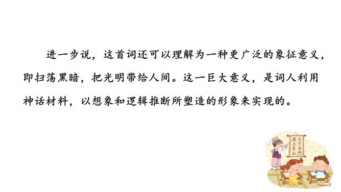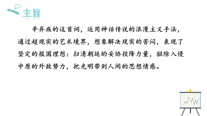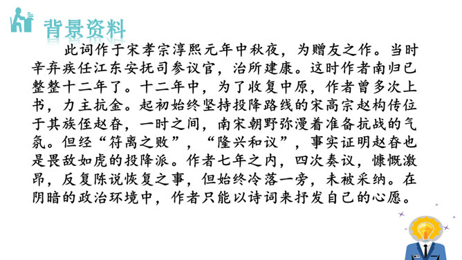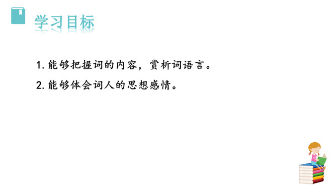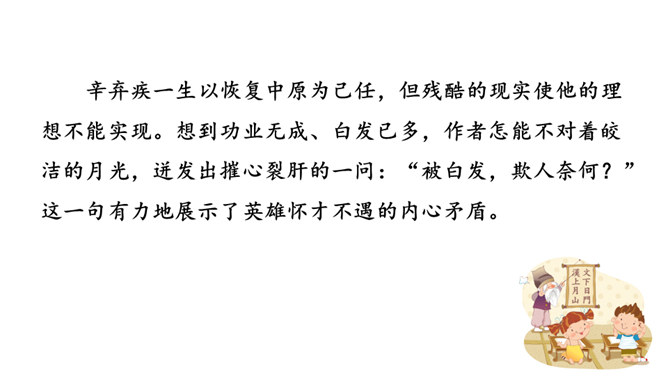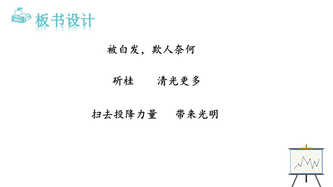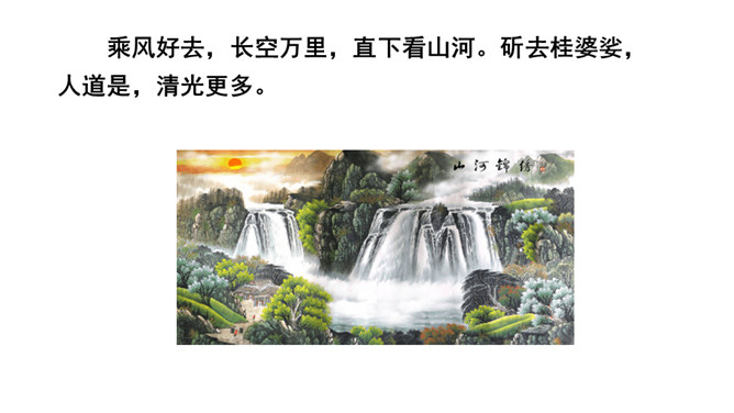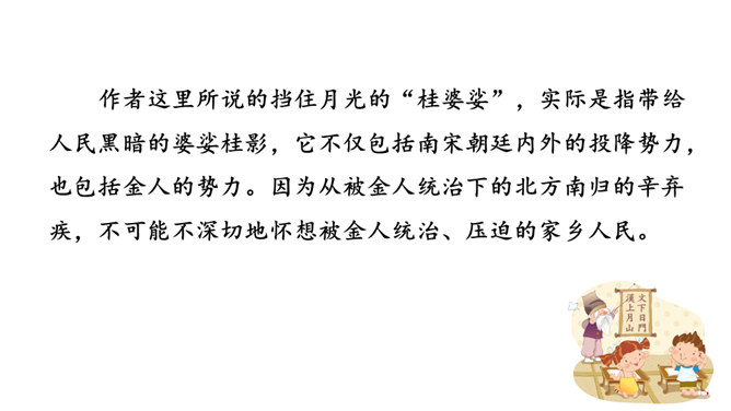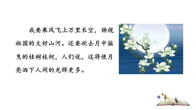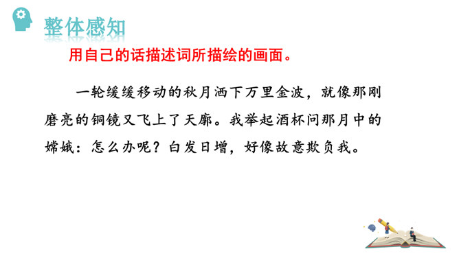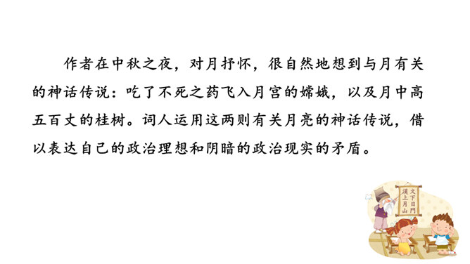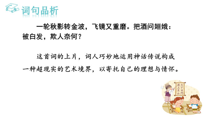 1.能够把握词的内容,赏析词语言。2.能够体会词人的思想感情。中秋之夜,月亮仿佛一面刚刚磨过的铜镜,月亮中的“桂树”婀娜婆娑,如此美妙的景致,作者却希望砍掉月中“桂树”,这到底是怎么回事呢?又寄寓了作者怎么样的情思呢?今天我们就一起去探寻一下!用自己的话描述词所描绘的画面。一轮缓缓移动的秋月洒下万里金波,就像那刚磨亮的铜镜又飞上了天廓。我举起酒杯问那月中的嫦娥:怎么办呢?白发日增,好像故意欺负我。我要乘风飞上万里长空,俯视祖国的大好山河。所属专题:太常引·建康中秋夜为吕叔潜赋ppt。