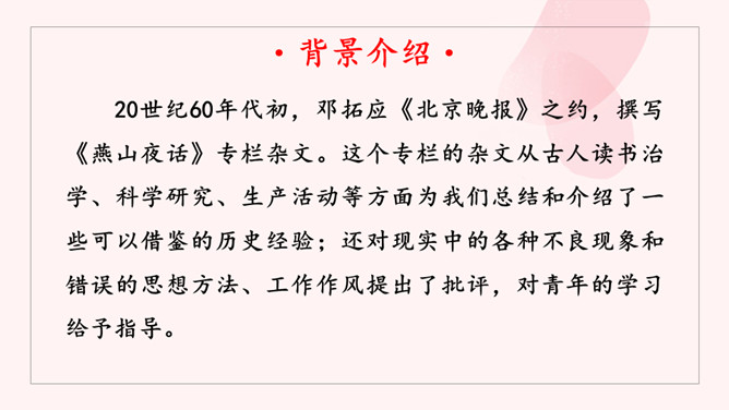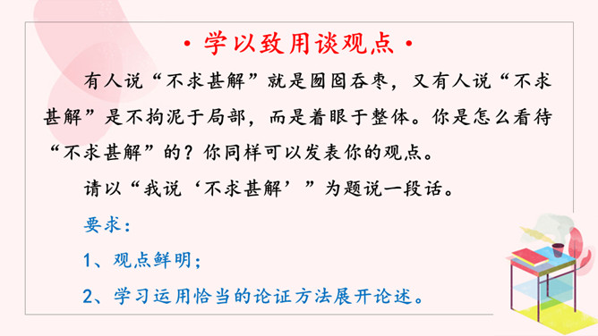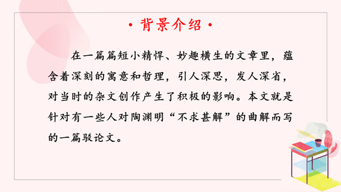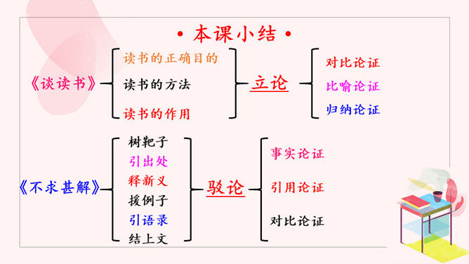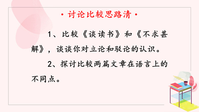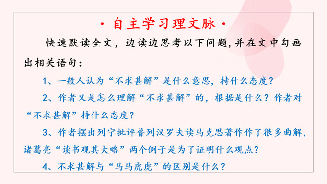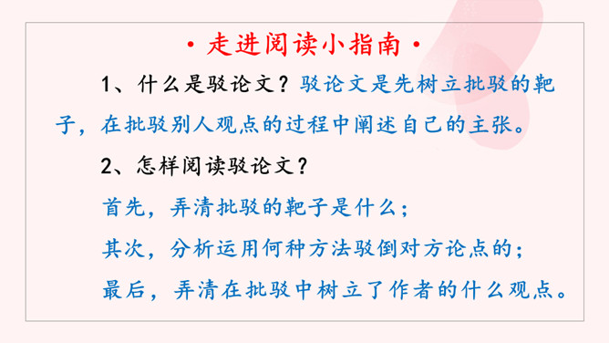 1、什么是驳论文?驳论文是先树立批驳的靶子,在批驳别人观点的过程中阐述自己的主张。2、怎样阅读驳论文?首先,弄清批驳的靶子是什么;其次,分析运用何种方法驳倒对方论点的;最后,弄清在批驳中树立了作者的什么观点。快速默读全文,边读边思考以下问题,并在文中勾画出相关语句:1、一般人认为“不求甚解”是什么意思,持什么态度?2、作者又是怎么理解“不求甚解”的,根据是什么?作者对“不求甚解”持什么态度?3、作者摆出列宁批评普列汉罗夫读马克思著作作了很多曲解,诸葛亮“读书观其大略”两个例子是为了证明什么观点?所属专题:不求甚解ppt。