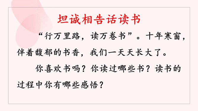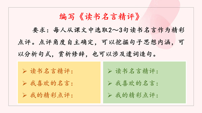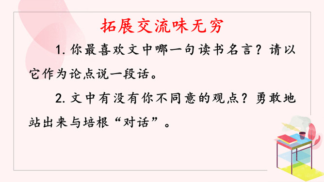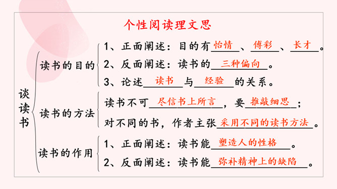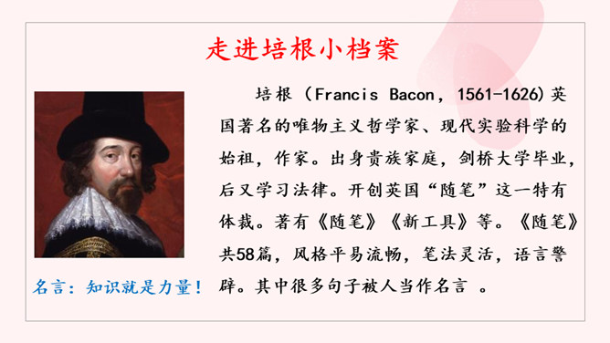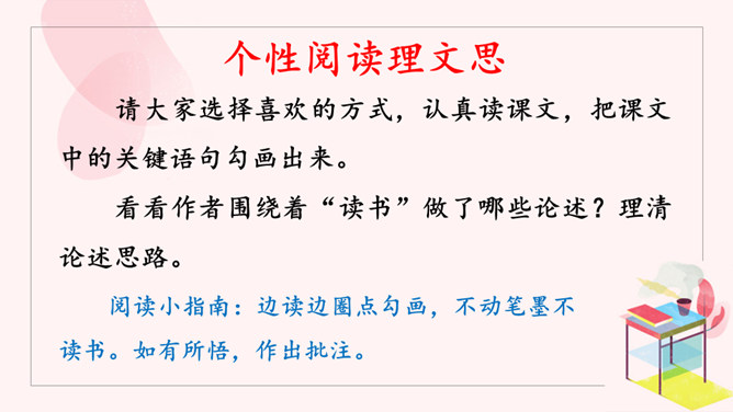 请大家选择喜欢的方式,认真读课文,把课文中的关键语句勾画出来。看看作者围绕着“读书”做了哪些论述?理清论述思路。阅读小指南:边读边圈点勾画,不动笔墨不读书。如有所悟,作出批注。培根是文艺复兴时期英国最著名的散文家,他的随笔富有诗意。雪莱曾赞叹说:“培根勋爵是一位诗人。”请同学们再读课文,把你认为可以作读书名言的句子标记出来,并品读。要求:每人从课文中选取2~3句读书名言作为精彩点评。点评角度自主确定,可以挖掘句子思想内涵,可以分析句式,赏析修辞,也可以涉及遣词造句。所属专题:谈读书ppt。
