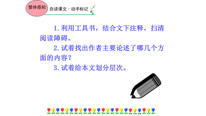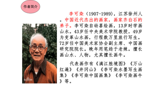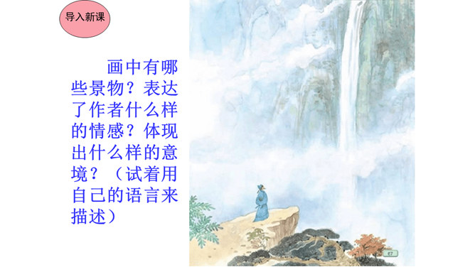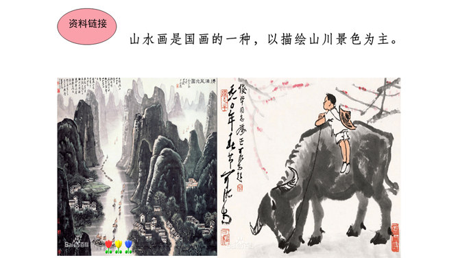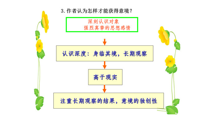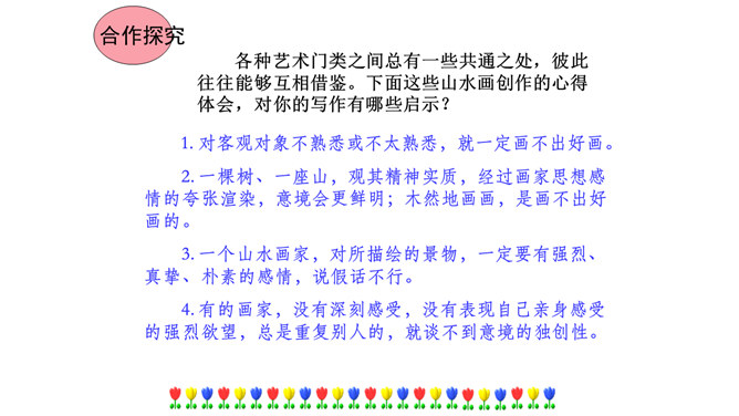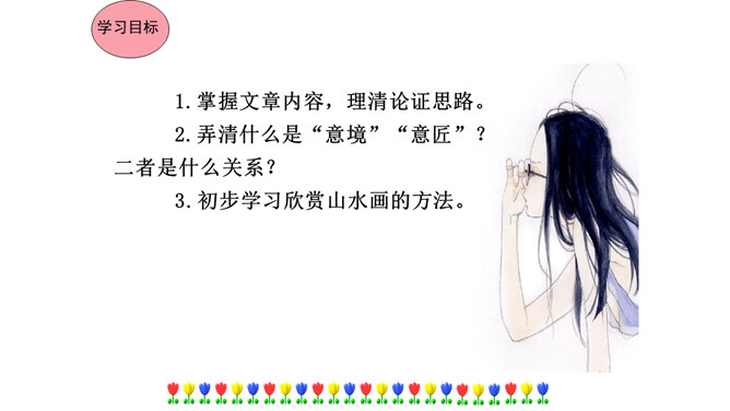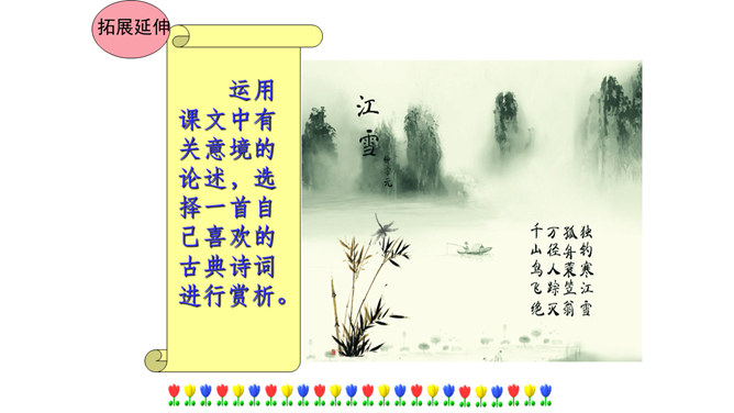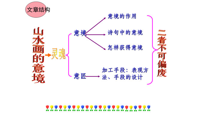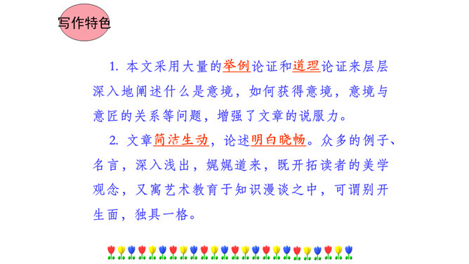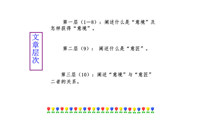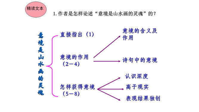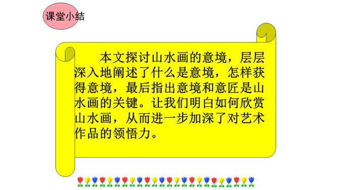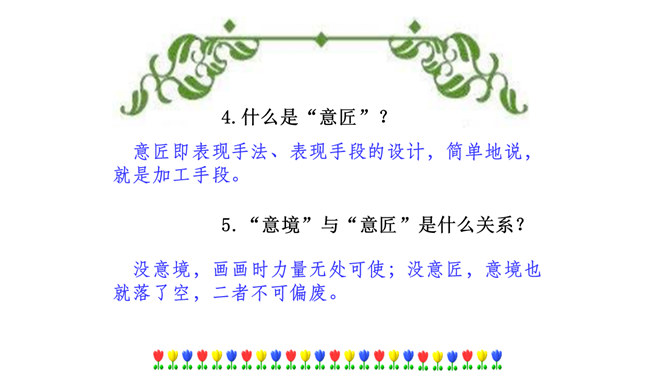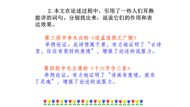 本文在论述过程中,引用了一些人们耳熟能详的词句。分别找出来,说说它们的作用和表达效果。第三段中李太白的《送孟浩然之广陵》举例论证。此诗情寓于景,有力地证明了“古诗里,往往有很好的意境”,增强了论述的说服力。第四段中毛主席的《十六字令三首》举例论证。有力地证明了“诗画有意境,就有了灵魂”,增强了论述的说服力。什么是“意匠”?意匠即表现手法、表现手段的设计,简单地说,就是加工手段。“意境”与“意匠”是什么关系?没意境,画画时力量无处可使;没意匠,意境也就落了空,二者不可偏废。所属专题:山水画的意境ppt。