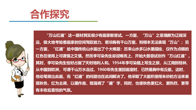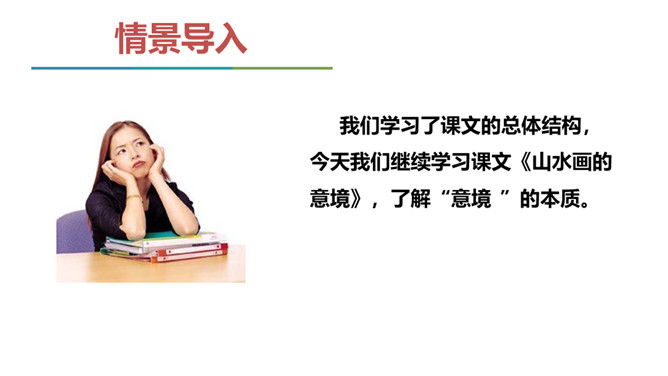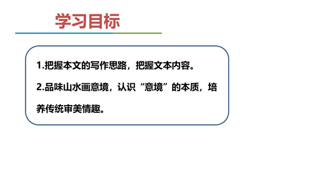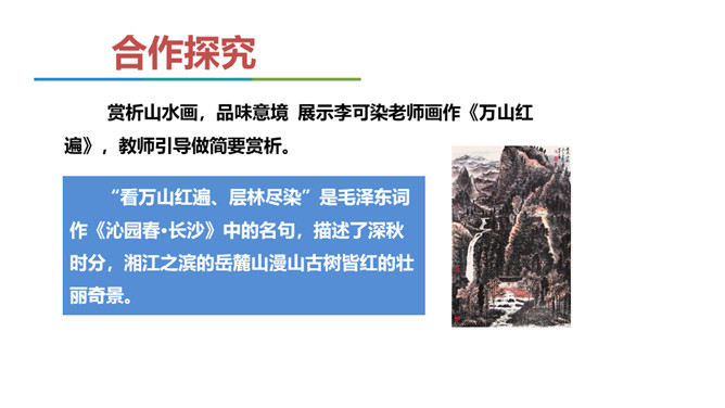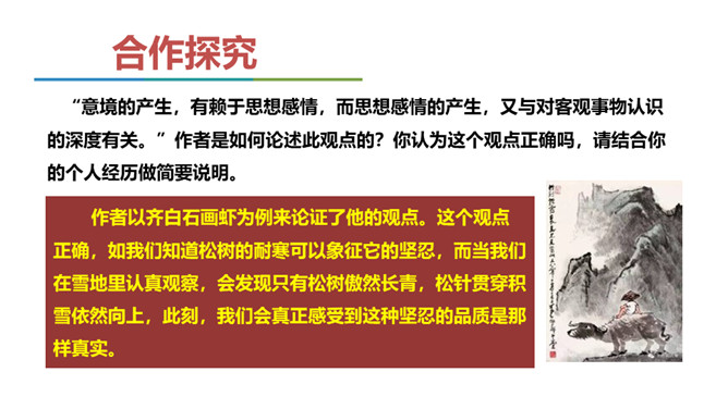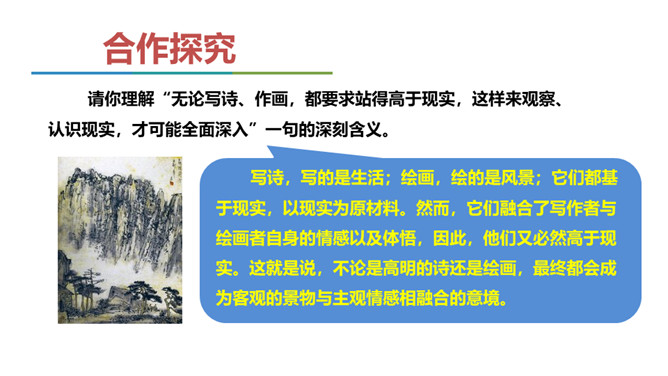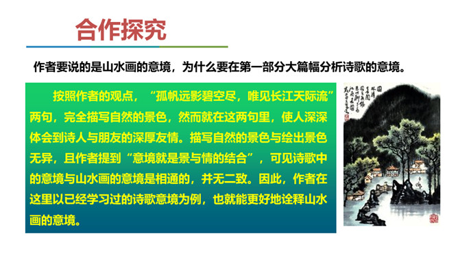 展示山水画图片与山水摄影图片。请同学们结合第一部分内容说说,在摄影技术如此发达的今天,山水画是否会被取代? 山水画不是地理、自然环境的说明和图解,其更重要的是表现人对自然的思想感情。可见,山水画具有其精神实质,这也就意味着它永不会为山水摄影所取代。作者要说的是山水画的意境,为什么要在第一部分大篇幅分析诗歌的意境。“意境的产生,有赖于思想感情,而思想感情的产生,又与对客观事物认识的深度有关。”作者是如何论述此观点的?你认为这个观点正确吗,请结合你的个人经历做简要说明。所属专题:山水画的意境ppt。