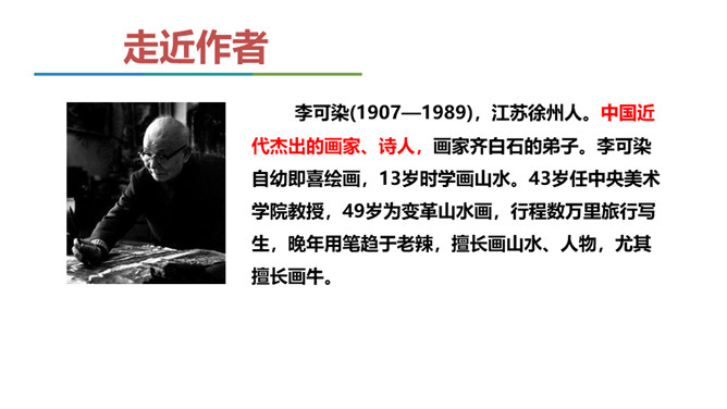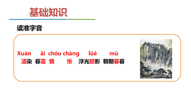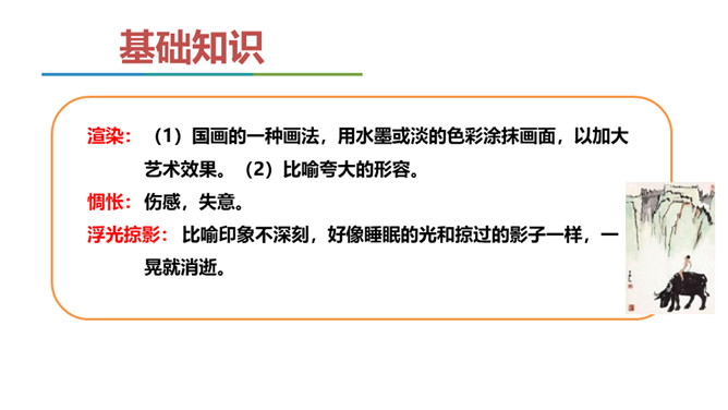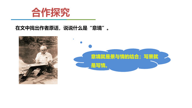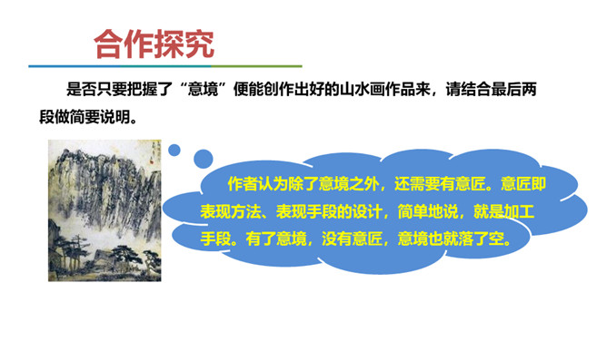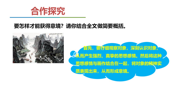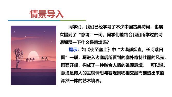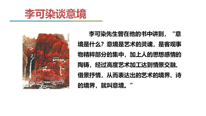 同学们,我们已经学习了不少中国古典诗词,也屡次提到了“意境”一词,能结合我们所学过的诗词解释一下什么是意境吗?如《使至塞上》中“大漠孤烟直,长河落日圆”一联,写进入边塞后所看到的塞外奇特壮丽的风光,画面开阔,构成了一种融合人情的雄浑意境。 可以说,意境是诗人的主观情思与客观景物相交融而创造出来的浑然一体的艺术境界。要怎样才能获得意境?请你结合全文做简要概括。首先,要仔细观察对象,深刻认识对象,从而产生强烈、真挚的思想感情。然后将这种思想感情与画作结合在一起,将对象的精神实质表现出来,从而形成意境。 所属专题:山水画的意境ppt。